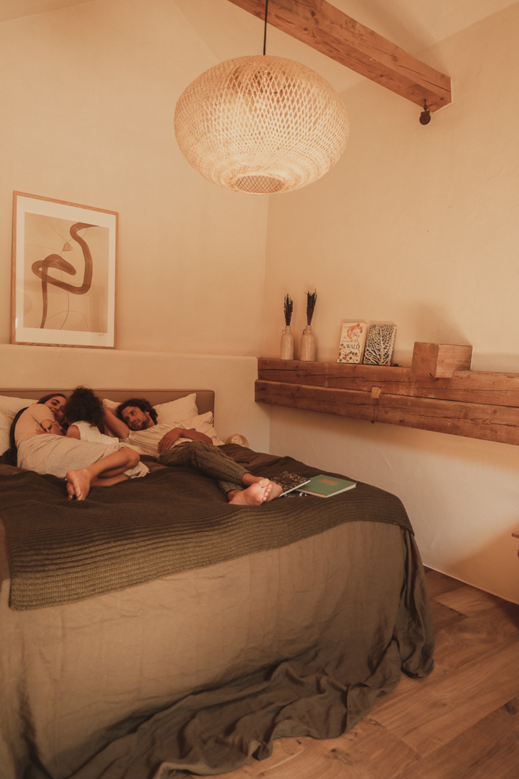 La Famiglia hat rund 80 Quadratmeter und ist ein Paradies für Familien mit Kindern. Für die hat der Schreiner im separaten Schlafzimmer liebevolle Bettnischen als Hochbett gefertigt, in denen es sich besonders kuschelig schläft. Im Hängestuhl, der am freitragenden Balken angebracht ist, lässt es sich meditativ schaukeln und im großen Doppelbett auf der Galerie mit Blick in die Sterne wunderbar träumen, selbst mit einem kleinen Beischläfer. Ideal für Familien mit bis zu vier Personen.