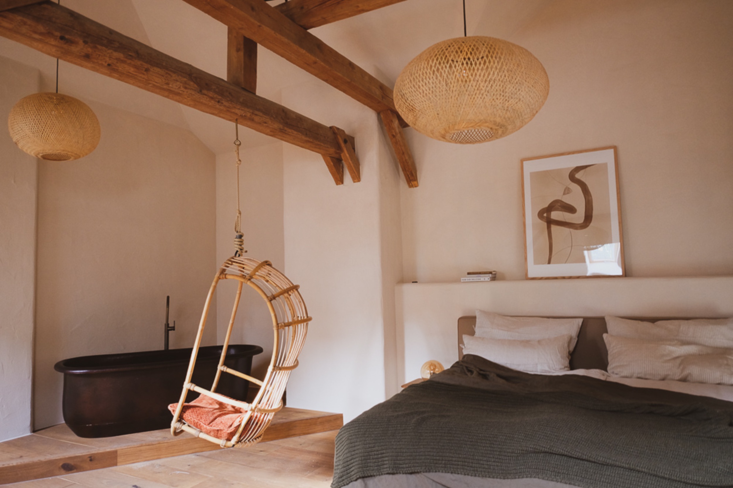 La Bella ist mit 68 Quadratmetern die kleinste der drei Wohnungen. Mit ihrem großen Doppelbett und dem gemütlichen Hängesessel auf der offenen Galerie ist sie perfekt für Pärchen, Freunde oder Freundinnen geeignet. Sie hat die höchsten Decken des ganzen Hauses und den kürzesten Weg zur Sauna.