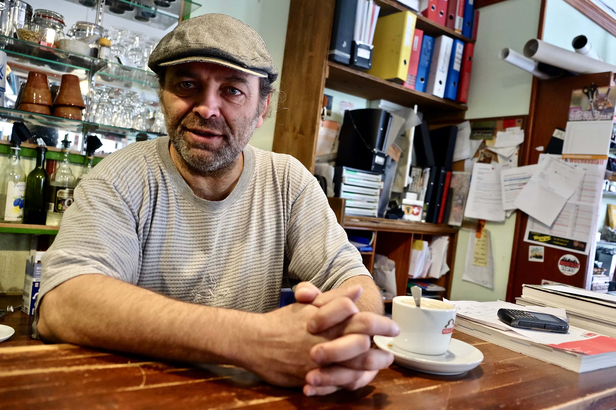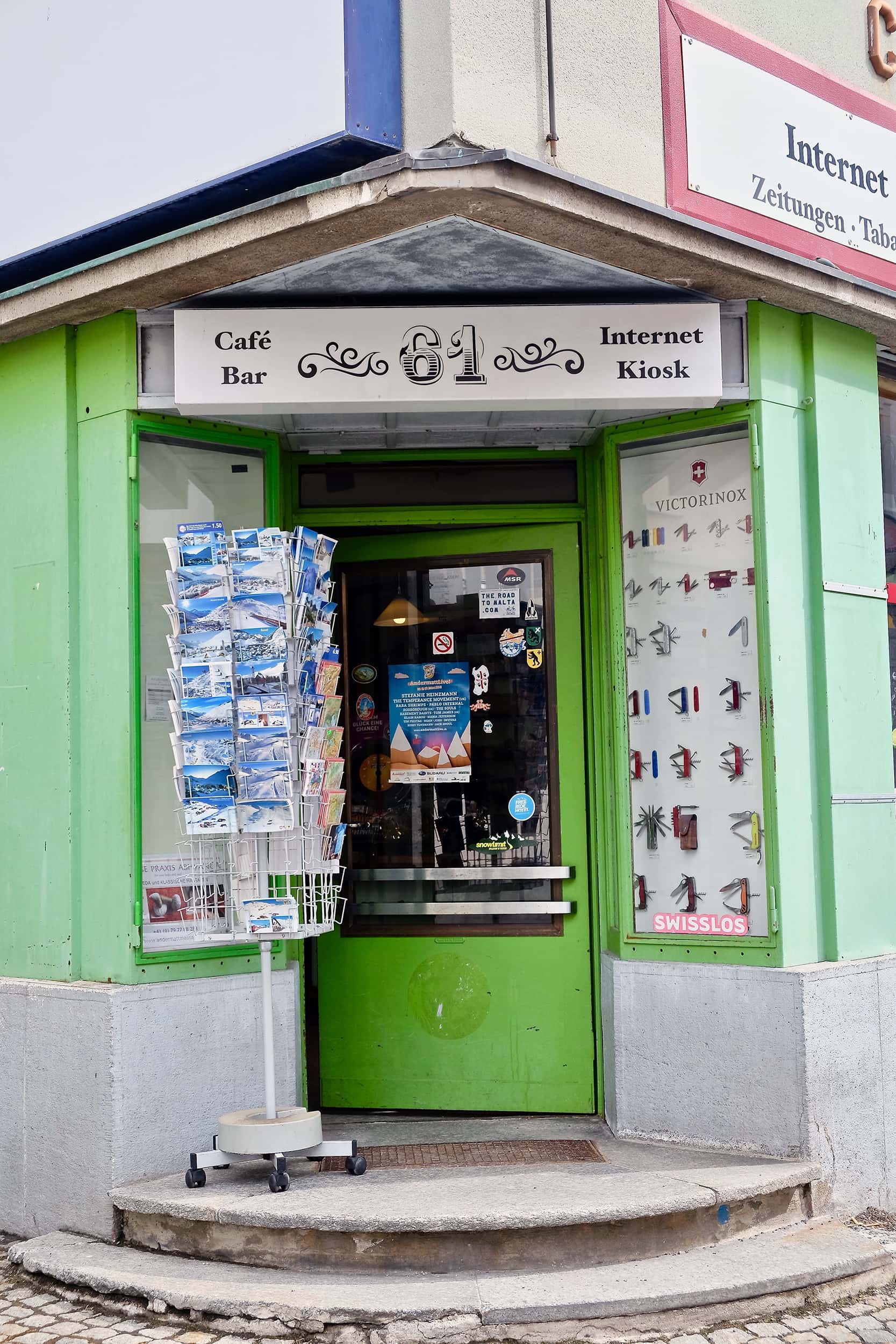 15 Jahre später ist Dan immer noch hier und lässt gemeinsam mit mir den genialen Skitag bei Bänz Simmen im Kiosk 61 ausklingen. Der Kiosk, eine Mischung aus Internet Cafe, Lottoannahmestelle, Bergkristallladen und Minibibliothek, ist Treffpunkt der lokalen Szene. Hier treffen sich Bergführer, Skibums, Touristen und Einheimische gleichermaßen, auf einen Kaffee, ein Bier oder einen selber gemachten Ingwer Zitronen Tee. Bänz ist ein Andermatter Urgestein, schweizer Snowboard-Pionier, Historiker, Kristallschürfer, Abenteurer, Weltenbummler und Menschenfreund. Er ist ein wandelndes, schweizerisches Geschichtsbuch, weiß viel über Geologie und Wetter, liebt Flora und Fauna und gibt sein Wissen gerne an Gäste weiter, für die er Führungen zu verschiedenen Themen anbietet, im Winter auch mit Schneeschuhen.