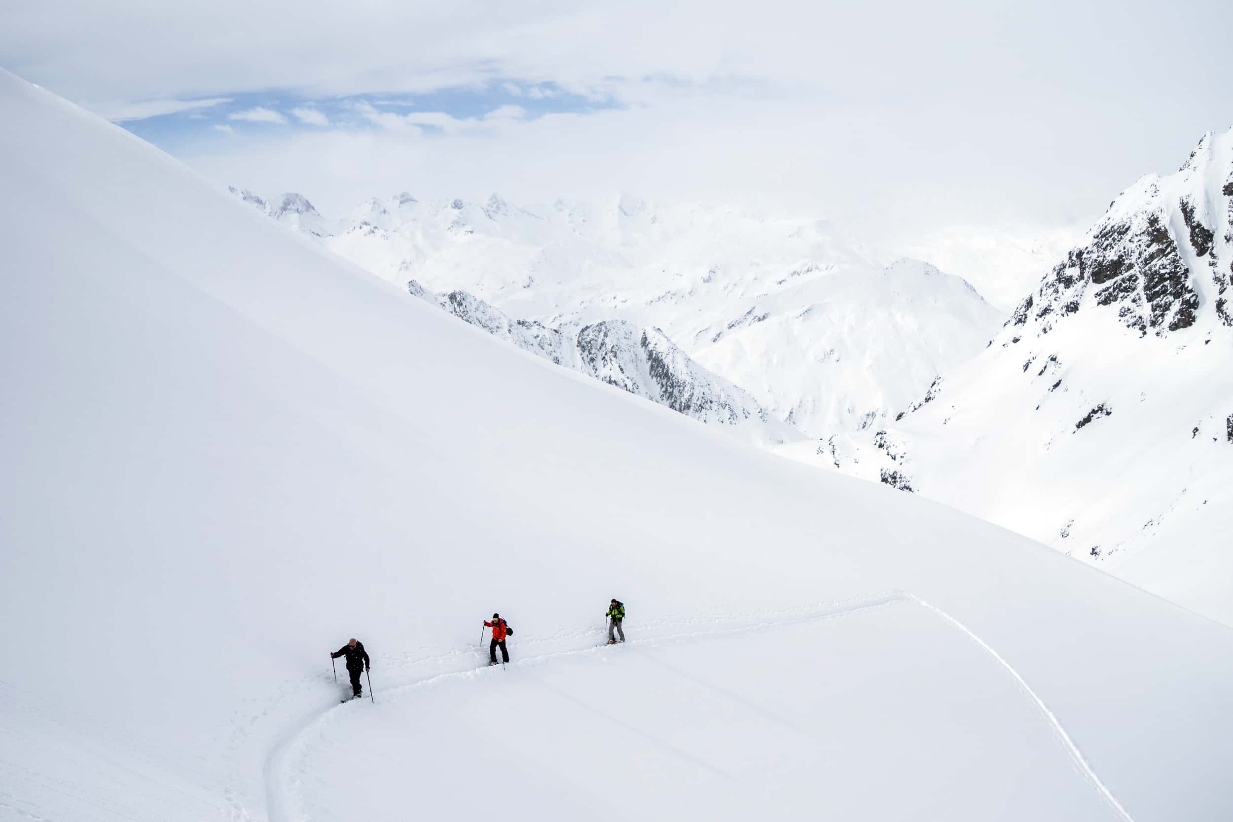 Noch spannender und vielfältiger wird es, so Dan, wenn man ein paar Meter mit Fellen aufsteigt und die dahinter und seitlich gelegenen Gipfel und Täler erkundet. Eine tief verschneite Winterlandschaft. Der Regen unten im Tal hat sich hier oben als luftig feines, weißes Gold abgelegt. Die Bedingungen könnten kaum besser sein. Dan zeigt mir seinen Hausberg, den er in und auswendig kennt. Wir fahren Klassiker wie die Giraffe, Hans im Glück und das Monkey Couloir mit der Schweden Traverse. Was alle Abfahrten mehr oder weniger gemein haben ist, dass man bei jedem Run 1.500 Höhenmeter vernichtet in einem unglaublich vielfältigen Gelände, in dem sich weite und offene Hänge mit kupiertem felsigen Gelände und steilen Rinnen abwechseln. Durch die meist nord- und ostseitige Ausrichtung bleibt der Schnee lange pulvrig. Ein grandioser Spielplatz für Freunde des Abseitsfahrens.