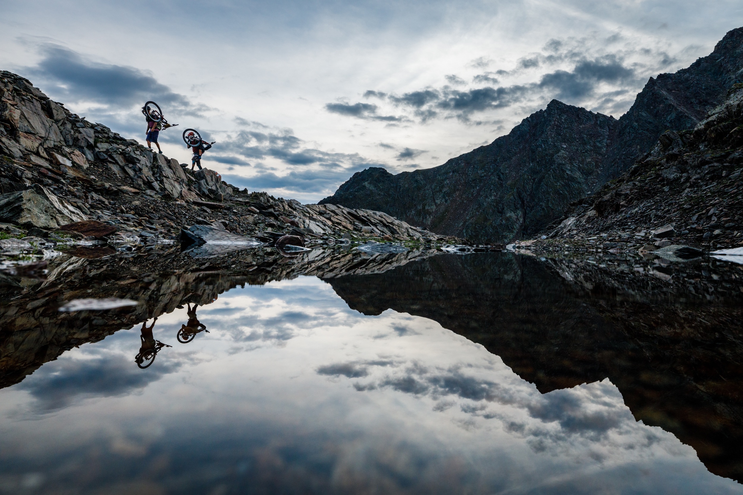 Unabhängig davon stehen wir ziemlich bald vor einem ganz anderen Problem. Umbauarbeiten an den Stauseen haben das Kühtai in eine einzige Großbaustelle verwandelt und unser geplanter Weg ist bereits dem Bagger zum Opfer gefallen beziehungsweise von großflächigen Hangsicherungsnetzen bedeckt. Mit Mountainbike-Schuhen und einem Bike am Buckel gar nicht mal so toll zum Steigen… Wir helfen uns gegenseitig mit den Bikes über die künstlichen Hindernisse und als es zu dämmern beginnt sind wir endlich am Ende des Sees angelangt. Ab hier heißt es dann endgültig: „Wer sein Rad liebt, der schiebt!“ oder in unserem Fall „Stell keine Fragen, fang an zu Tragen.“