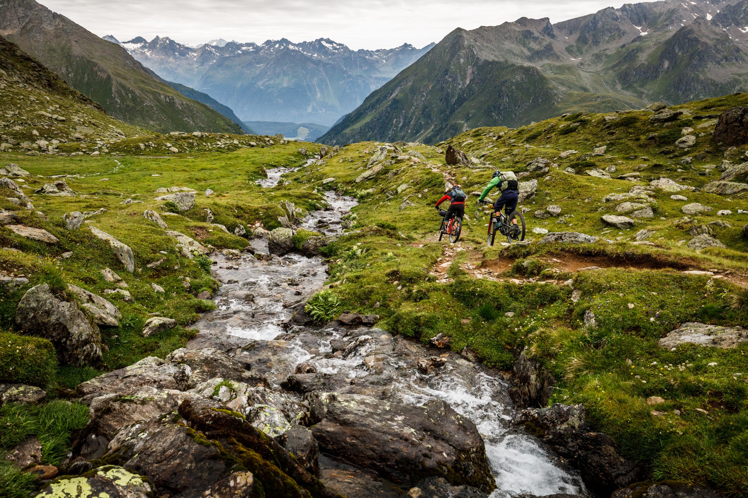 Der Trail ins Pitztal dagegen ist eher wieder zornigen Temperaments: Steinplatten, hohe Stufen, enge Kehren mit wenig Platz, loser Untergrund – all das wäre ja eigentlich eine schöne Herausforderung mit dem Mountainbike, aber eben nicht mit zusätzlich Schnee, der Bremsen stellenweise fast unmöglich macht. So gestaltet sich die Abfahrt, bei der ich das Gefühl habe mehr Passagier als Pilot zu sein, als wilder Rodeo Ritt, doch die Bruchlandung bleibt glücklicherweise aus.