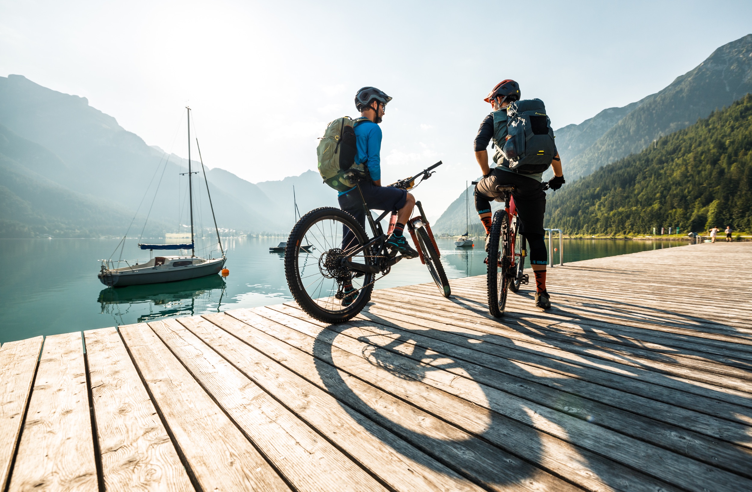 7 Uhr. Mit dem Auto shutteln wir zum Ausgangspunkt der Tour am Westufer des Achensees, von wo aus wir uns auf direktem Weg in den den wahrscheinlich ursprünglichsten Gebirgszug Tirols, den Karwendel machen. Die Beine sind dankbar über die ersten flach verlaufenden Meter vom See weg, sind doch unsere Bikes und Rucksäcke mit Ausrüstung und Gepäck für mehrere Tage bepackt und merklich schwerer als gewohnt. Im Anstieg zum Plumsjoch verschwindet der glitzernde „Tiroler Fjord“ bald aus unserem Blickfeld und es geht zügig bergauf. Die Rampen wandeln sich erstaunlich schnell von zahm zu zornig, der Untergrund wird zusehends lose und die Sonne brennt uns bei über 30 Grad unbarmherzig in den Nacken. Willkommen zum Sufferfest! Als wir den Sattel erreichen steht es eindeutig eins zu null. Nicht für uns, denn früher oder später musste hier jeder das Bike schieben.