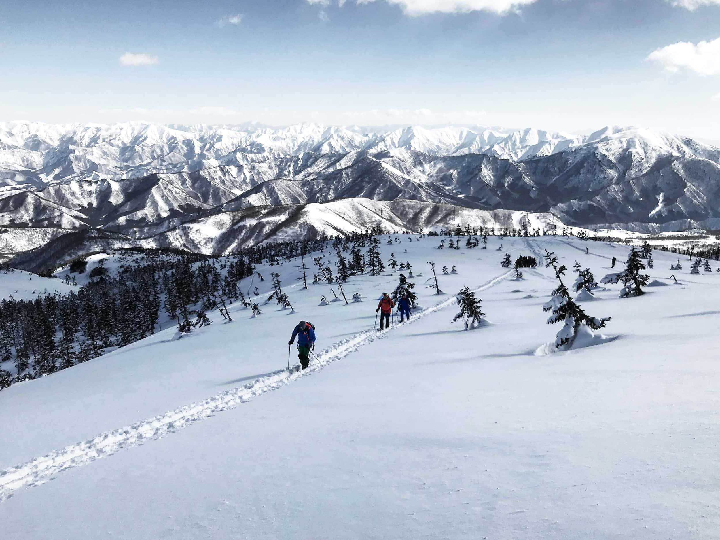 Hakuba ist der am meisten touristische und westlich geprägte Ort auf unserem Trip, aber auch der mit dem beeindruckendsten Gelände. Das stellen wir am letzten Tag unseres Trips fest, als wir in Happo One mit den Liften bis ganz nach oben fahren, um dann am Grat noch ein Stück weiter aufzusteigen und schließlich den Nordhang abzufahren. Die Runde steht Freeride Abfahrten in den Alpen in Punkto Gelände und Ausblick in nichts nach. Zurück geht es mit dem Taxi, dass uns ein japanischer Freerider freundlicherweise gerufen hat.