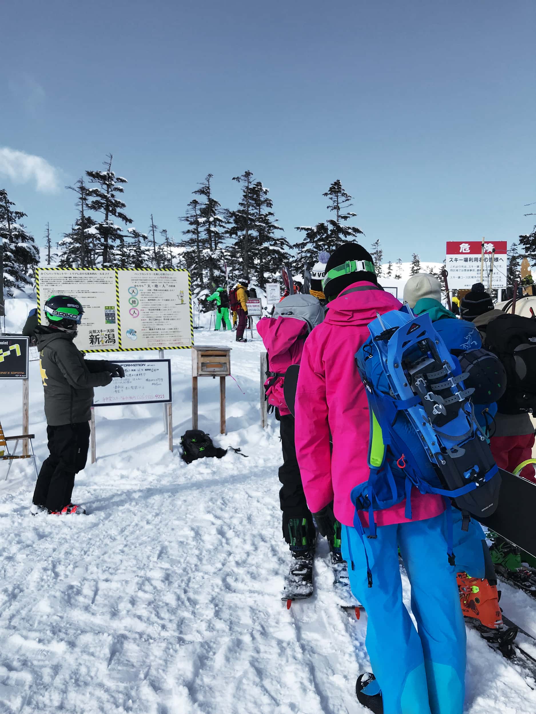 Während in Naeba Freerider nicht gerne gesehen sind, dürfen sie sich im per Gondel oder mit dem Auto in einer Viertelstunde erreichbaren Kagura Ski Resort austoben. Den Tipp dafür bekamen wir vom schwedischen Snowboarder Jimmy Holmgren, den wir im Mikuni Cat kennenlernten. Er lebt schon seit mehreren Jahren in Japan, arbeitet als Guide und zieht die Gegend um Yuzawa und die Skigebiete auf der Hauptinsel dem seiner Meinung nach überlaufenen Hokkaido eindeutig vor: Billiger, weniger Kommerz, weniger Australier, mehr ursprüngliches Japan und steileres Gelände! Von der Mitsumata Gondel aus gelangt man mit mehreren Gondeln und Sesselliften ans Ende des Skigebiets, muss am Gate Namen, Adresse und Kontaktdaten hinterlassen, dem japanischen Bergwachtler umständlich mit Händen und Füßen erklären, wo man in etwa hin möchte, versichern, dass man sich am Abend zurückmeldet und den Besitz eines funktionierenden LVS Geräts nachweisen. So erwirbt man die Eintrittskarte fürs Backcountry.