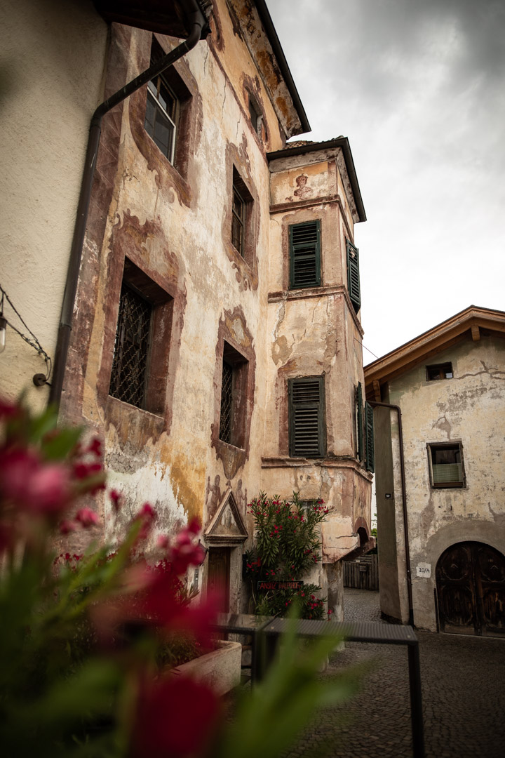 Zuerst gings auf einem Perlacher-Forst-ähnlichen Radl-Highway mit entsprechendem Publikum an der Etsch entlang von Meran Richtung Bozen. Nach ein paar Kilometern führt uns die Route weg vom Radweg und durch Dörfer zum Eingang des Sarntals – Ausblick auf den Rosengarten inklusive. Sonst gibt sich das Sarntal aber aus Rennradler*innen-Perspektive erst nicht sonderlich einladend, muss man doch zu Beginn gleich mal mehrere Tunnel hinter sich bringen, für die man im Idealfall ein Licht eingesteckt hat oder eine Freundin dabei, die einem eins leiht. Von der Sarner Schlucht und den zahlreichen Burgen, die sie zieren, bekommt man in der Röhre leider kaum etwas zu sehen.