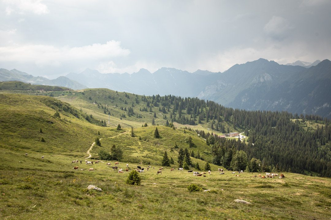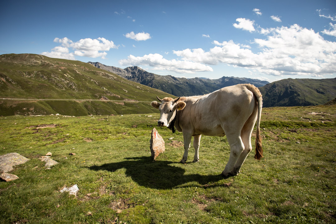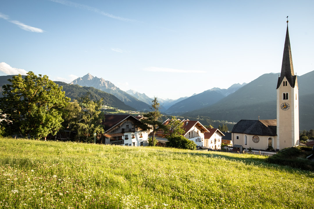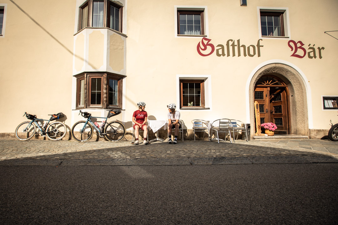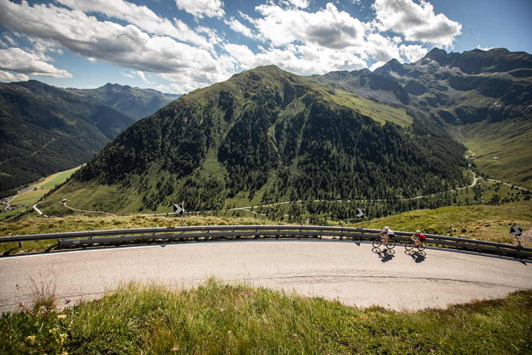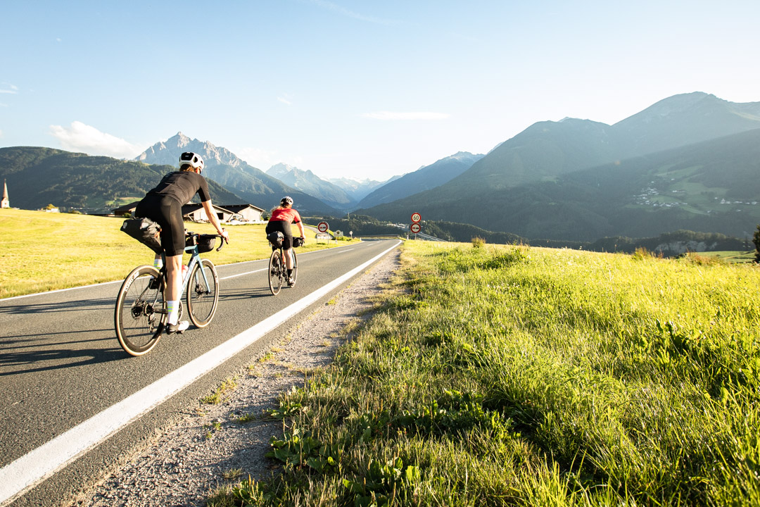 Sonnenuntergang, Stubaiblick, Schnitzel, Stechmücken – so lässt sich unser Abend in Patsch nach knapp 150 Kilometern und 1.400 Höhenmetern zusammenfassen. Ich hänge noch bis spät in der Nacht am Handy, weil ich wie immer zwei, drei Dinge für die Arbeit erledigen muss und finde auch danach keinen Schlaf. Warum? Keine Ahnung. Normalerweise bin ich nach spätestens drei Minuten gespannte Zuschauerin meines eigenen Traumfillms, doch ausgerechnet heute liege ich die ganze Nacht wach. Der Gedanke daran, dass ich morgen fit sein sollte, macht es leider kein Stück besser. Um sieben klingelt überflüssigerweise der Wecker und wir wissen, dass wir heute ein bisschen auf die Tube drücken müssen. Es soll der heißeste Tag des bisherigen Sommers werden, gegen 15 Uhr ist am Jaufenpass Gewitter gemeldet. Wir haben 120 Kilometer und knapp 2.000 Höhenmeter vor uns.