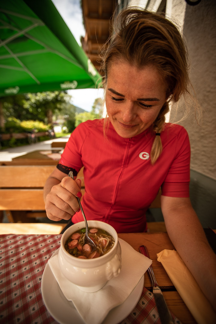 In Achenkirch haben wir nach 86 Kilometern mehr als die Hälfte unserer heutigen Strecke hinter uns und genehmigen uns eine größere Pause. Meike bestellt „Pommes-Salat“, also Salat und Pommes und ich eine Suppe – mit der Ernährung auf langen Touren bekomme ich schnell Probleme, mein Magen rebelliert gern mal. Beim Essen diskutieren wir darüber, ob wir in den See hüpfen wollen oder nicht. Doch wir sind zu bequem uns aus unseren Rennradklamotten zu pellen und viel schlimmer noch, nach dem Bad die angeschwitzten Sachen wieder über die dann immer noch feuchte Haut zu ziehen. Speziell die Vorstellung die Socken aus und wieder anzuziehen erscheint uns beiden nicht besonders verlockend.