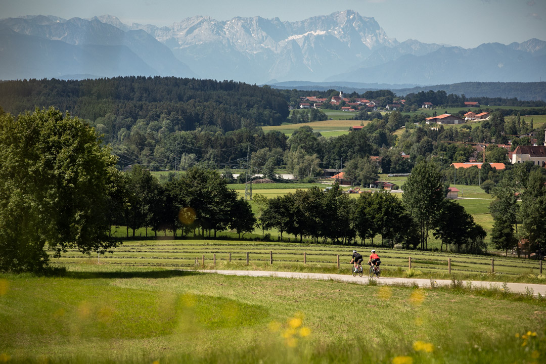 Um volle Straßen zu vermeiden, starten wir an einem Donnerstag kurz nach zehn Richtung Grünwald. Weil im Perlacher Forst gerade ein neuer Radel-Highway entsteht, müssen wir die ersten Kilometer der Tour kurzfristig ein bisschen umplanen. Der guten Fernsicht wegen bauen wir noch einen der berühmtesten Rennrad-Spots südlich von München ein, die Ludwigshöhe. Auch wenn uns unser GPS Gerät mit der auf Komoot geplante Route eigentlich daran vorbei führen will, glauben wir, dass wir die wenigen zusätzlichen Höhenmeter durchaus in den Beinen haben. Weiter geht es Richtung Bad Tölz, von dort vor allem auf Fahrradwegen die ersten wirklichen Höhenmeter hinauf zum Sylvensteinspeicher. Dort machen wir eine kurze Pause: Um Fotos zu machen, Riegel zu essen und Hunde zu streicheln. Auf den ersten 60 Kilometern lief es ziemlich gut – den größten Teil der Tour haben wir aber immer noch vor uns. Wir radeln weiter zum Achensee und nehmen gegen den Willen unseres GPS-Geräts einen Radlweg, der sich nach kurzer Zeit prompt als Schotterpiste entpuppt, aber das soll unser größtes Problem heute bleiben.