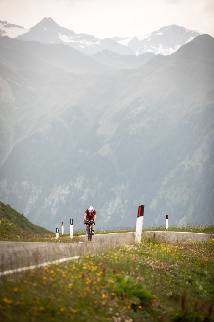 Dann geht es hinauf, knapp 1.200 Höhenmeter auf 15 Kilometern erwarten uns. Ich bin ziemlich froh, dass ich meinem Rennrad noch eine bergtauglichere Übersetzung verpasst habe, trotzdem dödel ich die meiste Zeit im niedrigsten Gang herum. Ich spüre den fehlenden Schlaf, mein Magen grummelt und irgendwie wirkt sich diese Kombi negativ auf meinen unteren Rücken aus. Von meiner Psyche mal ganz zu schweigen. Warum stopf ich mein Leben immer so voll? Warum kann ich nicht mal vom Gas gehen? Und wie wenig überraschend ist es eigentlich, dass es mich dann an den Anstiegen – den realen und den metaphorischen – zerbröselt!? Naja, nach einer kurzen Pause, die ich mir am Straßenrand genehmige, kommt er dann glücklicherweise aber doch, der Moment, in dem sich der Kopf abschaltet und ich nur noch vor mich hinfahre. Sind wir mal ehrlich, zu viel Ausdauersport macht einen zum Weirdo, oder? Ich beginne jedenfalls mit mir selbst zu sprechen und meine Schaltvorgänge zu kommentieren – „schalt ich mal eins hoch, ah ne doch nich, war vorher besser, wieder zurück.“ Lange bleibt der Kopf aber leider nicht offline, denn das vorausgesagte Gewitter kündigt sich an. Viel vom Himmel sehe ich zwar nicht, nur den Streifen direkt über der Passstraße, der nicht von den sie säumenden Bäumen verdeckt wird. Doch dieser kleine Ausschnitt verspricht nichts gutes.