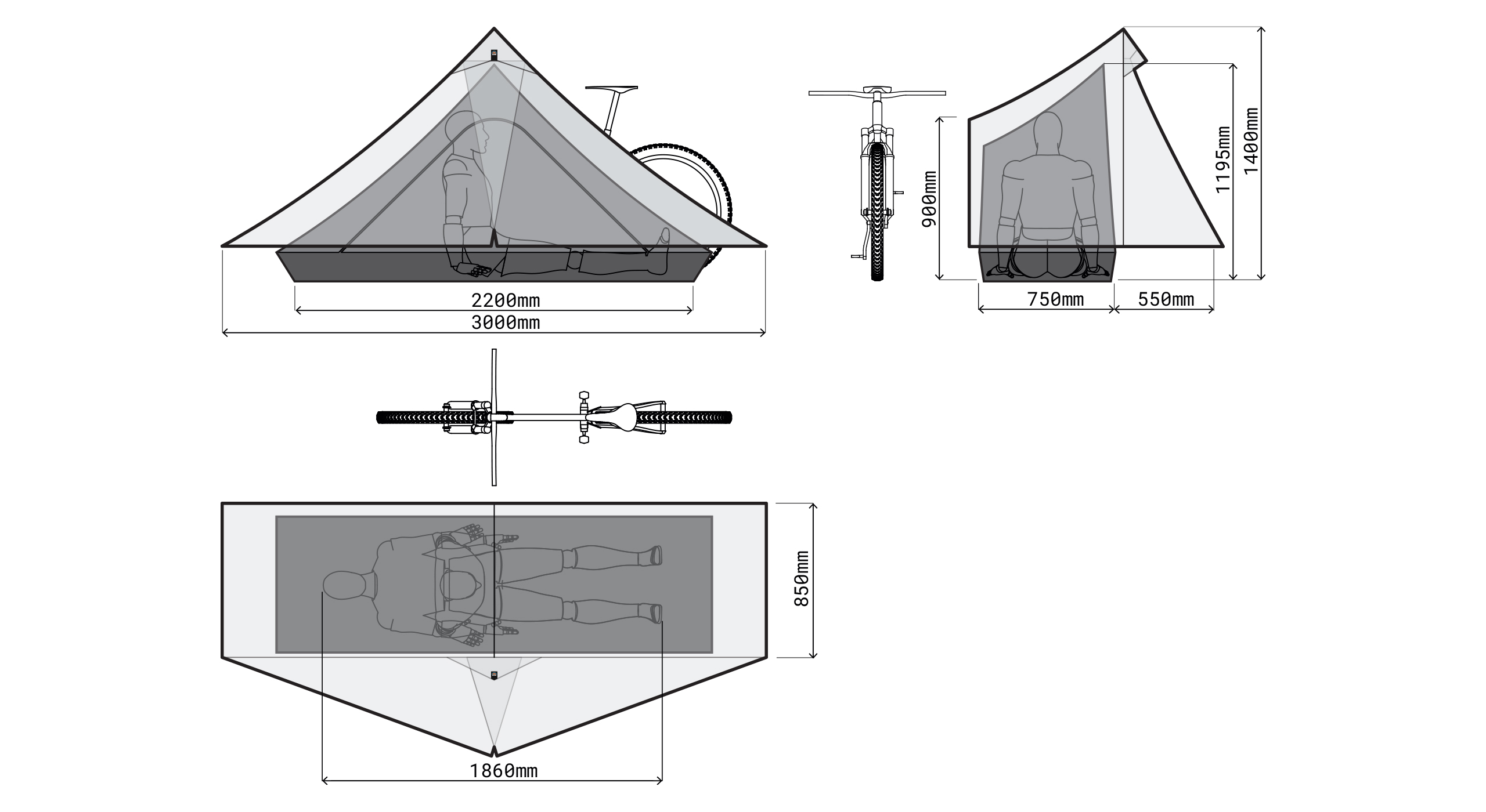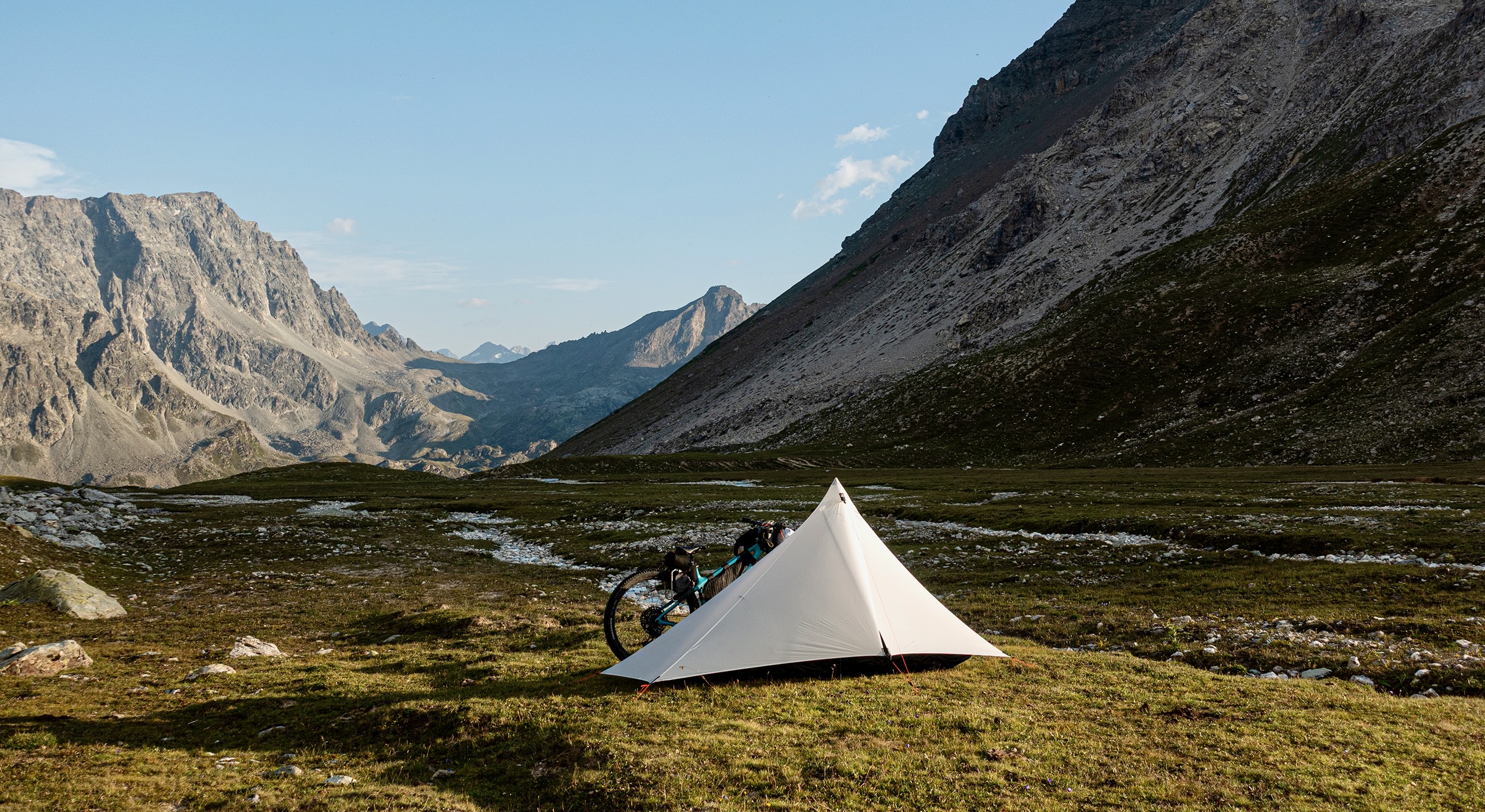 Aus dieser Erkenntnis heraus ist über mehrere Jahre das APEX1 entstanden – ein modulares Zeltsystem, das von Anfang an fürs Bikepacking gedacht ist. Es nutzt das Fahrrad als Teil der Zeltstruktur und spart so Gestänge, Gewicht und Volumen. Das Ergebnis ist ein Rekordwert: Ein Liter Packvolumen liefert über zwei Quadratmeter nutzbare Innenfläche. Kein anderes Einbogen-Zelt auf dem Markt bietet derzeit so viel Raum auf so wenig Platz.