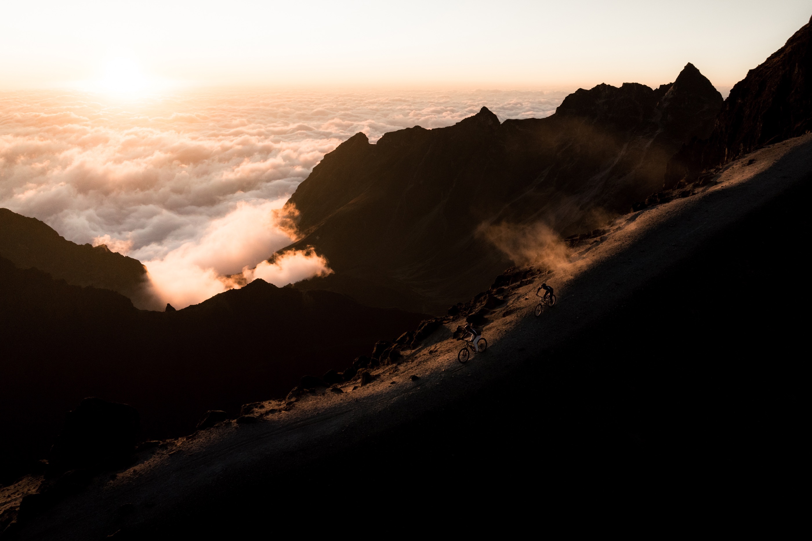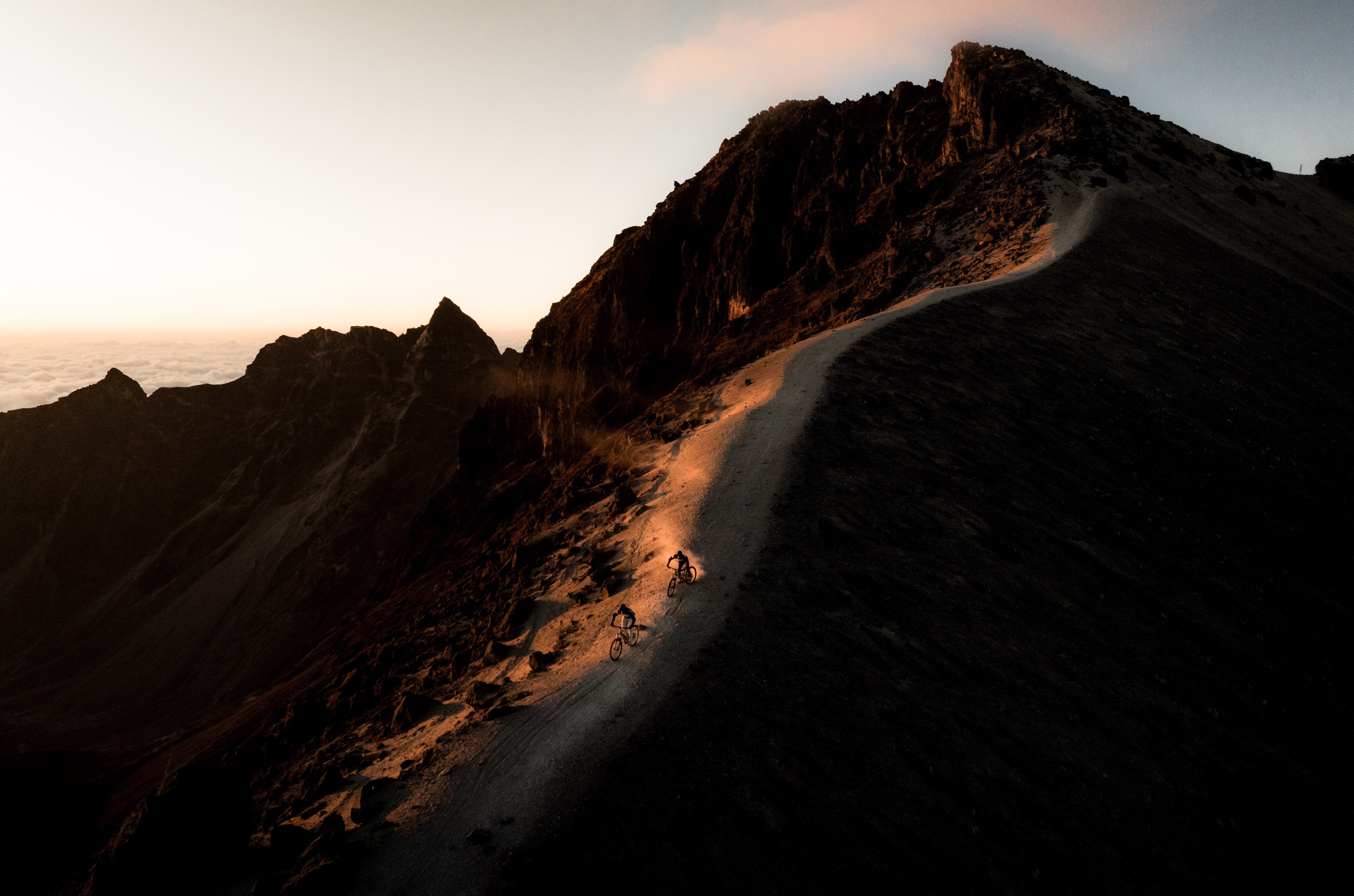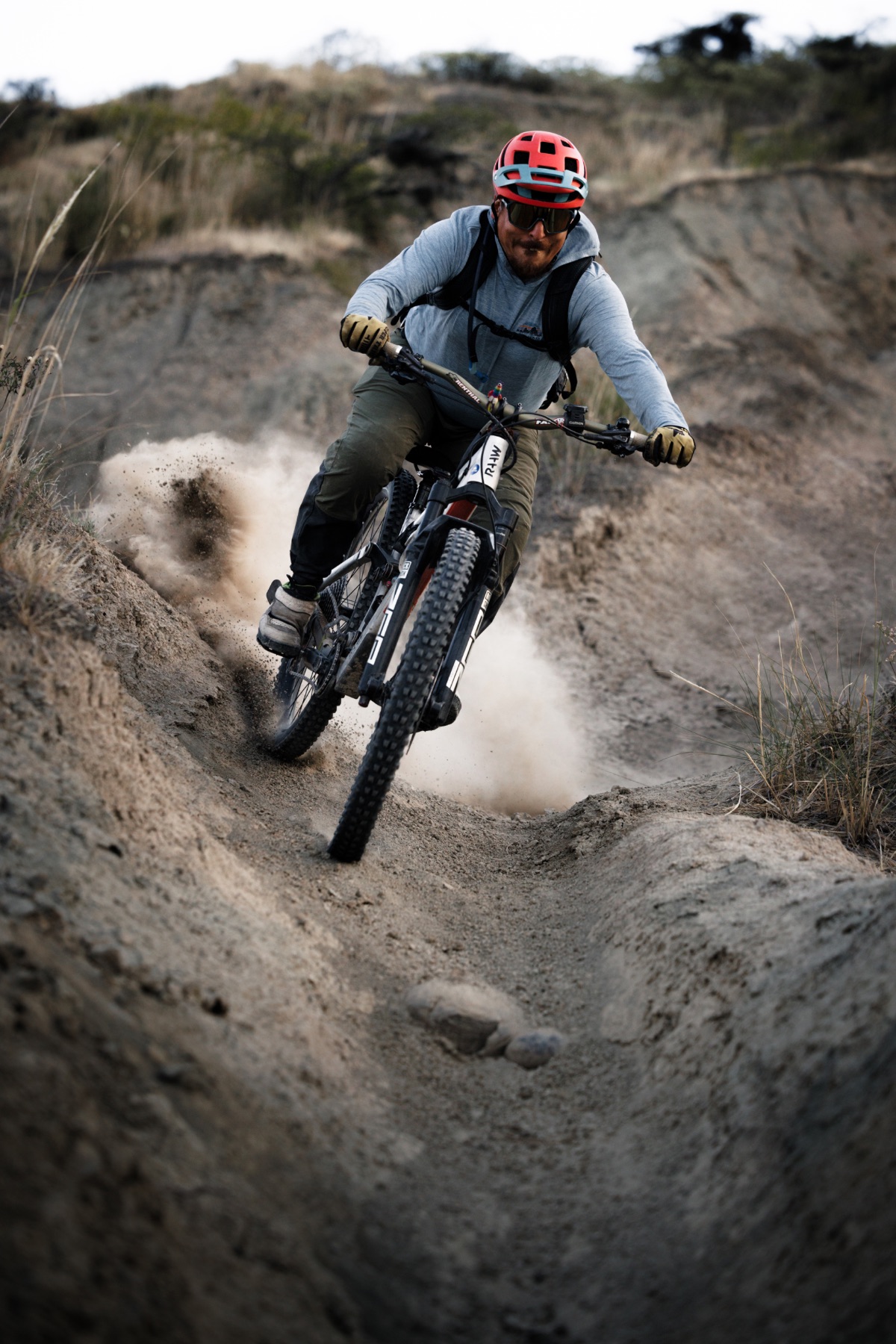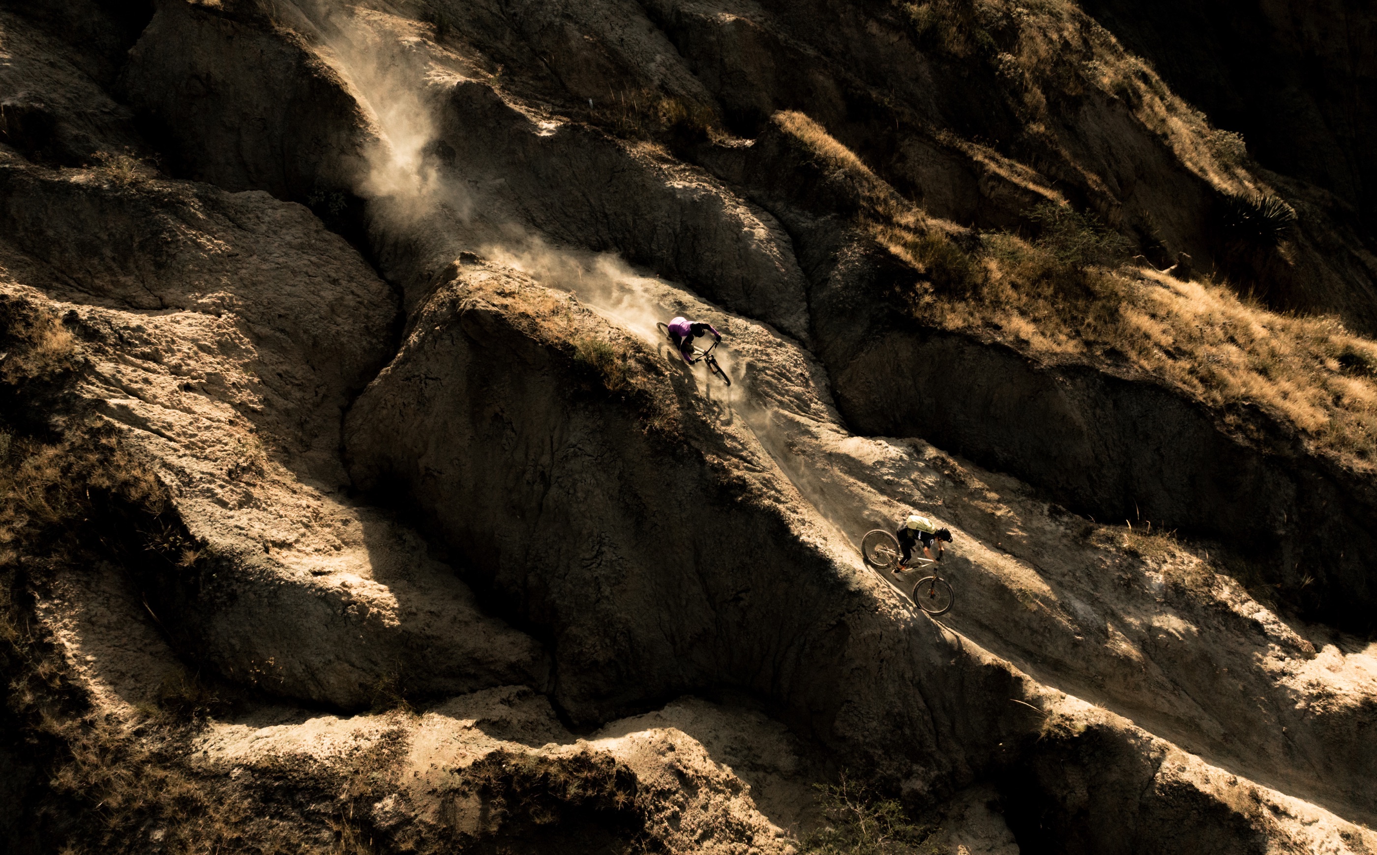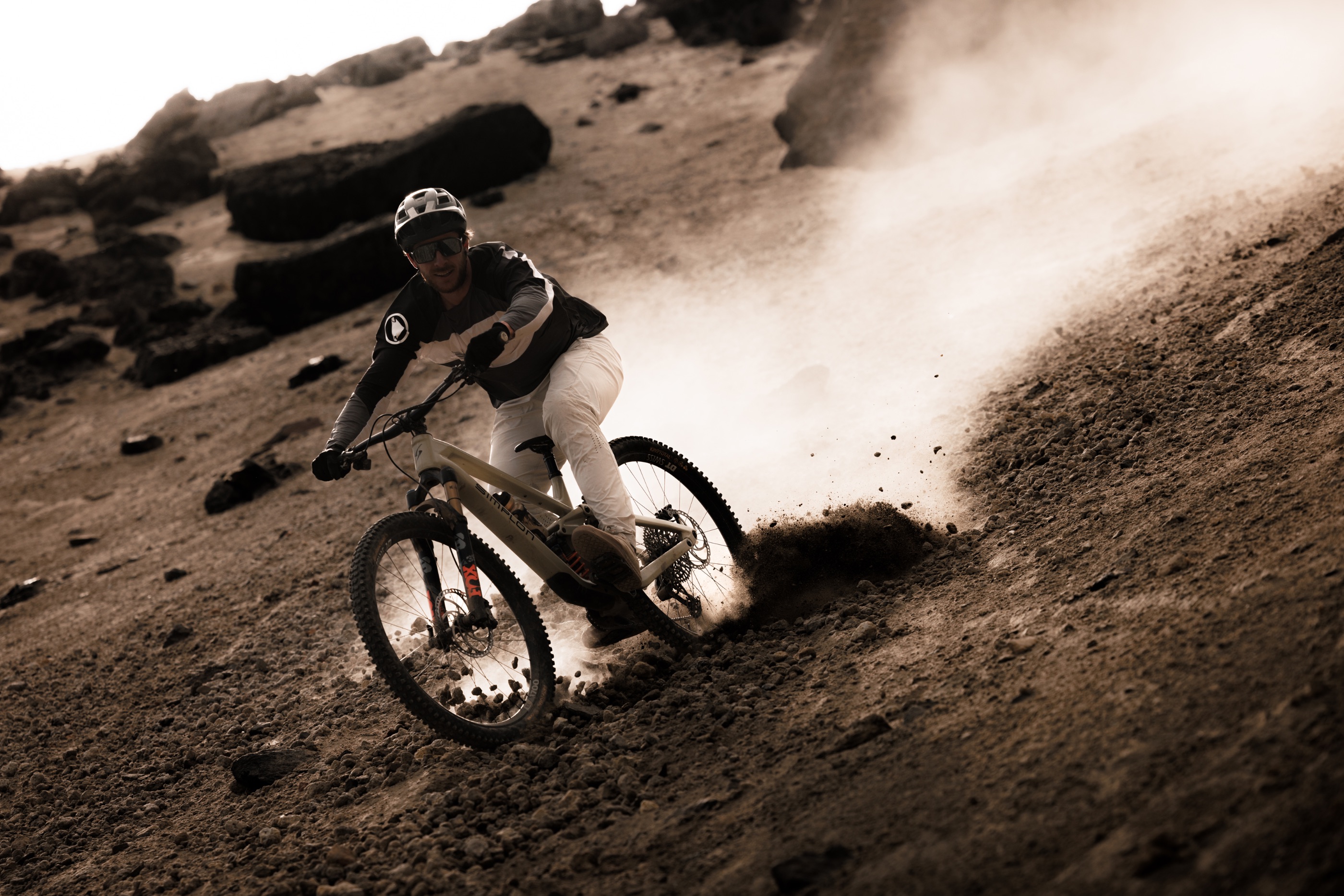 Doch mit jedem Meter im mehligen Sand, finden wir Vertrauen und beim zweiten Loop kommen wir aus dem Jauchzen nicht mehr raus. Wie in einer Rodelbahn läuft der Trail auf dem sandigen Rücken und lädt zum Driften, Flicken und Spielen ein! Erst im Schein unserer Stirnlampen rollen wir durch einen langen gewundenen Canyon zurück zum Bus.