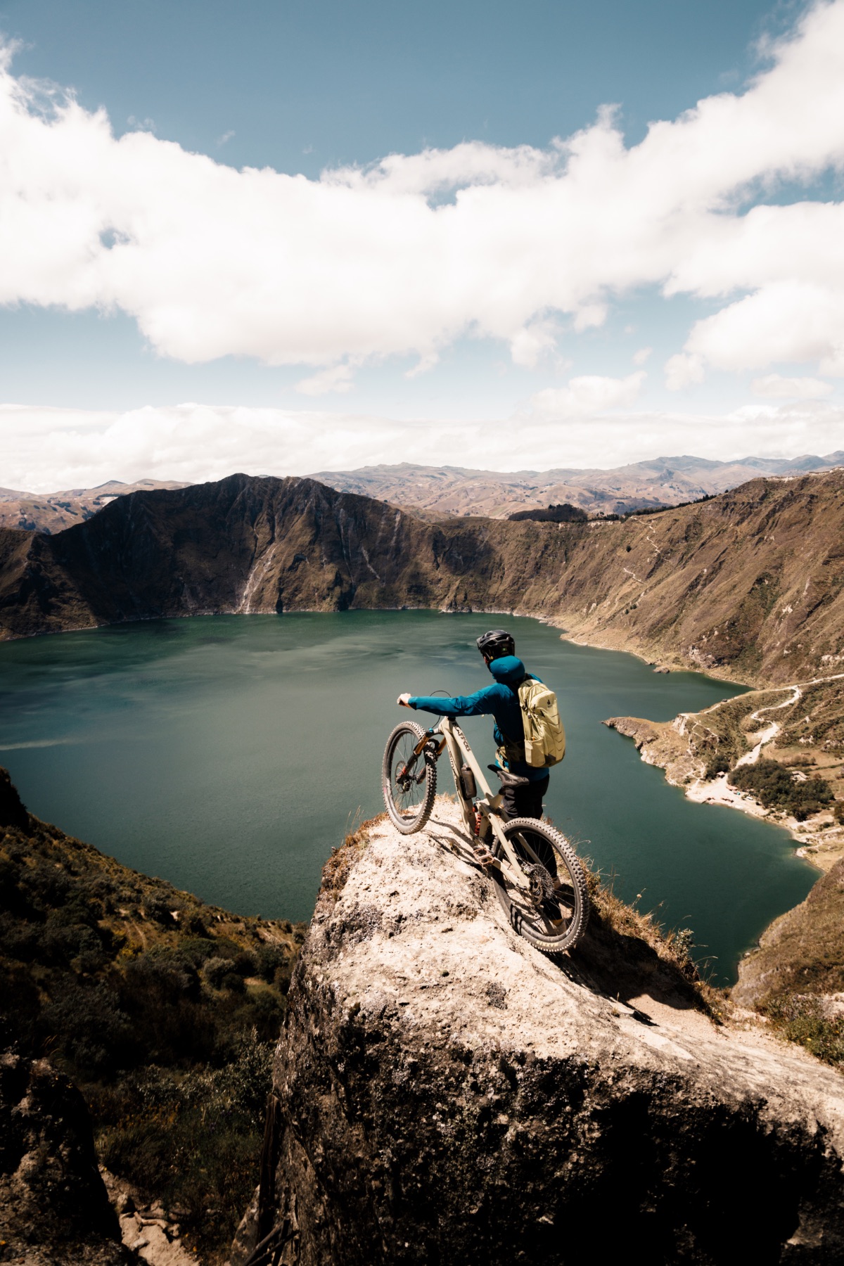 Bevor wir uns dem höchsten Berg des Landes nähern, zeigen uns Este und Cuevo noch einen anderen Vulkan. Ein türkisblauer See füllt den Krater des Quilotor, den wir zur Hälfte auf dem Bike umrunden, ehe wir in ein System aus Pfaden einbiegen, das uns mitten durch die kleinen Dörfer führt. Die indigene Bevölkerung hier lebt minimalistisch und von mühsamer Landwirtschaft. Eine Frau verkauft uns ein paar Flaschen Cola als wir Pause machen. Es ist ein seltsames Gefühl auf einem Rad unterwegs zu sein, das ein Vielfaches von dem kostet, was diese Frau im Jahr verdient. Die Leute scheinen jedoch nicht unglücklich zu sein, im Gegenteil. Stolz zeigen uns ein paar Kinder die Meerschweinchenfarm ihrer Familie. Fabi nimmt einen Jungen ein paar Meter auf seinem Lenker mit und Cuevo hat sowieso immer ein paar Süßigkeiten für die Kleinen dabei. Eine schöne Begegnung!