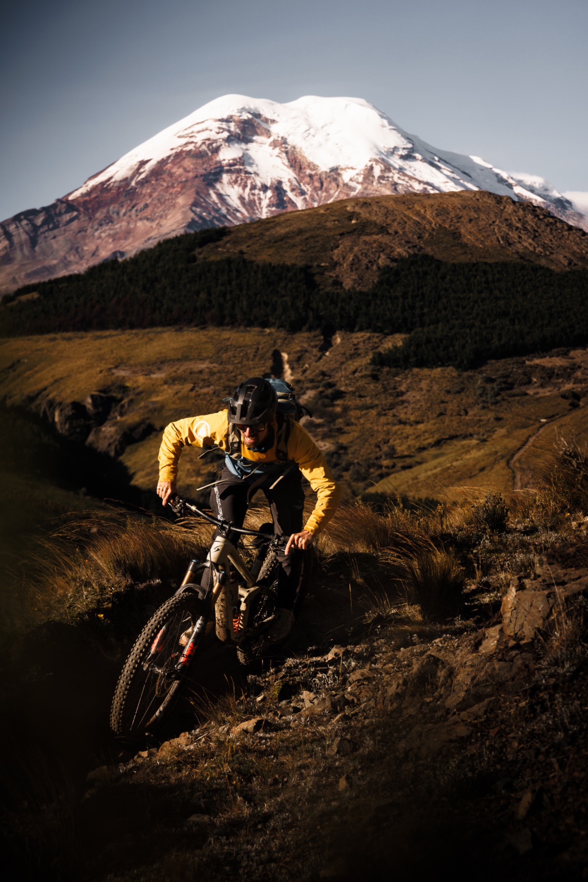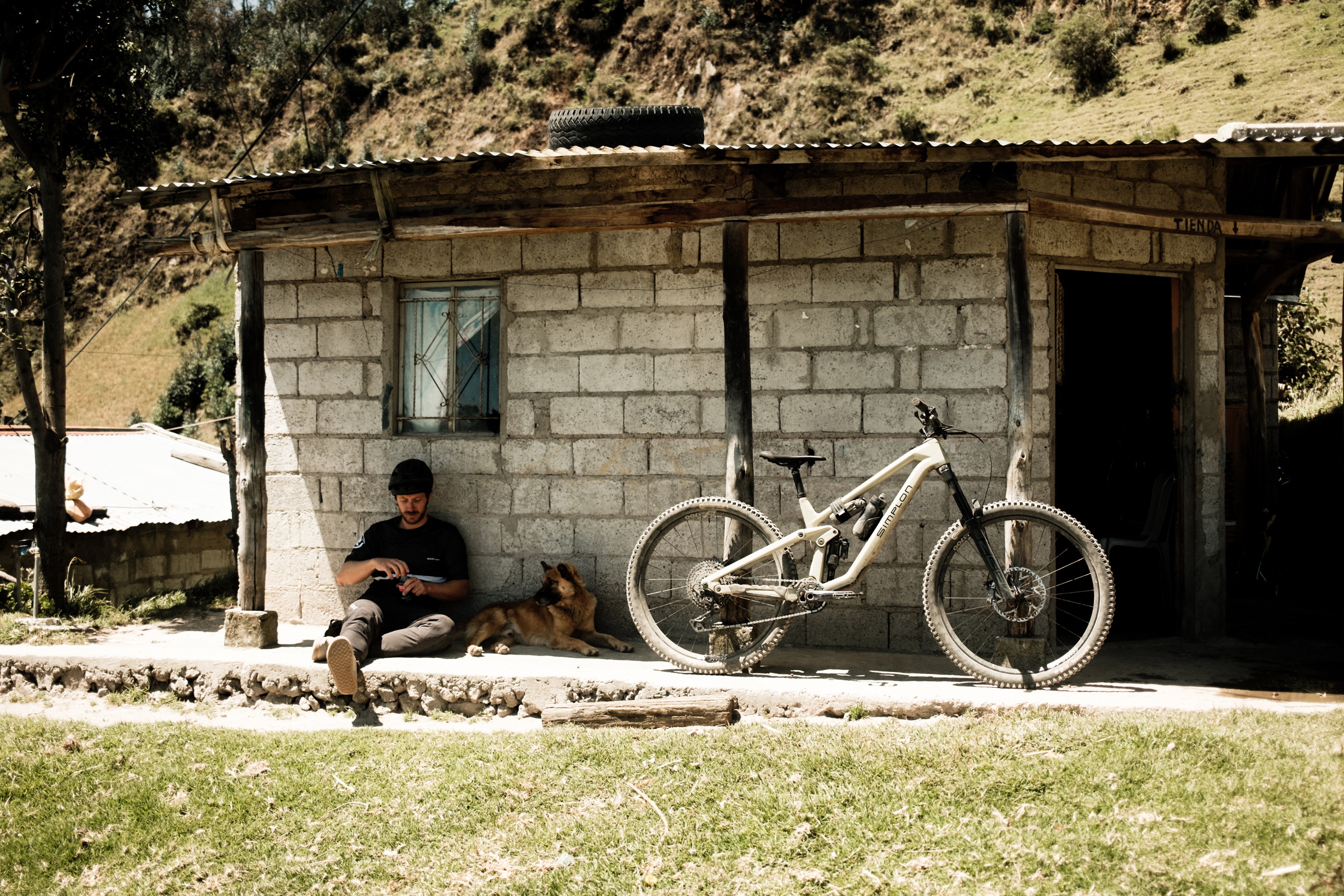 Für Este und Fabi ist es eine raue Nacht, die dünne Luft sorgt für flache Atmung, hohen Puls, Kopfweh und bringt wenig Erholung für die langen Abfahrten am nächsten Tag. Auf der anderen Seite des Chimborazo dürfen wir mit unseren Bikes nur dank Rodrigos Anwesenheit den Wanderweg vom Refugio Carell abfahren, von den Rangern entdeckt werden sollten wir allerdings trotzdem nicht. An kleinen Gruppen Lamas vorbei, erreichen wir schließlich den „Cassarilla“, ein Trail der wie viele andere vor allem für Enduro- und DH-Rennen gepflegt wird. Er ist in perfekten Zustand und wir fligen gerade so durch die Landschaft. Als wir nach zwölf Kilometern ein Dorf erreichen, hält Cuevo an und klopft an einer Hütte. Für die Pflege des Trails und dafür, dass wir ihren Weg nutzen dürfen, zahlen wir ein paar Dollar. Es ist bereits später Nachmittag als wir am Einstieg des letzten Trails stehen und ein paar knackige Gegenanstiege und rund 18 km Wegstrecke uns noch von unserer Unterkunft bei Guaranda trennen. Wir trödeln nicht, genießen die vom „Chimbo“ geprägte Kulisse und tauchen bei Anbruch der Dunkelheit in Cocos Garten ein, der wie eine kleine Oase auf uns wirkt.