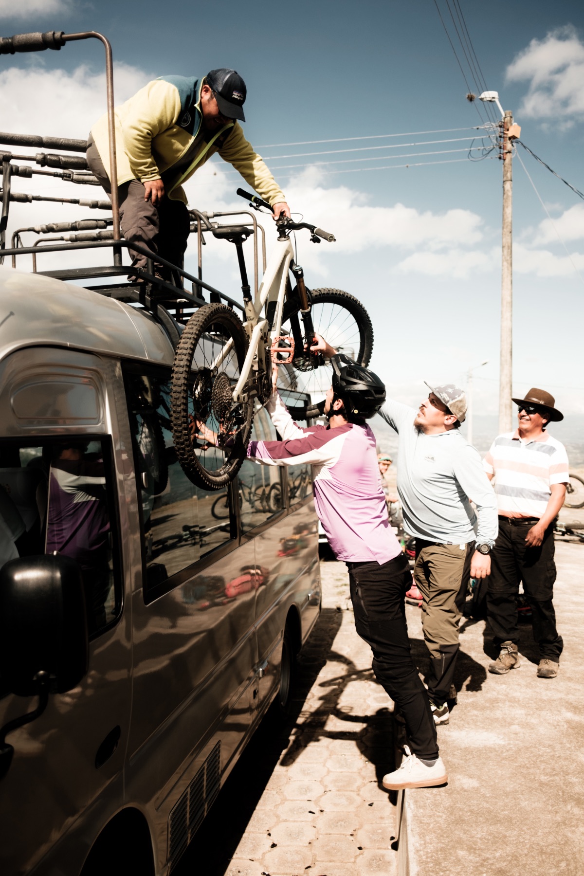 Zur Kategorie „Shuttle Abenteuer“ gehört auch Uzhcurrumi. Nach einer langen Fahrt im Bus stehen wir in einem kleinen Dorf aus Wellblechhütten mitten im Jungle. Es ist feucht, die Wolken hängen tief und während auf der einen Seite der maroden Straße jemand eine Sau zerlegt, packt gegenüber ein tüchtiger Geschäftsmann Shrimps in Plastiksäcke und preist diese lauthals an. Mitten in dieser Szenerie lädt Juan José mit seinen Jungs unsere Bikes auf einen Pickup. Besser gesagt auf ein Metallgestell am Dach des Pickups. Wir nehmen auf der Ladefläche Platz und beäugen skeptisch die gerissenen Schweißnähte und unsere hin und her schlagenden Bikes, während wir durch die Landschaft scheppern. Plötzlich lichtet sich der Nebel und wir tauchen aus der Wolkendecke auf. Wir sind zurück in der für die Anden typischen, höhenbedingt kargen Berglandschaft. Es ist so windig, dass es mir bei der ersten Abfahrt die Sonnenbrille aus dem Gesicht reißt und man sich beim Fahren förmlich gegen den Wind lehnen muss. Insgesamt acht Strecken werden hier zum Biken in Stand gehalten und optimiert. Keine leichte Aufgabe, denn während der Regenzeit im Winter ist der Boden weich und die oftmals Canyon artigen Pfade werden vom Vieh stark umgegraben. Nach dem letzten Regen trocknet der Boden aus, wird steinhart und lässt sich nur noch unter schweißtreibender Arbeit mit Pickel und Hake bearbeiten. Zum Abschluss geht es einen langen Trail hinab in die Wolkendecke und zurück zu Victor, der uns am nächsten Tag wieder zu unserem Ausgangspunkt nach Quito bringt.