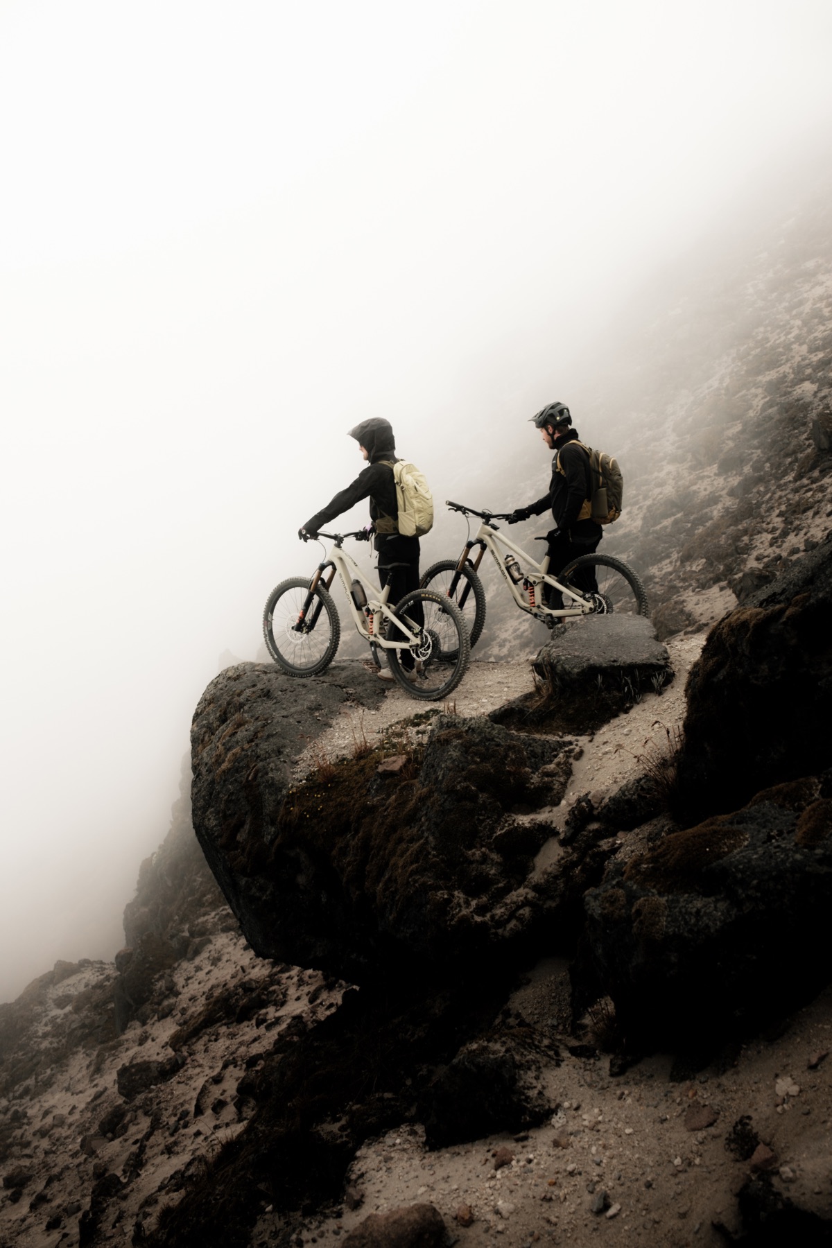 Gut, dass der „Holy Ridge“ am nächsten Tag vor allem durch seinen gutmütigen Character uns beeindruckende Landschaft und nicht durch seine exponierte Lage besticht. Doch von vorne… Die Anden haben sind beim Zusammenprall zweier tektonischer Platten aufgefaltet und dabei sind etliche Vulkane entstanden. 18 der 55 Vulkane in Ecuador sind immer noch aktiv, darunter auch der 5.897m hohe Cotopaxi. Den vergletscherten Gipfel erreichen wir mit unseren Bikes natürlich nicht, doch bis auf eine beachtliche Höhe von 4.600 Meter können wir durch die mondartige Flanke des Berges mit dem Bus fahren. Vom Parkplatz aus surfen wir durch einen riesigen Schotterhang in unwirtlicher Kulisse und tauchen einige hundert Höhenmeter später in die Wolkendecke ein, wo wir uns auf besagtem „Holy Ridge“, einem flowigen Trail auf einem grasbewachsenen Rücken wiederfinden.