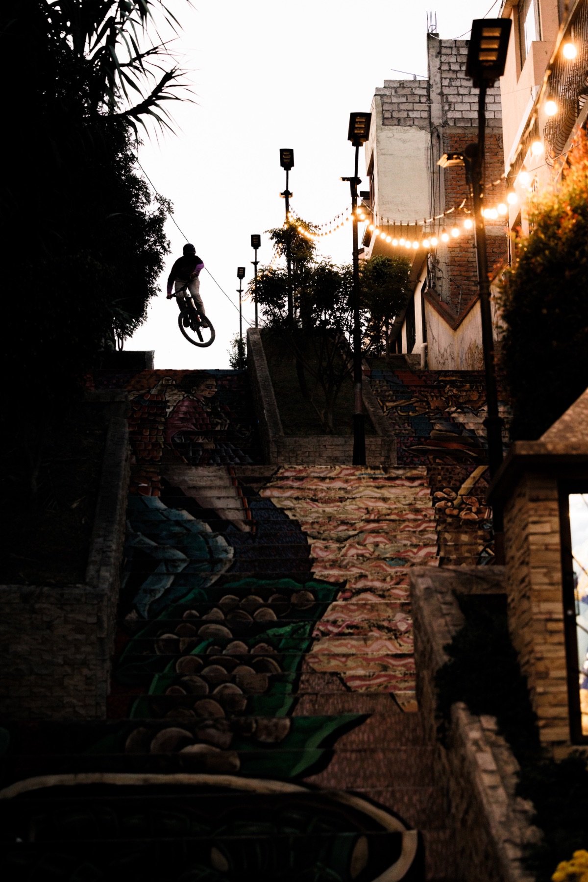 Seltsame Formen sind es auch, die mich mich ein paar Stunden später auch aus meinen Gedanken reißen. Ein Stein ist gegen meine Bremsscheibe am Vorderrad gesprungen und die eiert jetzt gefährlich im Bremssattel. Glücklicherweise zieht sie sich von selbst wieder halbwegs gerade und fliegt nicht auseinander. Ein bisschen mulmiges Gefühl habe ich trotzdem: Vor uns liegen 3.000 Höhenmeter Pfad bis in den Dschungel, ohne Zugang zu Support. Hilft ja nix! Bei 40 Grad Hitze, drückend schwüler Luft und tiefen Schlammlöchern zwischen großen Palmen ist es schließlich aber Markus, der sich in einem Bachbett den ersten Defekt der Reise fährt. Doch mit etwas Geduld ist auch der Platten am Hinterrad geflickt und wir rollen durch endlose Bananenplantagen fast bis auf Meereshöhe. In einem kleinen Streetfood Laden stärken wir uns mit „Ceviche“, einer kalten Suppe mit Fisch und Garnelen, die traditionell mit getrockneten Kochbananenstreifen serviert wird.