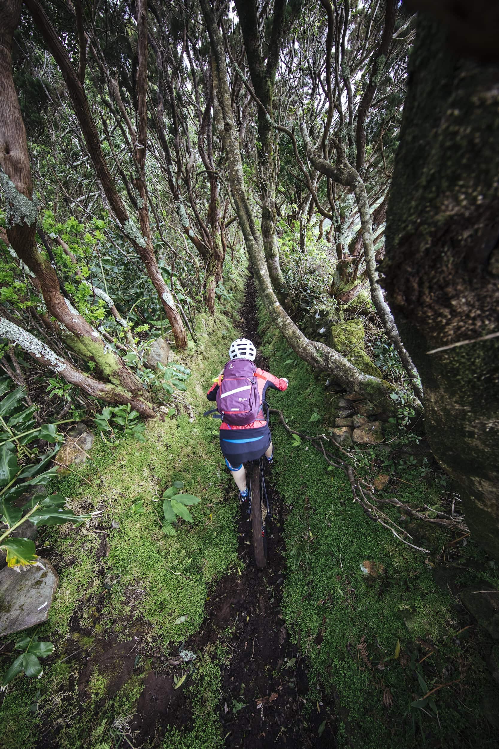 Wir shutteln auf den höchsten Punkt der Insel, den „Pico Alto“. Je weiter wir uns empor schrauben, umso dichter wird die Vegetation. Das satte Grün nimmt uns völlig gefangen. Immer wieder kreuzen Trails die Straße und wir erahnen langsam das Potential für Biker. Oben angekommen geht es gleich los. Kurz antreten und wir tauchen ein in den dichten, dschungelartigen Wald. Luis gibt sofort Gas. Als Local kennt er jeden Stein und jede Kurve.