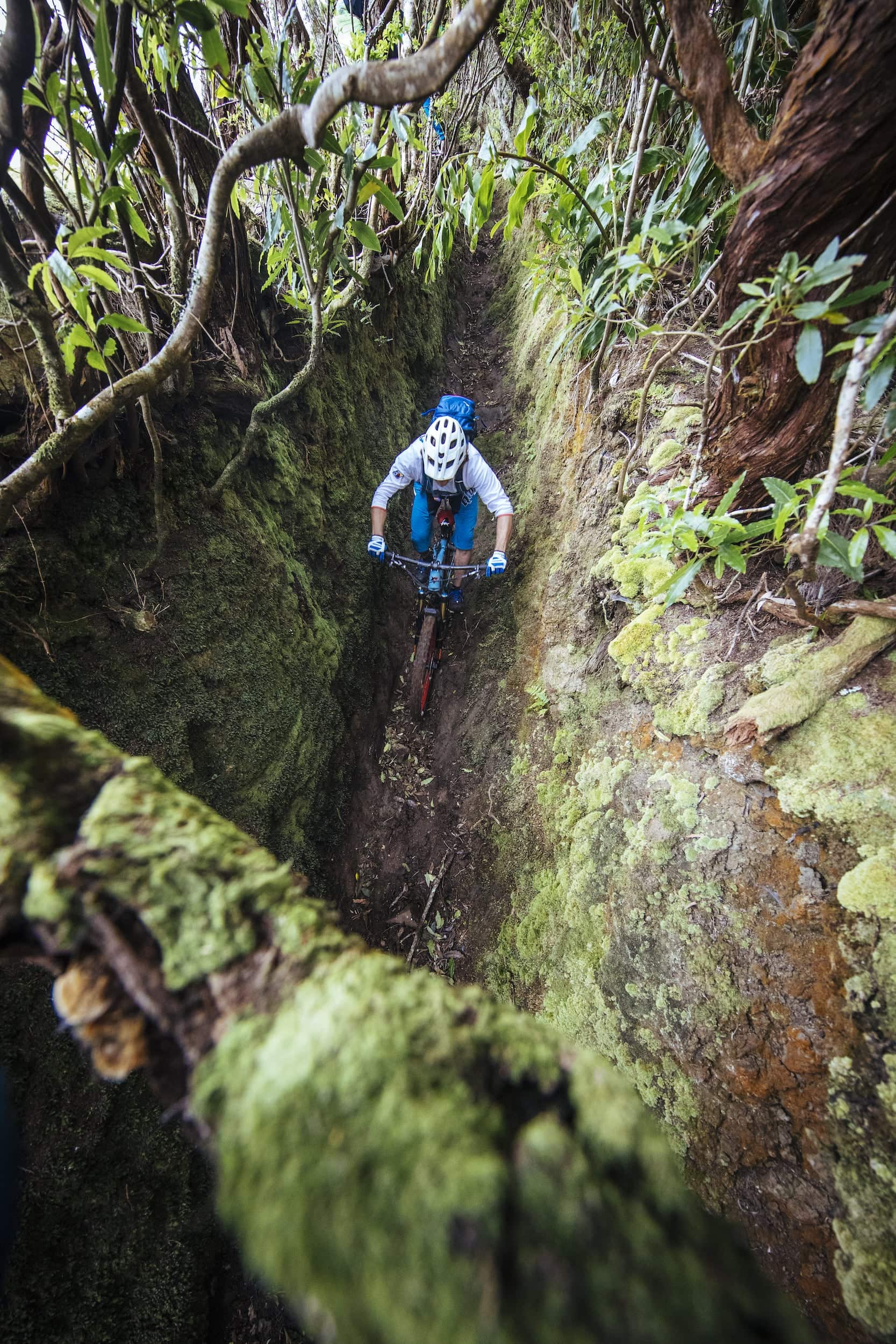 Wir dagegen müssen uns erst an den weichen, mit Wurzeln gespickten Boden gewöhnen. Luis wartet aber an jeder Abzweigung auf uns, damit wir uns nicht verfahren. Wie ein Spinnennetz ziehen sich die Wege über den Berg. „Santa Barbara“, unser Trail, der in das gleichnamige Dorf führt, schlängelt sich durchs Dickicht, gibt aber zwischendurch immer wieder Ausblicke auf die grüne Insel frei. Beim nächsten Stopp mahnt Luis zur Vorsicht. Der folgende Abschnitt geht durch einen, nicht viel mehr als lenkerbreiten, mannshoch eingeschnittenen und bei Nässe sehr rutschigen Canyon und bietet kaum Spielraum für Fahrmanöver oder gar Fahrfehler. Schon der Einstieg in den tunnelartigen Abschnitt ist mit schmierigen Steinen übersäht. Da hilft nur Bremse auf und hinein ins Vergnügen. Ich rutsche und es schlittere, mein Lenker touchiert zweimal die Wand bis mich der Canyon auf einer Wiese wieder ausspuckt.