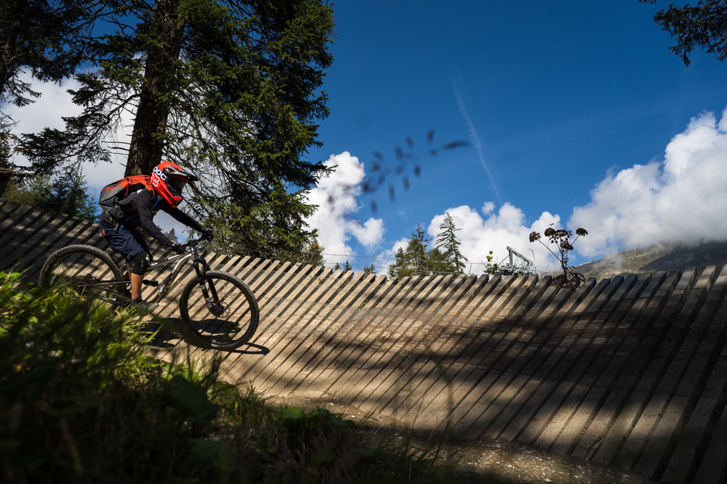 Wir starten mit einer kleinen Aufwärmrunde durch den Bikepark. Los geht's mit auf dem leichtesten Trail, dem Milky Way, der auch für Mountainbike-Neulinge gut machbar ist. Nach dem ersten Viertel wechseln wir jedoch auf den mittelschweren und damit auch spannenderen Strada del Sole Trail, der mit deutlich mehr Sprüngen versehen ist und auch steilere Segmente aufweist. Insgesamt neun Trails von leicht bis schwer stehen zur Auswahl. Man kann immer wieder zwischen den verschiedenen Trails hin und her wechseln. Am Ende führen alle durch den Skillpark mit unterschiedlich großen Tables und Doubles, einer Dropbatterie von 20 Zentimeter bis zwei Meter Höhe sowie einem Anlieger Parcours. Ein Pumptrack gegenüber der Talstation rundet das vielfältige Angebot ab und eignet sich auch perfekt, um mit den ganz Kleinen dort abzuhängen, während die anderen eine Runde im Park fahren.