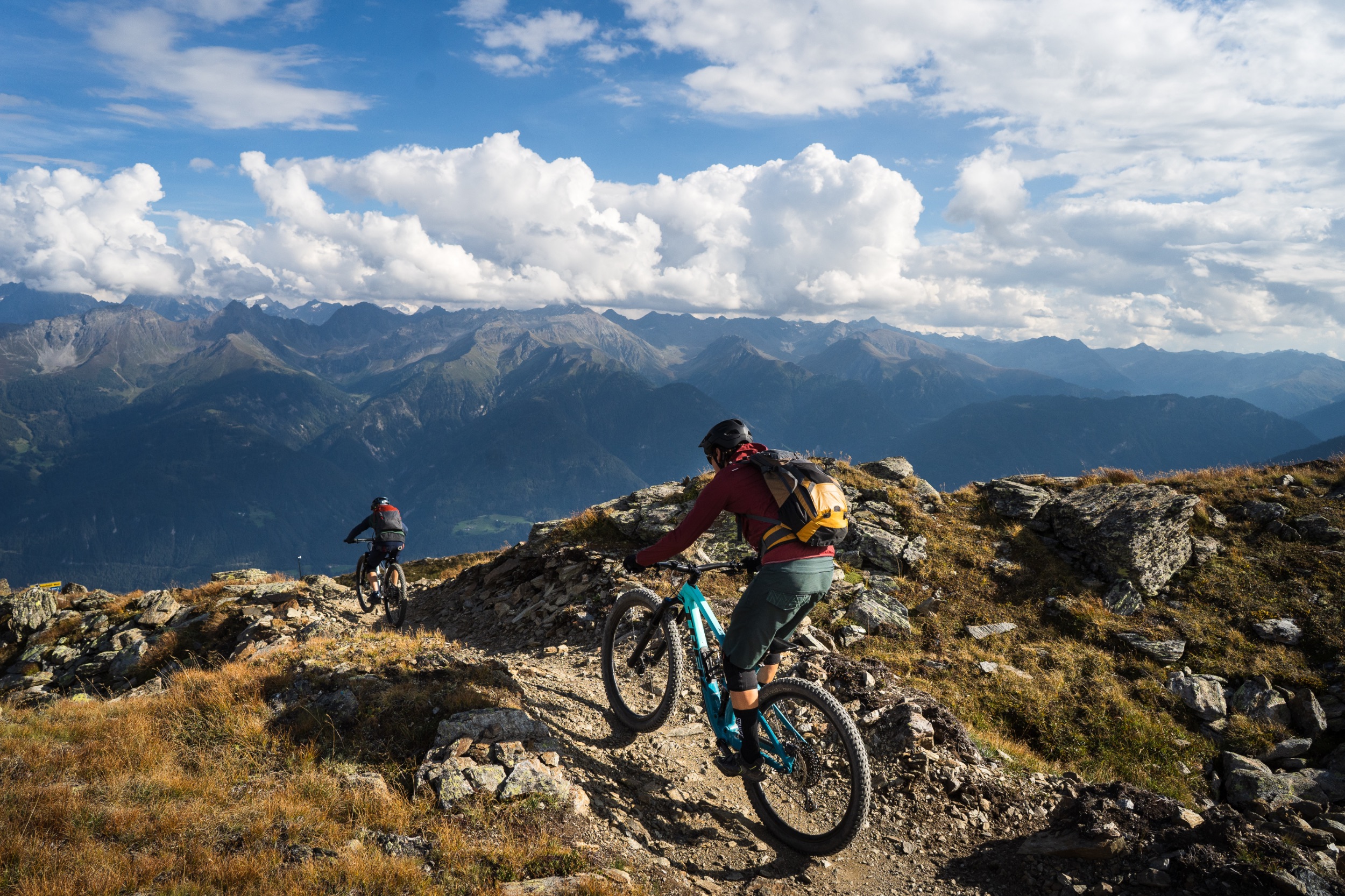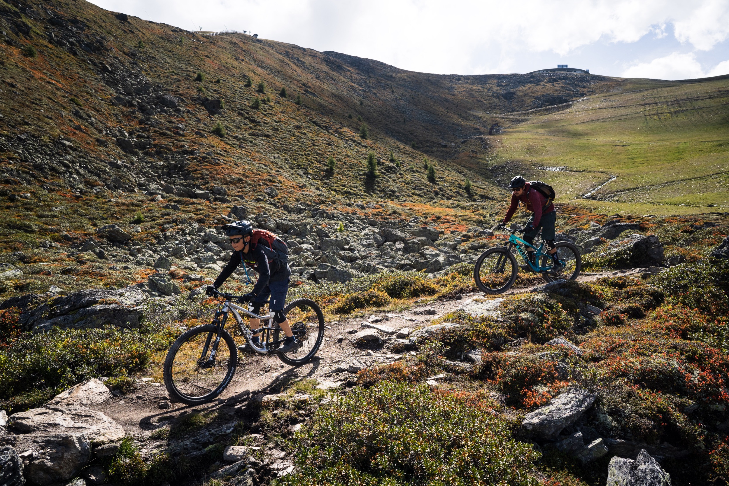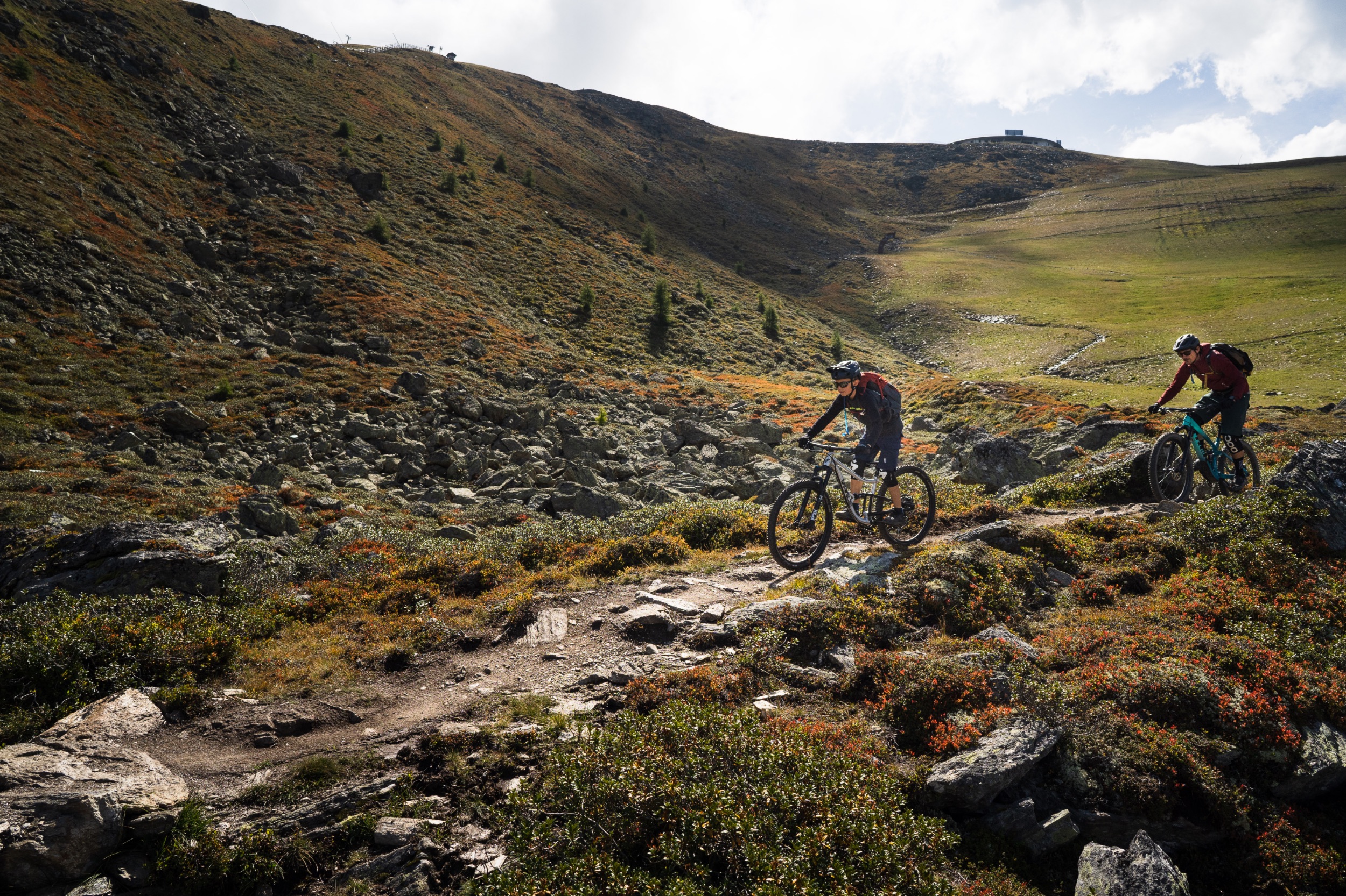 Leicht narkotisiert vom völlenden Mittagessen, schaukeln wir mit der Almbahn hoch zum Zwölferkopf auf 2.596 Meter, dem höchsten Trailstartpunkt des gesamten Gebiets. Die Aussicht hier oben ist noch einen Zacken besser als vom Fisser Joch. Man sieht hinein bis ins Ortlermassiv des benachbarten Vinschgaus. Doch der frische Wind ist nicht besonders einladend und wir schauen, dass wir weiterkommen. Schließlich wartet noch das Highlight des Tages auf uns, der fast schon legendäre Frommestrail. Davor cruisen wir noch den als leicht eingestuften Almtrail hinunter zum Fisser Joch. Schnelle flowige Passagen wechseln sich ab mit kurzen, steileren Abschnitten, gespickt mit Spitzkehren und tollen Ausblicken.