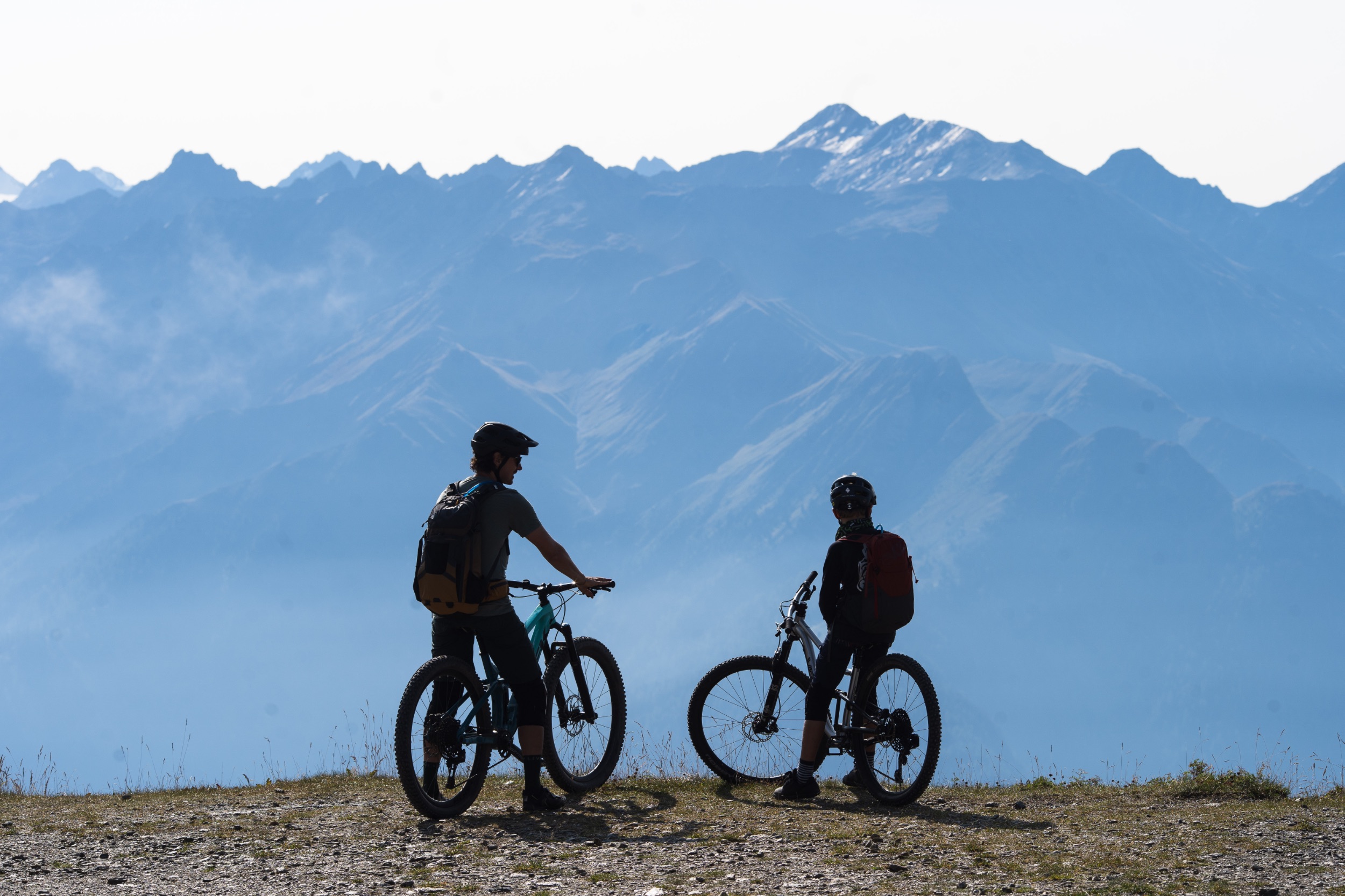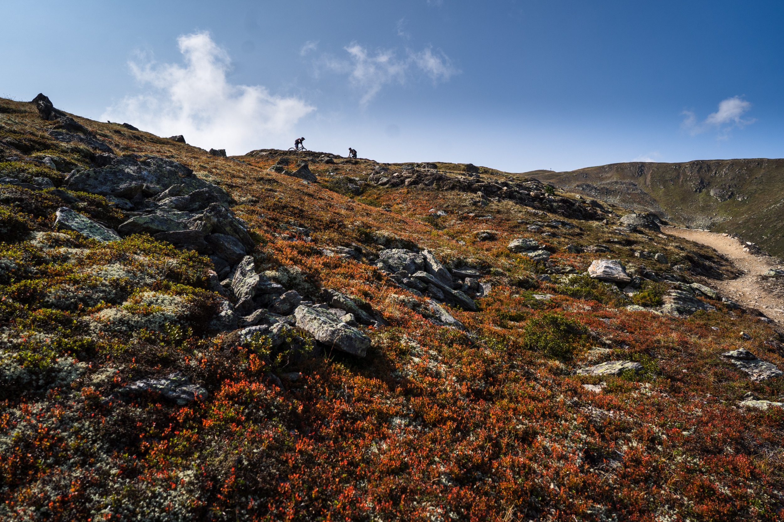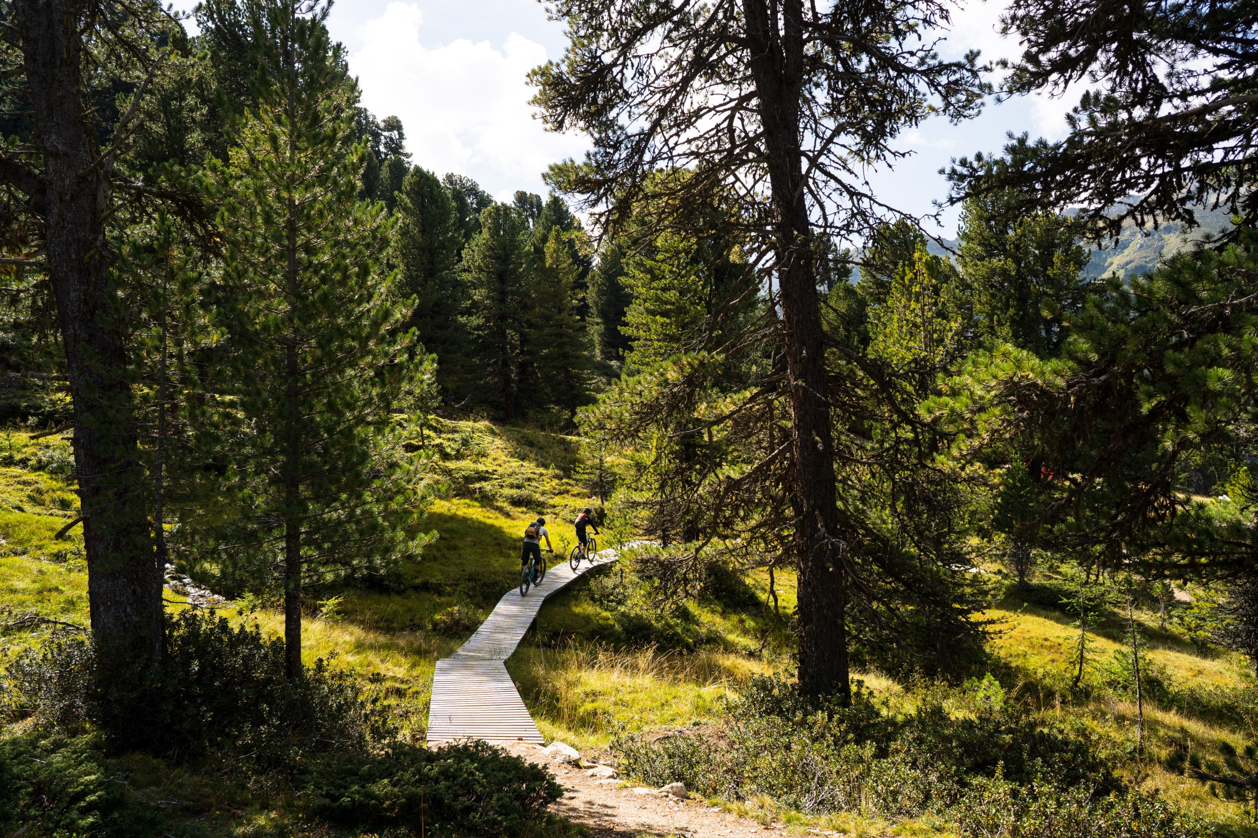 Leicht narkotisiert vom völlenden Mittagessen, schaukeln wir mit der Almbahn hoch zum Zwölferkopf auf 2.596 Meter, dem höchsten Trailstartpunkt des gesamten Gebiets. Die Aussicht hier oben ist noch einen Zacken besser als vom Fisser Joch. Man sieht hinein bis ins Ortlermassiv des benachbarten Vinschgaus. Doch der frische Wind ist nicht besonders einladend und wir schauen, dass wir weiterkommen. Schließlich wartet noch das Highlight des Tages auf uns, der fast schon legendäre Frommestrail. Davor cruisen wir noch den als leicht eingestuften Almtrail hinunter zum Fisser Joch. Schnelle flowige Passagen wechseln sich ab mit kurzen, steileren Abschnitten, gespickt mit Spitzkehren und tollen Ausblicken.