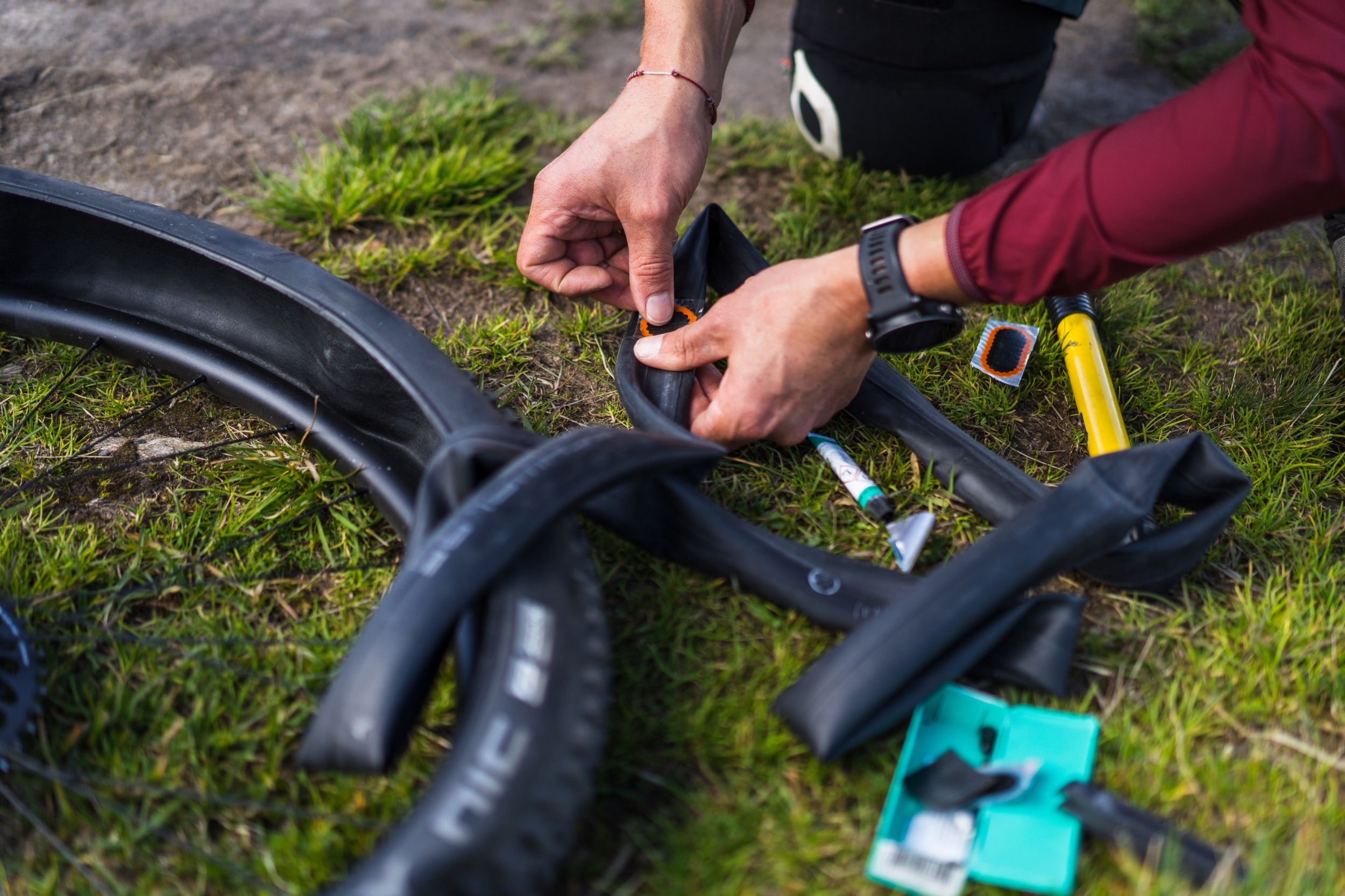 Ein Plattfuß zwingt uns jedoch schon etwas eher zum Innehalten und Landschaft genießen. Denn fast schon hinterhältig provoziert ein unscheinbar aus der dünnen Grasnarbe herausspitzelnder Stein reihenweise Durchschläge. Bei uns erwischt es Paul. In Gesellschaft einer weiteren Snakebite-Crew wechseln wir den Schlauch. Die kleine Zwangspause ändert jedoch nichts daran, dass Paul zufrieden ist. „Papa, das ist genau so, wie ich es mag. Ein natürlicher Trail, nicht plattgewalzt, dafür ruppig, a bisserl verblockt und mit vielen kleinen Drops. Richtig cool!“ Als jedoch ein paar Minuten später wieder der Snakebite zuschlägt und ein lautes „Psssssssss“ ertönt, sinkt die gute Laune schlagartig. Vermutlich auch, weil sich so allmählich auch ein kleiner Hungerast breit macht. Einen Schlauch haben wir keinen mehr. Also wird geflickt und gehofft, dass das heute der letzte Platten bei Paul war.