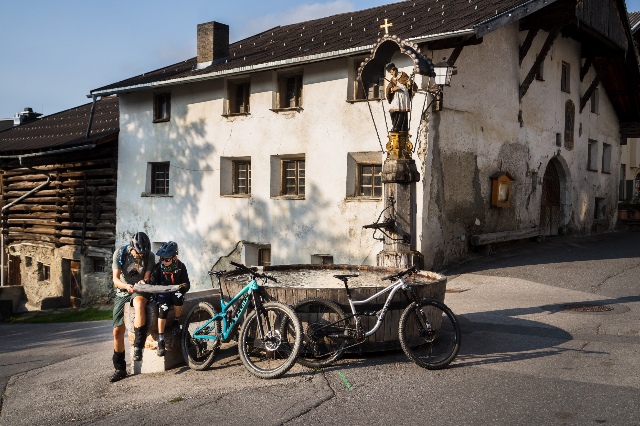 Eigentlich bin ich kein so großer Freund von Gondeln oder Shuttles. Denn ich finde, dass sich eine Abfahrt, die man sich zuvor selbst erstrampelt hat, komplett anders anfühlt und man sie auch mehr wertschätzt. So ergeben sich meistens, abhängig von der Tour eine, zwei, maximal drei Abfahrten am Tag. That’s it. Gibt man die Bergaufmühen an Lift, Auto oder Zug ab, kommt man in den Genuss von deutlich mehr Abfahrten. Wenn man es krachen lässt, sind schon mal bis zu 5.000 Tiefenmeter an einem Tag möglich. Aber dadurch rutscht man – zumindest beobachte ich das bei mir –in einen Zustand des reinen Tiefenmeterkonsums, und die Abfahrt – ursprünglich Motivation und Belohnung zugleich fürs Bergauffahren, -schieben und -tragen – verkommt zu einem nur sehr kleinen, weil inflationären Glücksgefühl. Das Besondere geht damit für mich ein Stück weit verloren. Die reine Bergabfahrt-Fraktion, die sich in den Bikeparks dieser Welt tummelt, sieht das natürlich anders. Und dass sich die große Mountainbike-Community mittlerweile in viele Sub-Communities aufgesplittet hat, wird mir wieder mal so richtig bewusst, als wir am Samstagmorgen unseres Männer-Wochenendes in der Mountainbike Destination Serfaus-Fiss-Ladis an der Talstation des Bikeparks in Fiss einlaufen und, obwohl noch nicht mal neun Uhr ist, quirliges Treiben herrscht. Selbst diejenigen, die nichts mit der Mountainbike-Szene am Hut haben, erkennen sofort: Hier geht's um alles. Sprichwörtliche Heerscharen an Gladiator:innen in Vollprotektion, ihre Pferdchen alle mit Doppelbrückengabeln und mindestens 160 Millimeter Federweg.