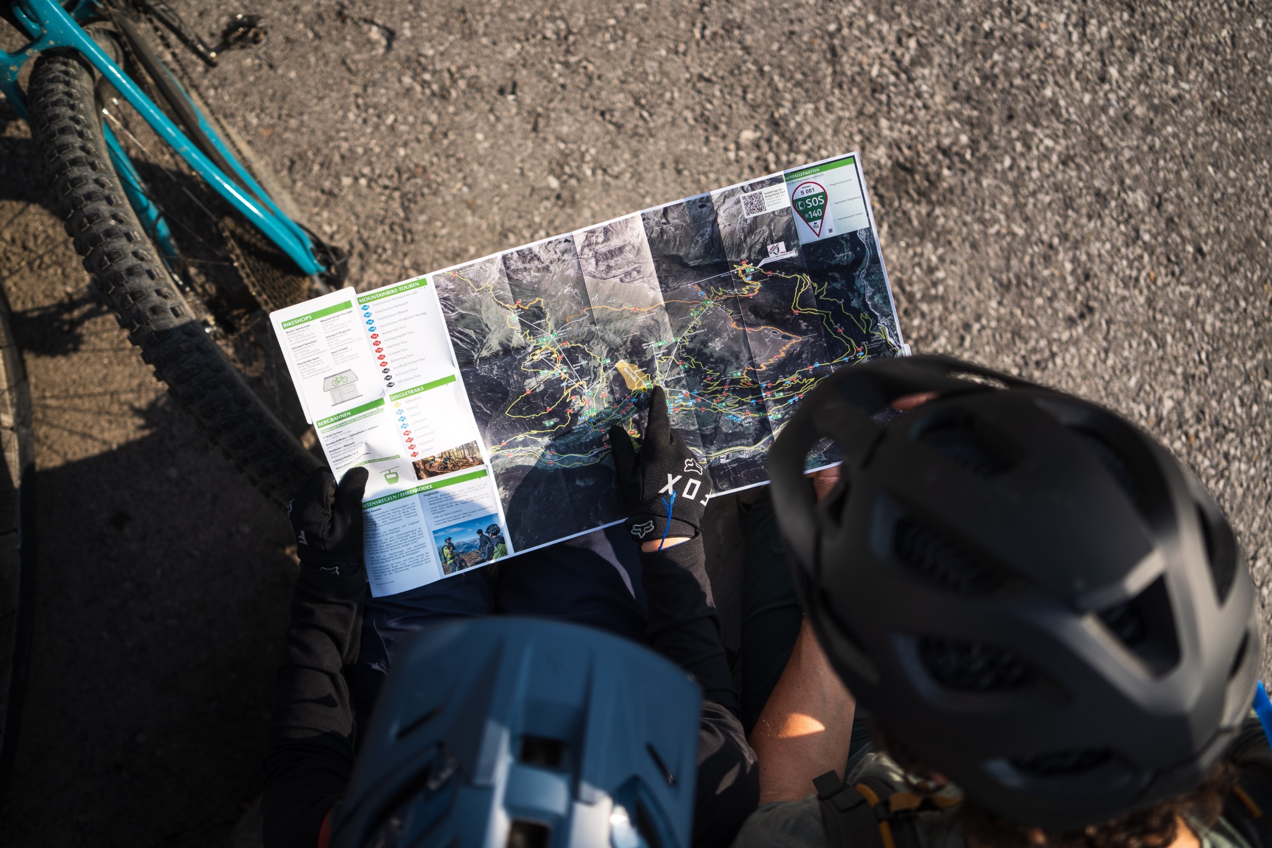 Wir entscheiden uns nach kurzer Beratschlagung als erstes Richtung Schöngampalm abzufahren und dort unsere Mittagspause einzulegen. Auf dem Weg nehmen wir zwei neu gebaute Trails, den Flüster- und den Zirbentrail, unter die Stollen. Der Startpunkt ist direkt am Fisser Joch, das so etwas wie einen zentralen Trailknotenpunkt im weitläufigen Areal darstellt. Von hier aus lassen sich nämlich fünf der acht ausgewiesenen Singletrails erreichen.