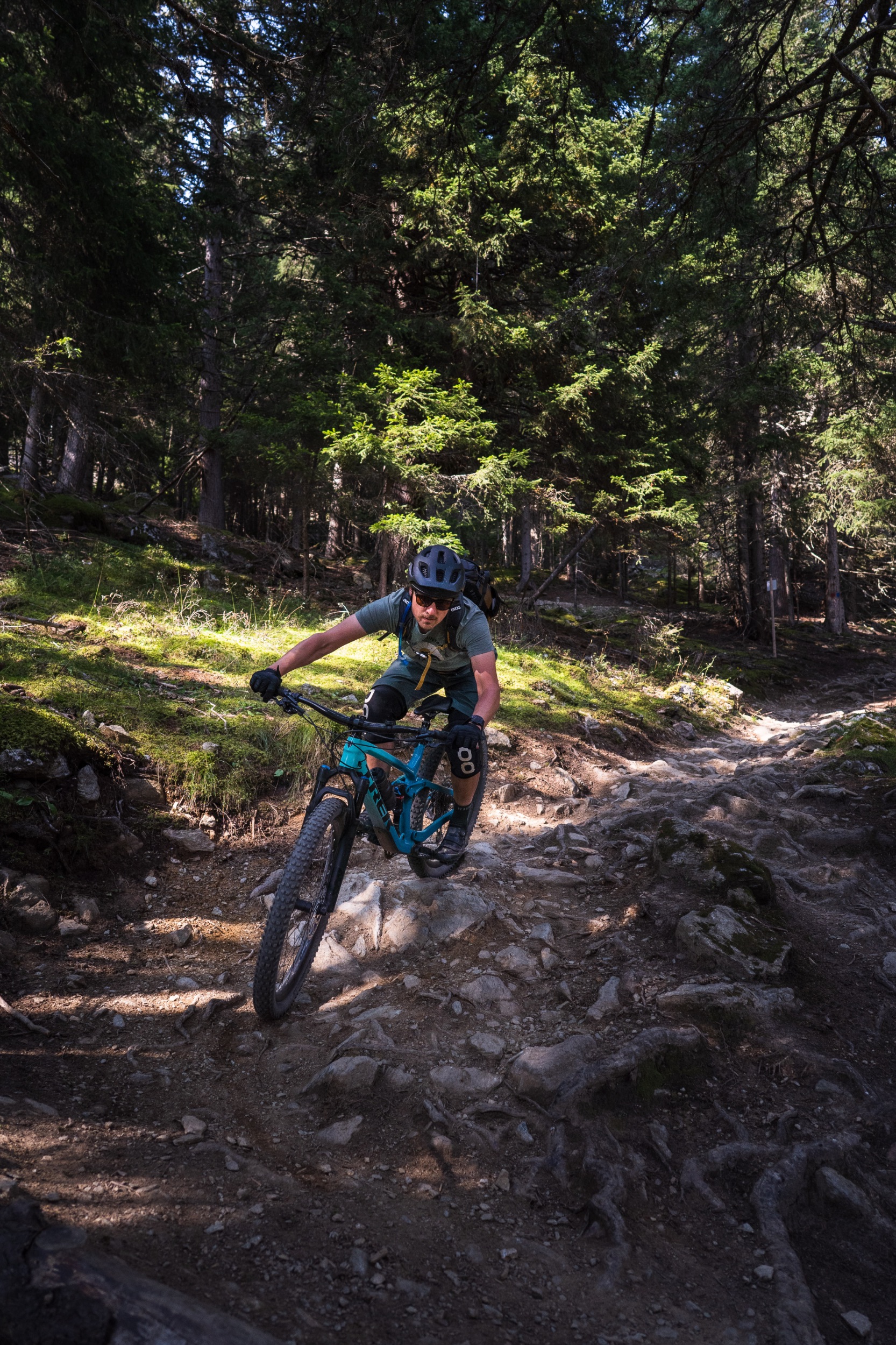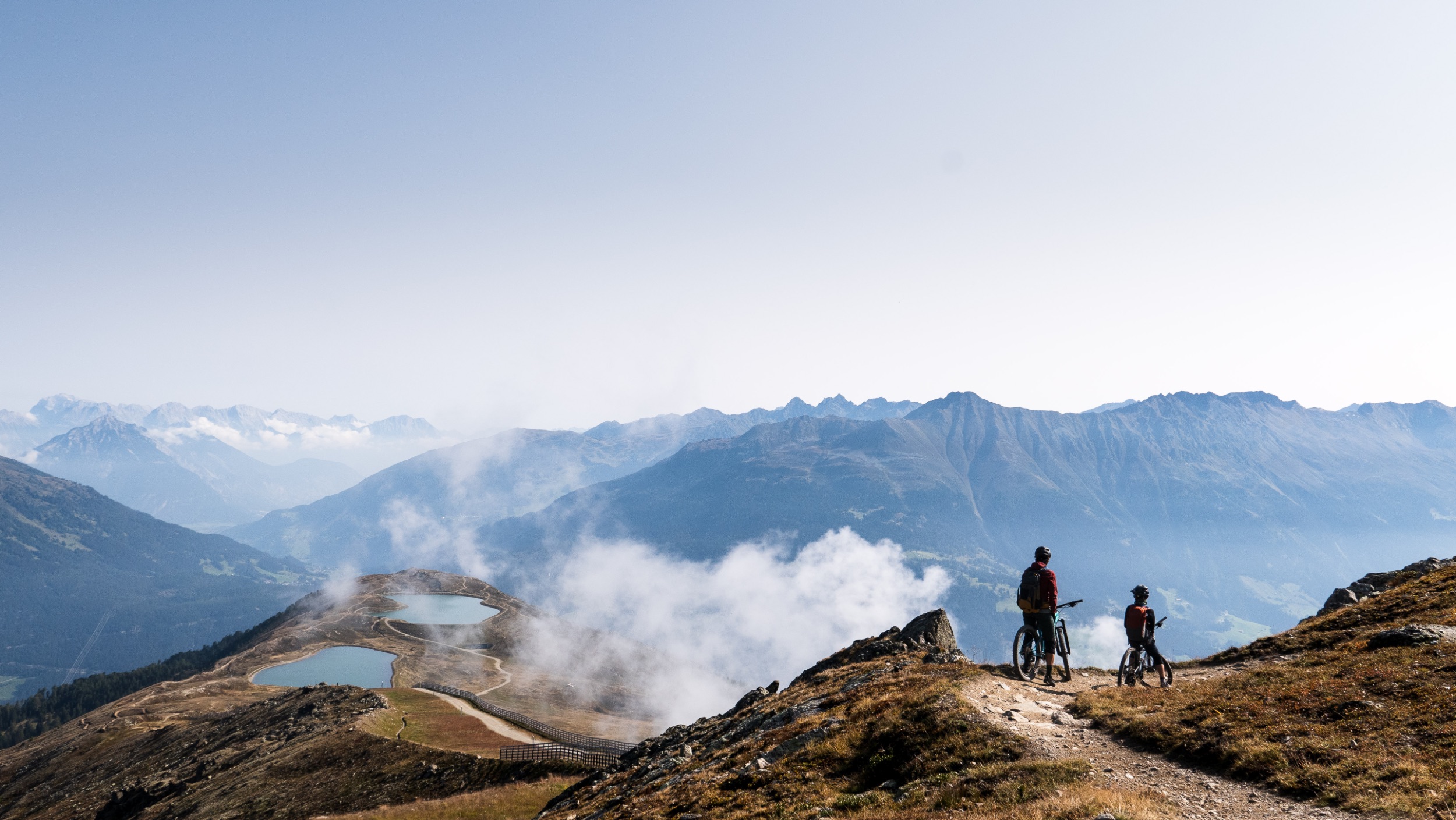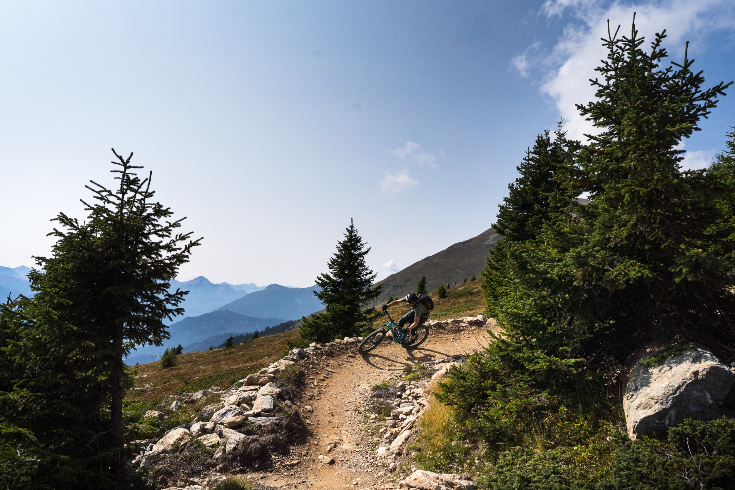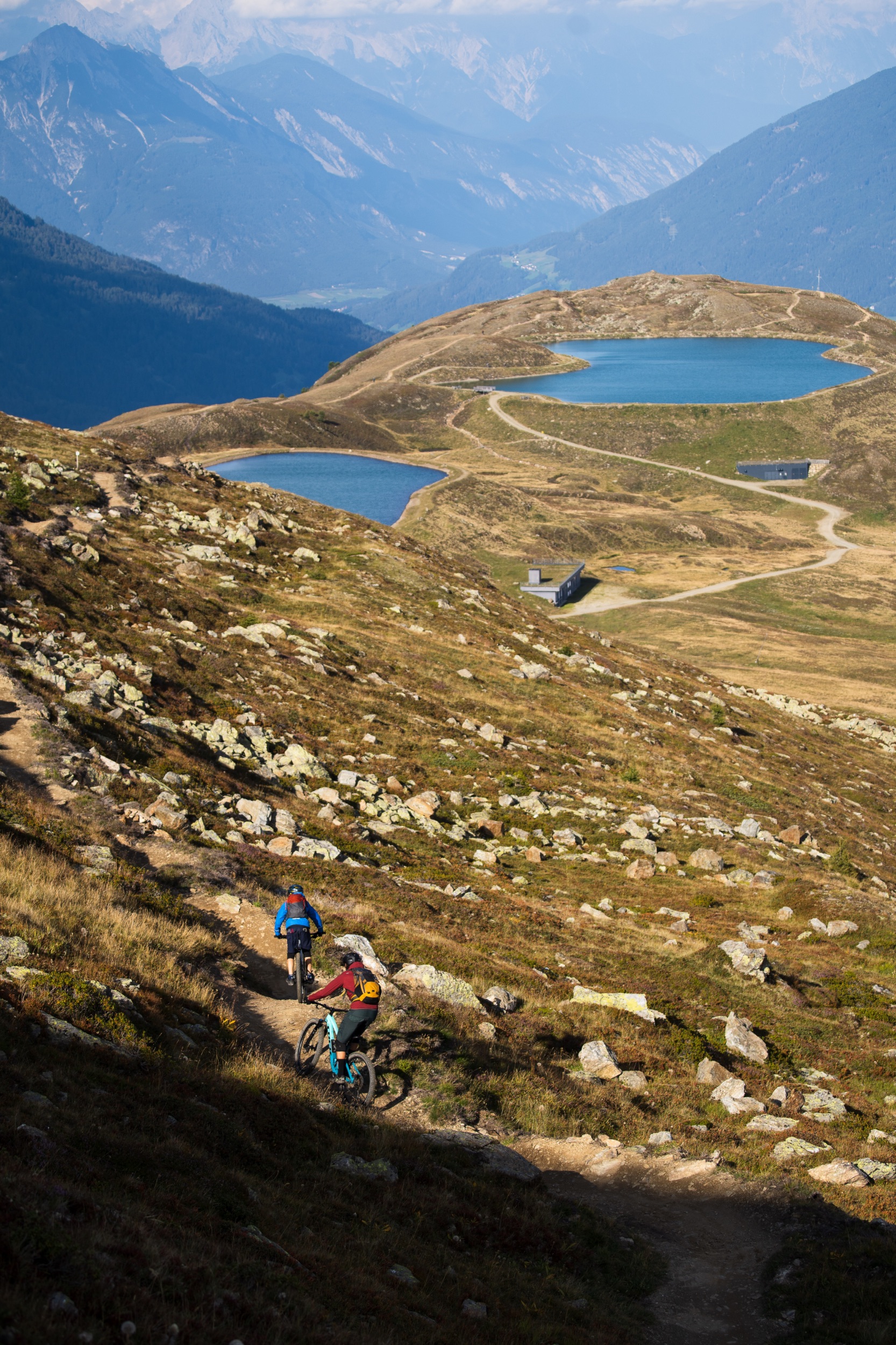 Der erste Abschnitt des Trails hinunter bis zu den Speicherseen ist geprägt von einer beeindruckenden, hochalpinen Kulisse mit tiefen Blicken hinab ins Inntal. Der Trail ist insgesamt sehr flowig und schnell zu fahren, weist aber trotzdem den Charakter eines natürlichen Bergpfads auf, steinig, manchmal geröllig, manchmal felsig, ganz selten leicht verblockt, alles in allem sehr verspielt, fordernd aber nie überfordernd. Fortgeschrittenere Biker:innen finde viele kleinere und größere Wellen sowie natürliche Hindernisse vor, die immer wieder zum Springen einladen. Teilweise fühlt man sich wie auf einer nicht enden wollenden Murmelbahn. Der Spaßfaktor ist richtig hoch. Da sind wir beiden uns schnell einig.