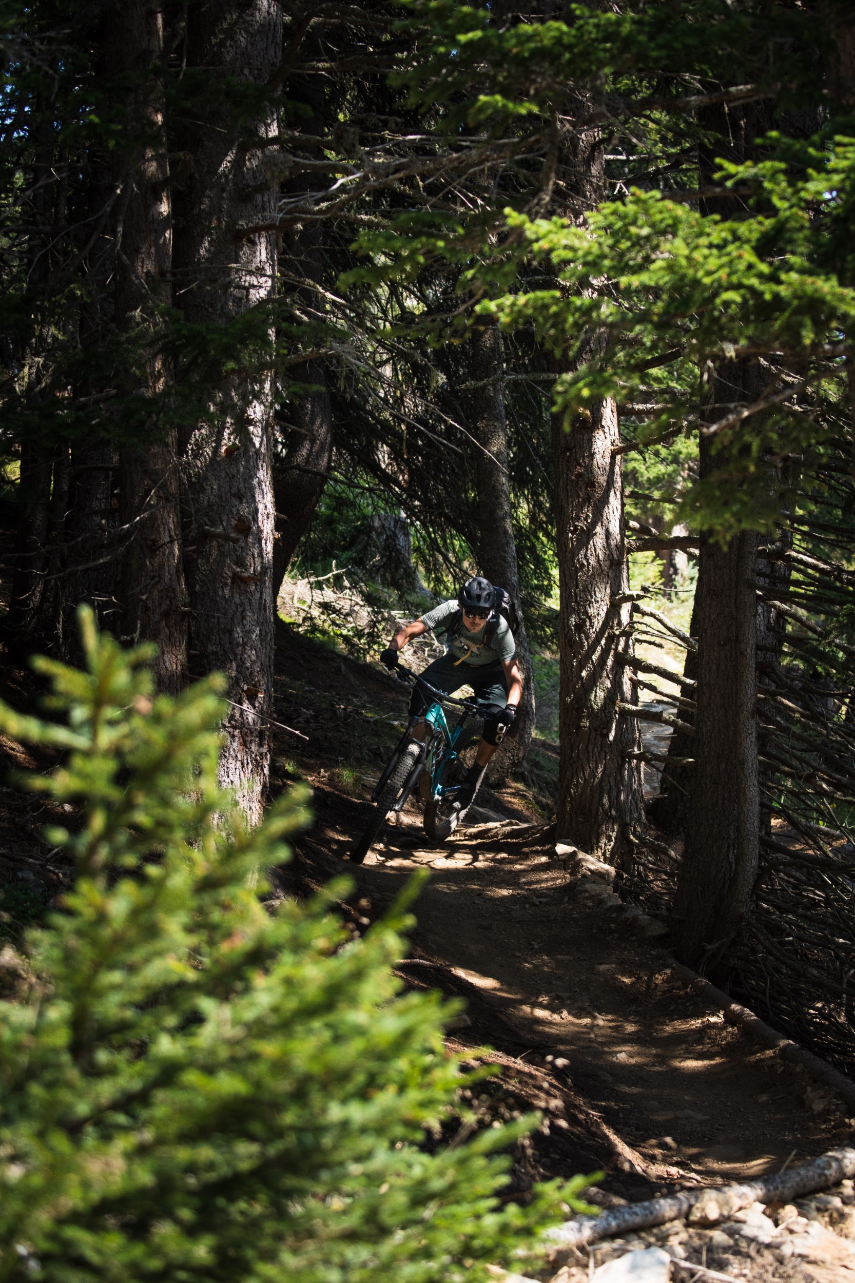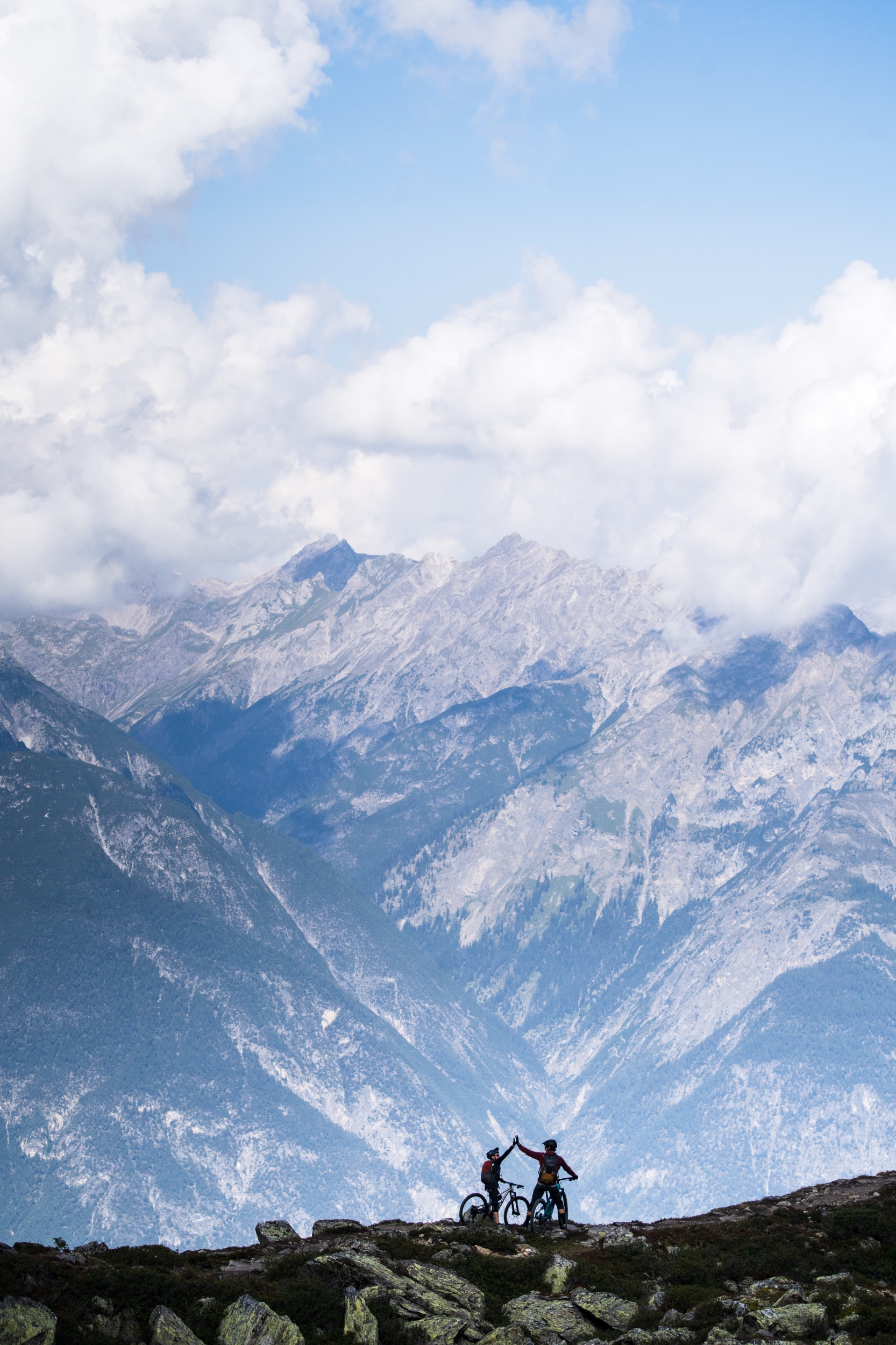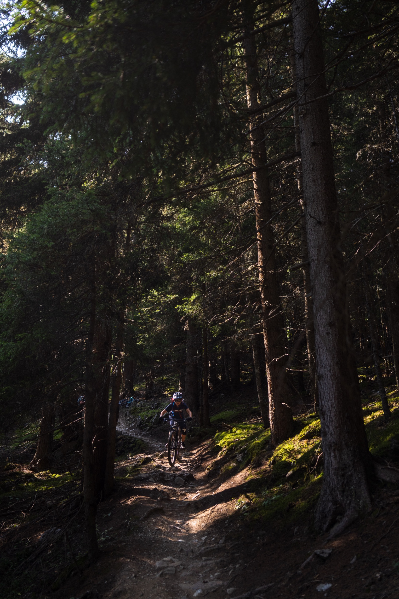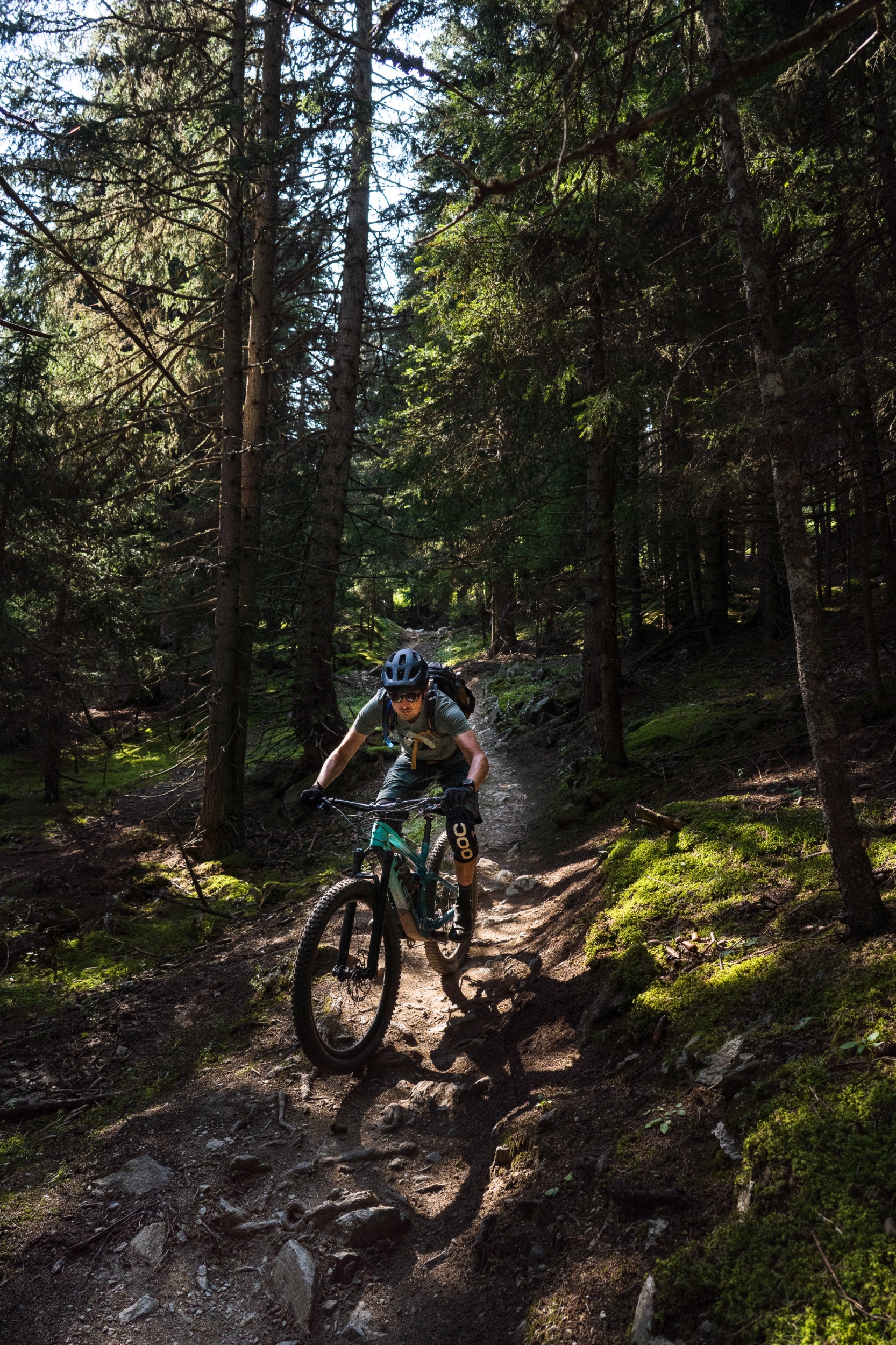 Der erste Abschnitt des Trails hinunter bis zu den Speicherseen ist geprägt von einer beeindruckenden, hochalpinen Kulisse mit tiefen Blicken hinab ins Inntal. Der Trail ist insgesamt sehr flowig und schnell zu fahren, weist aber trotzdem den Charakter eines natürlichen Bergpfads auf, steinig, manchmal geröllig, manchmal felsig, ganz selten leicht verblockt, alles in allem sehr verspielt, fordernd aber nie überfordernd. Fortgeschrittenere Biker:innen finde viele kleinere und größere Wellen sowie natürliche Hindernisse vor, die immer wieder zum Springen einladen. Teilweise fühlt man sich wie auf einer nicht enden wollenden Murmelbahn. Der Spaßfaktor ist richtig hoch. Da sind wir beiden uns schnell einig.