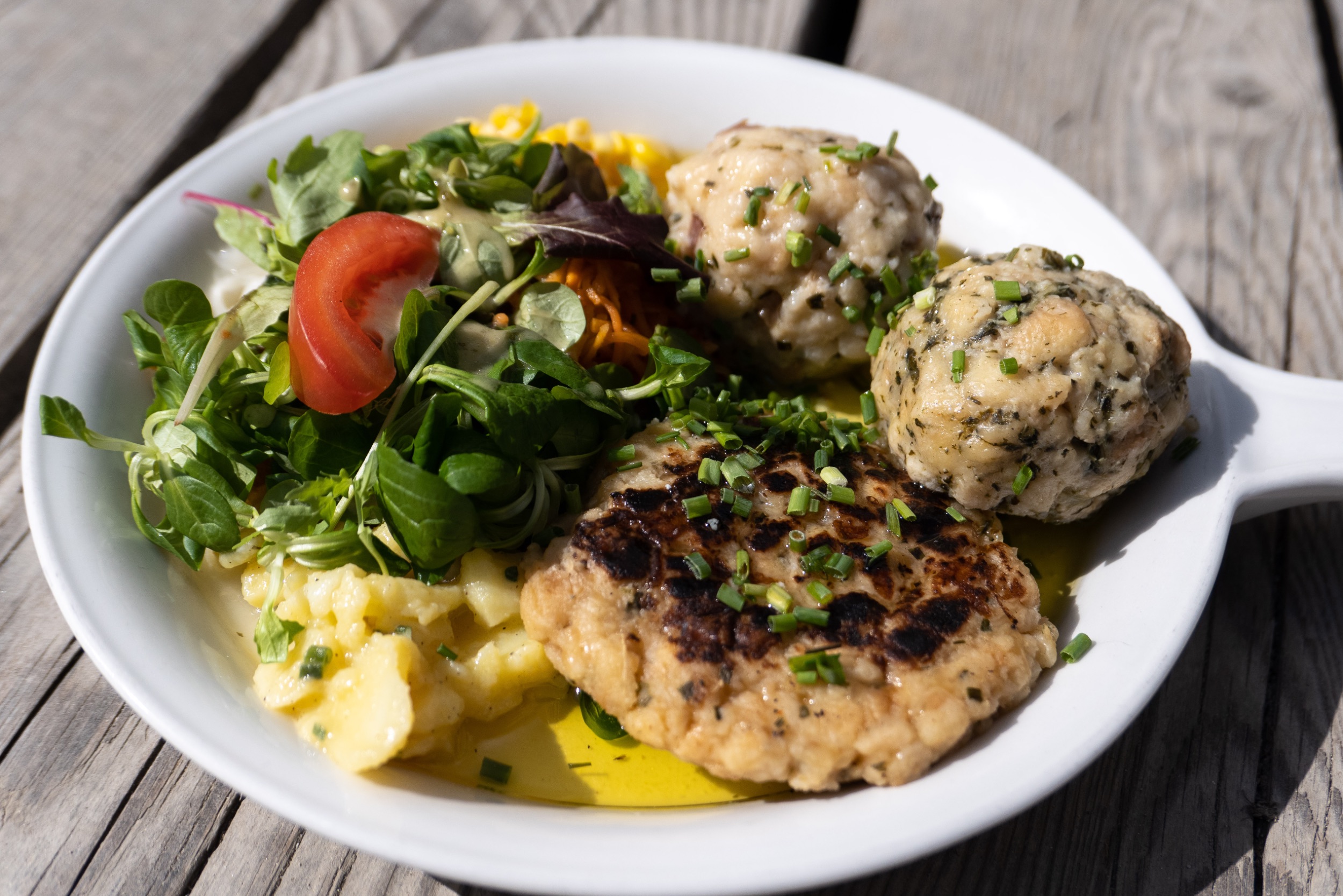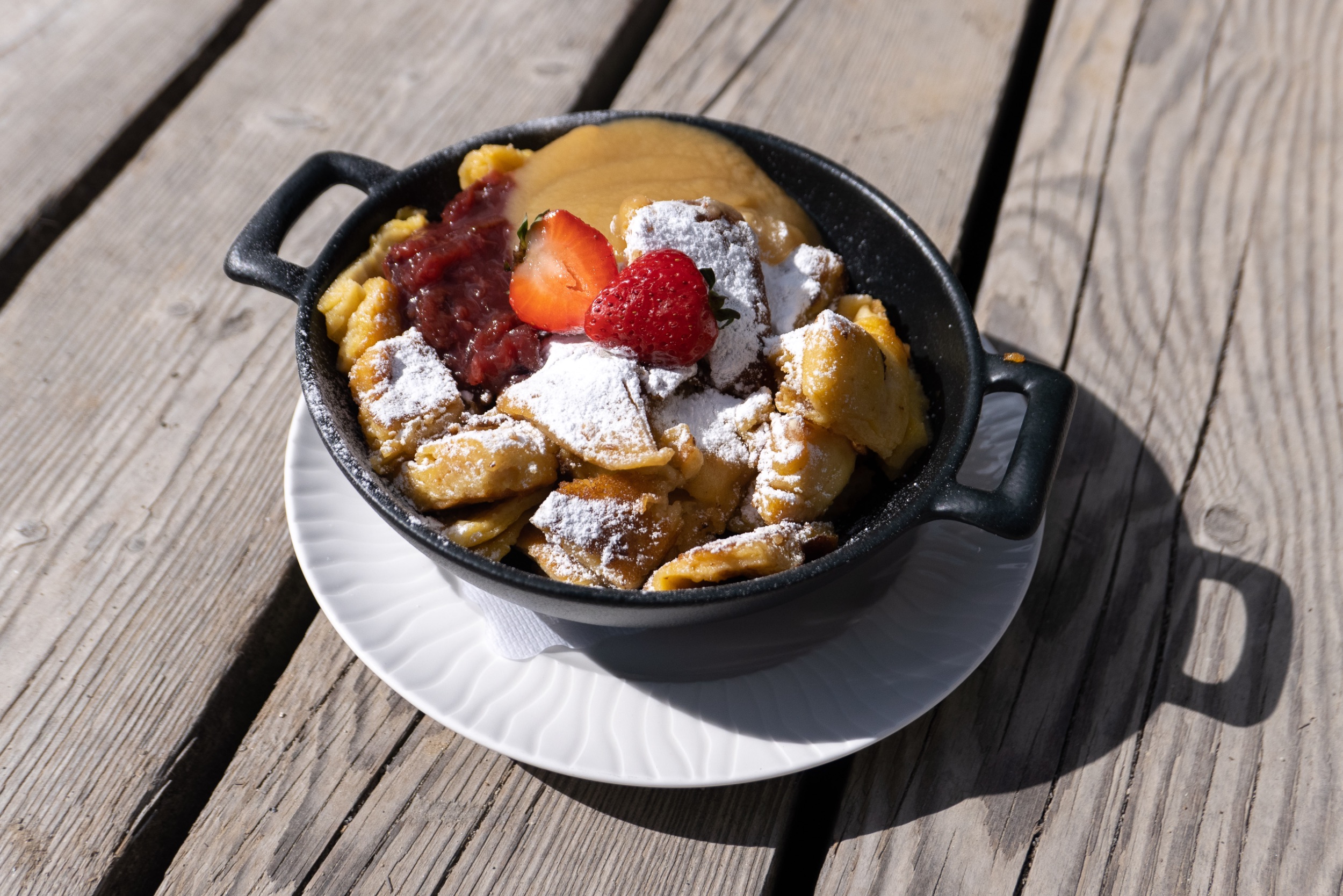 Die ersten Meter auf dem sich anschließenden Zirbentrail fährt er mit angezogener Handbremse. Offensichtlich sitzt ihm ein wenig die Angst eines weiteren Platten im Nacken. Aber das verliert sich ganz schnell, denn der neue Trail absorbiert ihn komplett. Flowig schlängelt er sich durch den zauberhaften Zirbenwald und lädt mit mehreren North Shore Elementen, Doubles und Mini Tables zum Spielen ein. Viel zu schnell spuckt uns der spaßige Flowtrail direkt oberhalb der idyllischen Schöngampalm aus. Aber genau zur rechten Zeit, denn unsere Mägen sind schon richtig am Knurren. Leckeres Knödeltris und Kaiserschmarrn füllen die leeren Energiespeicher wieder auf.