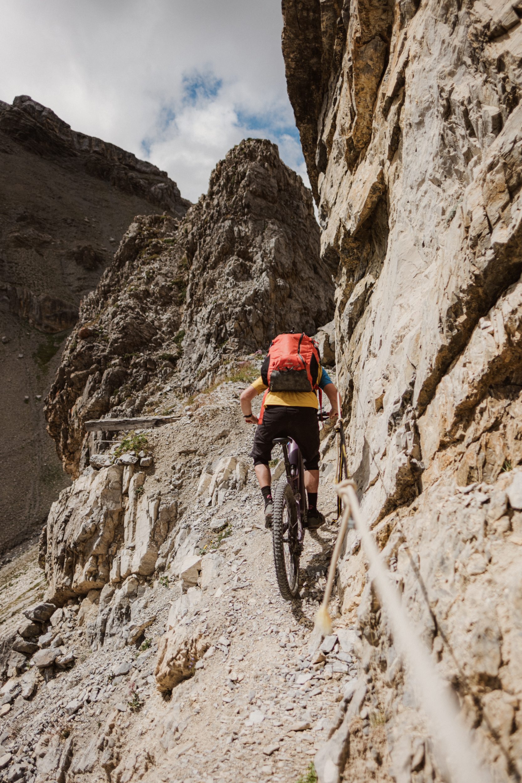 Ein neuralgischer Punkt ist der „gespaltene Fels“. Das italienische Militär sprengte die Straße damals in die Felswand. An einer Stelle blieb bis heute ein schmaler Felssporn wie ein Messer stehen. Direkt davor ist der Weg abgebrochen. Ein Fixseil dient als Handlauf. Ich wage die Passage. Der Lenker schabt haarscharf am Fels, der Blick klebt auf dem schmalen Pfad. Nicht einfädeln. Bloß nicht. Schrittgeschwindigkeit. Zwei kräftige Tritte, dann mit Schwung – drüben. Der Puls hämmert, ich bin hellwach.