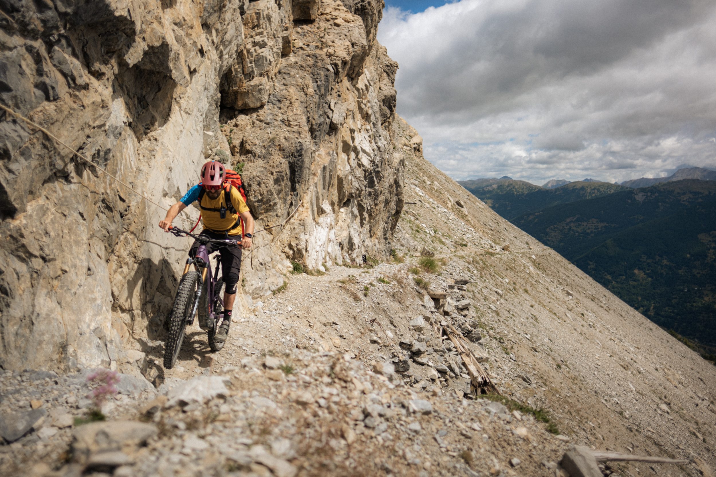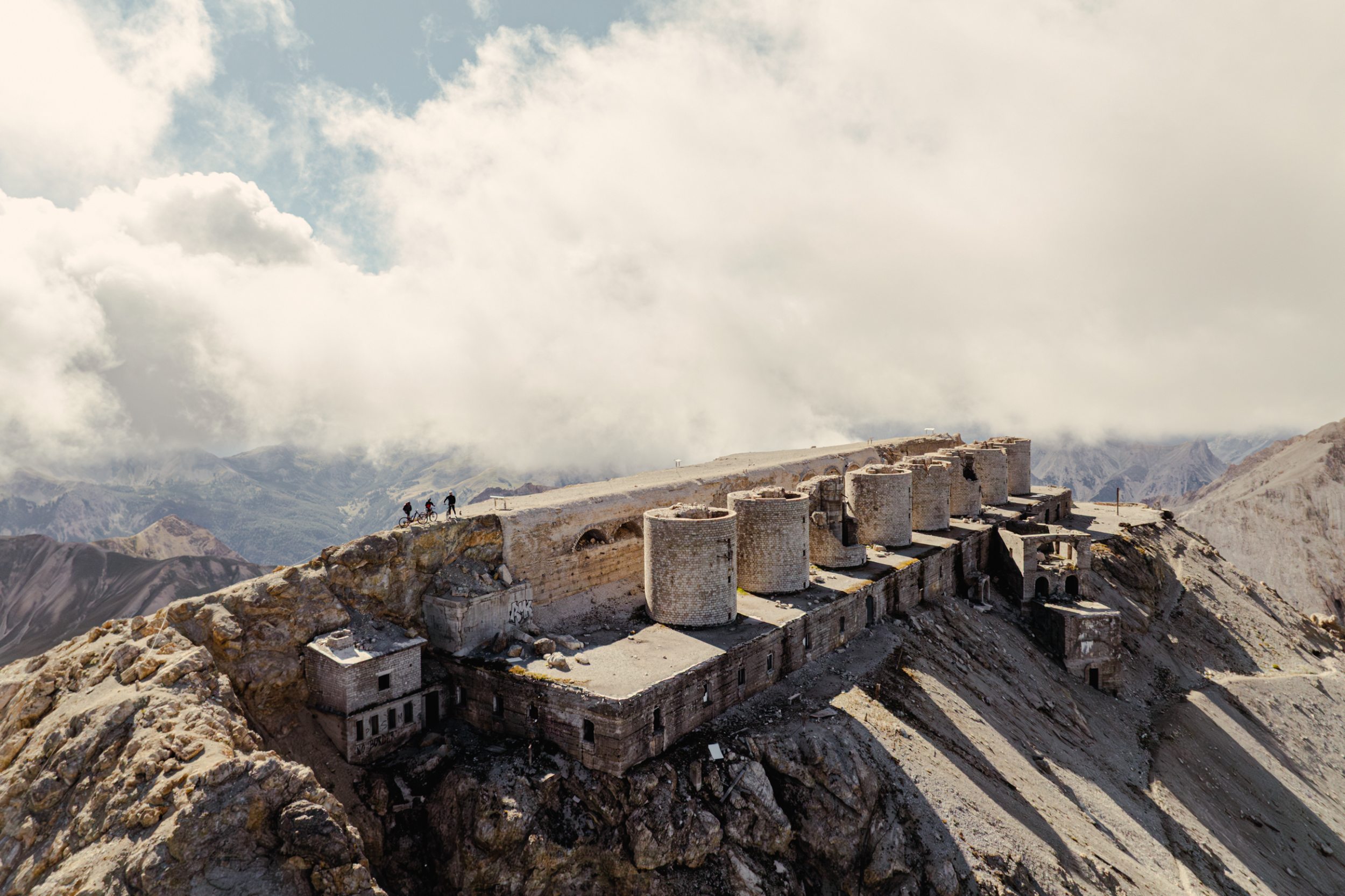 Militärbauten gibt es hier auf fast jedem Berg. Der eindrucksvollste von allen steht auf über 3.000 Meter auf dem Gipfel des Monte Chaberton. Acht gigantische Geschütztürme ragen auf der Spitze des Berges in die Höhe und verleihen dem Gipfel den Anschein einer Königskrone. Sein Spitzname: König der Cottischen Alpen. Von unserem Dachzelt aus wirkt der Chaberton zum Greifen nahe, obwohl er Luftlinie zehn Kilometer entfernt ist. „Da will ich die nächsten Tage rauf – mit dem Bike,“ schwärme ich vor mich hin. Als Mountainbike-Tour gehört der Monte Chaberton zu den Seven Summits der Alpen. Ein Muss für versierte Trail-Biker, die einen beschwerlichen Aufstieg zugunsten einer gigantischen Abfahrt jederzeit in Kauf nehmen.