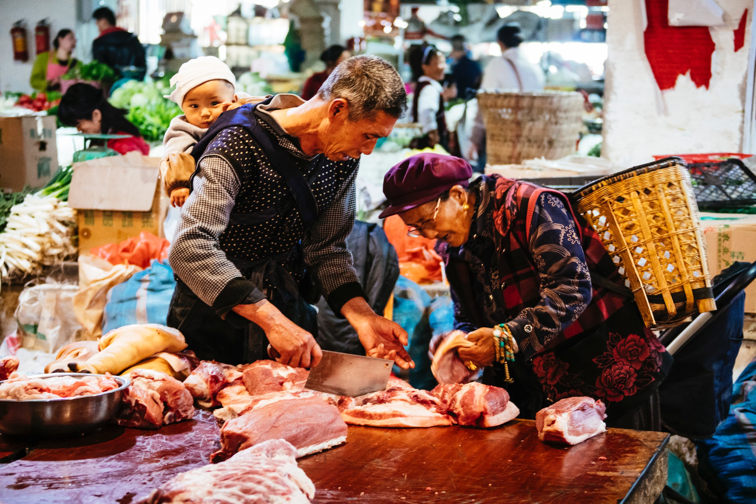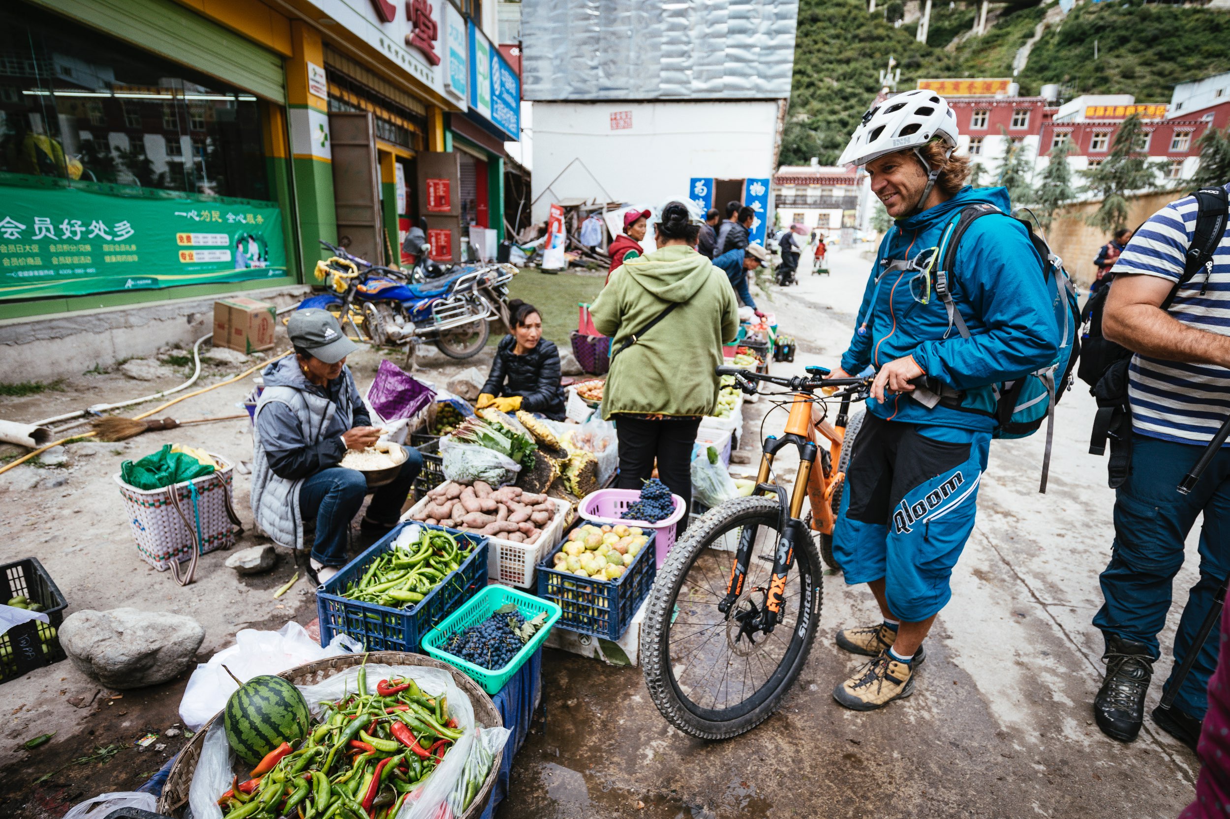 Am nächsten Morgen geht es zum Einkaufen auf den riesigen Markt in Deqin. Recht verloren stehen wir da, weil niemand von uns eine Ahnung hat, wie viel Lebensmittel wir brauchen werden. Zum Frühstück wird es Nudelsuppe, mittags Kekse und Schokolade geben, abends Reis und Gemüse. So der Essensplan. Nur nicht zu wenig einkaufen, hungern unterwegs ist nicht gut. Vor allem nicht bei Anstrengung. In großen, weißen Säcken transportieren wir unseren Einkauf zu dem winzigen Bus. Vollgepackt bis unters Dach reicht der Platz nicht für uns alle. Daher schwingen wir uns auf die Räder. Der Bus fährt vor, die Ware wird ausgeladen, dann sammelt der Fahrer uns am Straßenrand ein, um zum Treffpunkt mit den Pferden in einem kleinen tibetischen Bergdorf zu gelangen. Wir haben unten im Tal die Grenze nach Osttibet passiert, welche nur durch einen spärlich besetzten Checkpoint in einem winzigen Zelt am Straßenrand erkennbar ist. Die Beamten kontrollierten kurz unsere Ausweise und haben sonst keinerlei Interesse an uns.
