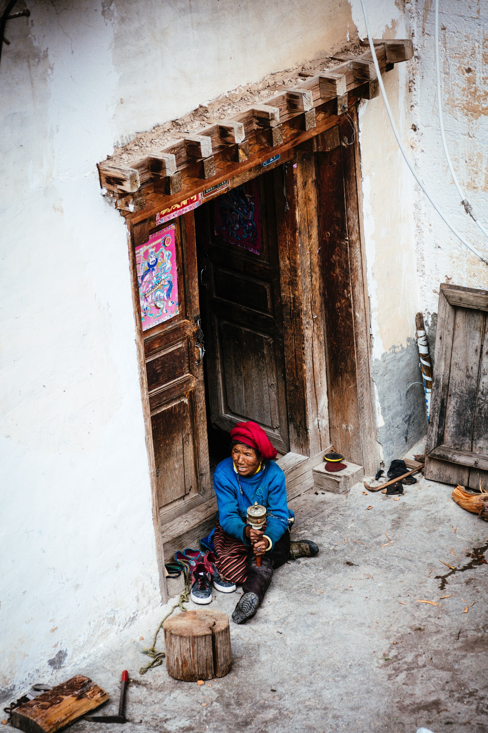 Der Trail führt steil im Zickzack hinunter. Unsere Spitzkehrentechnik wird mal wieder auf die Probe gestellt. Der Wald lichtet sich und wir kommen an einen reißenden Fluss. Etwas überrascht über die Szenerie überqueren wir eine Brücke und folgen dem Weg flussabwärts. Noch größer ist unsere Überraschung, als das erste Haus seit fünf Tagen am Wegesrand stehen sehen. Und tatsächlich haben wir hier im ersten Stock ein Lager für uns. Nach den Tagen in feuchten und schäbigen Holzbaracken genießen wir die unerwartet saubere Abwechslung. Bis hierher haben wir nicht mehr als 20 Leute getroffen. Rund um die kleine Behausung tummeln sich etwa genauso viele. Im Untergeschoß befindet sich ein kleiner Lebensmittelladen. Zum Transport der Ware werden bunt geschmückte und mit riesigen Lautsprechern bestückte Motorräder verwendet. Auch müde Pilger können den Weg über den letzten Pass auf diesen zurücklegen. Natürlich begleitet von chinesischer Folklore Musik in ohrenbetäubender Lautstärke. In uns keimt die Hoffnung auf einen durchwegs fahrbaren Weg.