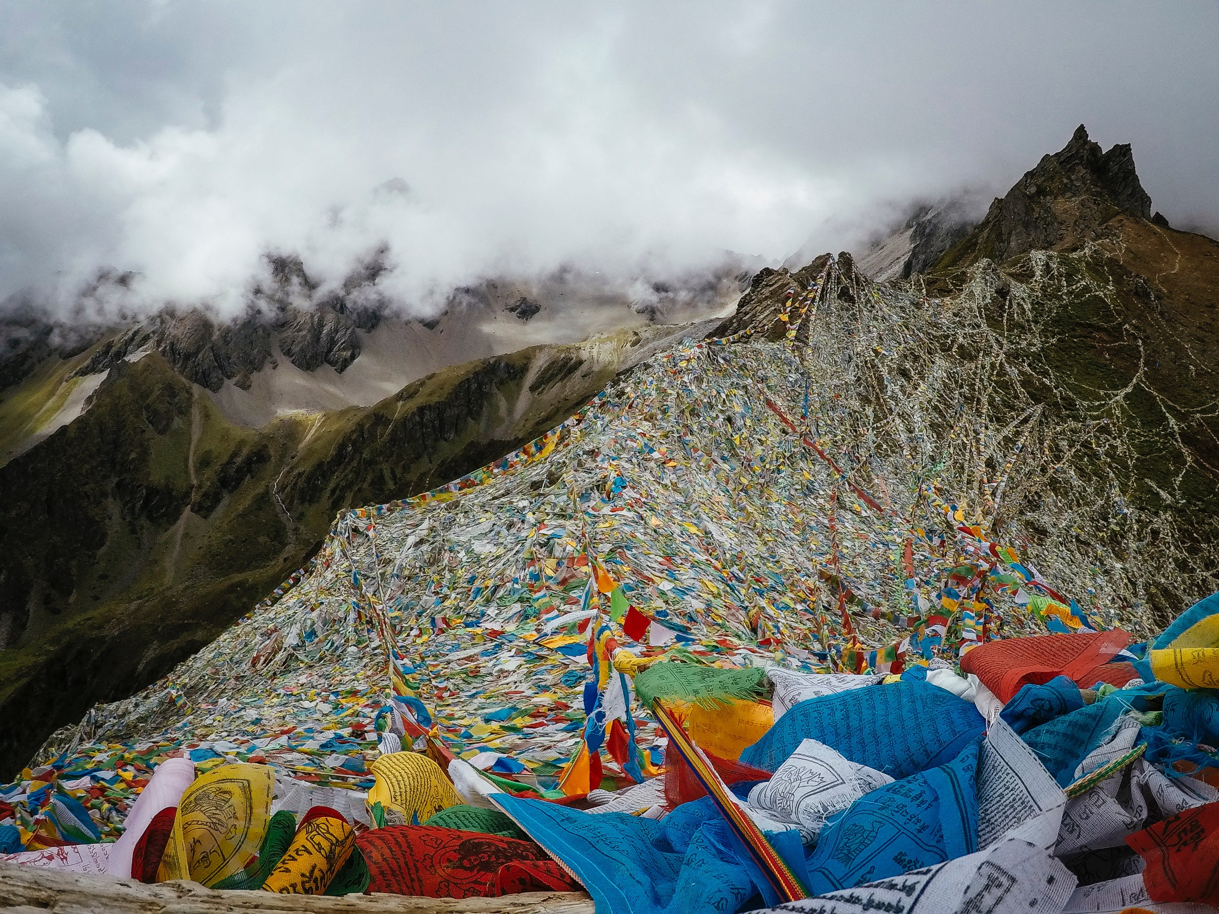 Ein früher Start mit Regen läutet den nächsten Tag ein. Ganz langsam gehen wir los, um einen Rhythmus zu finden. Die Luft wird zunehmend dünner und wir atmen schwer. An Fahren ist mal wieder nicht zu denken, zu steil führt der Weg zum schon bald sichtbaren Passübergang. Erst hier oben ist die Waldgrenze, auf etwa 4.000 Metern. Zuhause in den Alpen gibt es auf dieser Höhe nur noch Schnee und Eis. Die Gruppe zieht sich etwas auseinander, jeder geht seinen eigenen Takt. Schon weit vor der höchsten Erhebung beginnen Girlanden aus Gebetsfahnen uns den Weg zu weisen. Der Regen lässt ein wenig nach und wir schleppen uns schwer atmend über einen Teppich aus bunten Stofffahnen. Der Boden ist nicht mehr zu sehen, alles ist übersät mit Milliarden von „Windpferden“, so die korrekte Übersetzung aus dem Tibetischen. Die Bergwelt ist hier schroff und wolkendurchzogen. 4.500 Meter zeigt mein GPS Gerät hier am Duokha La an. Der höchste Punkt unserer Pilgerfahrt ist erreicht!