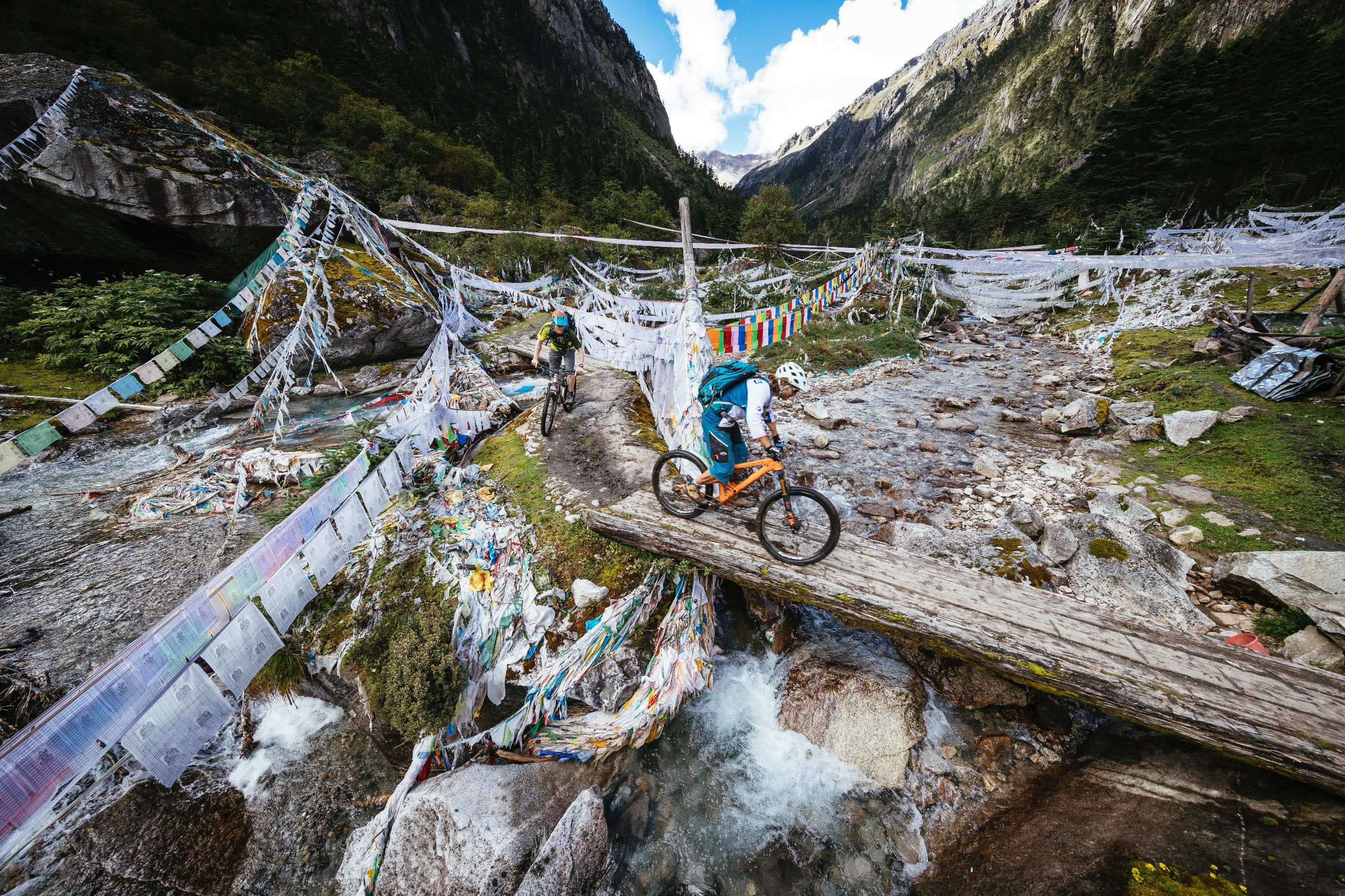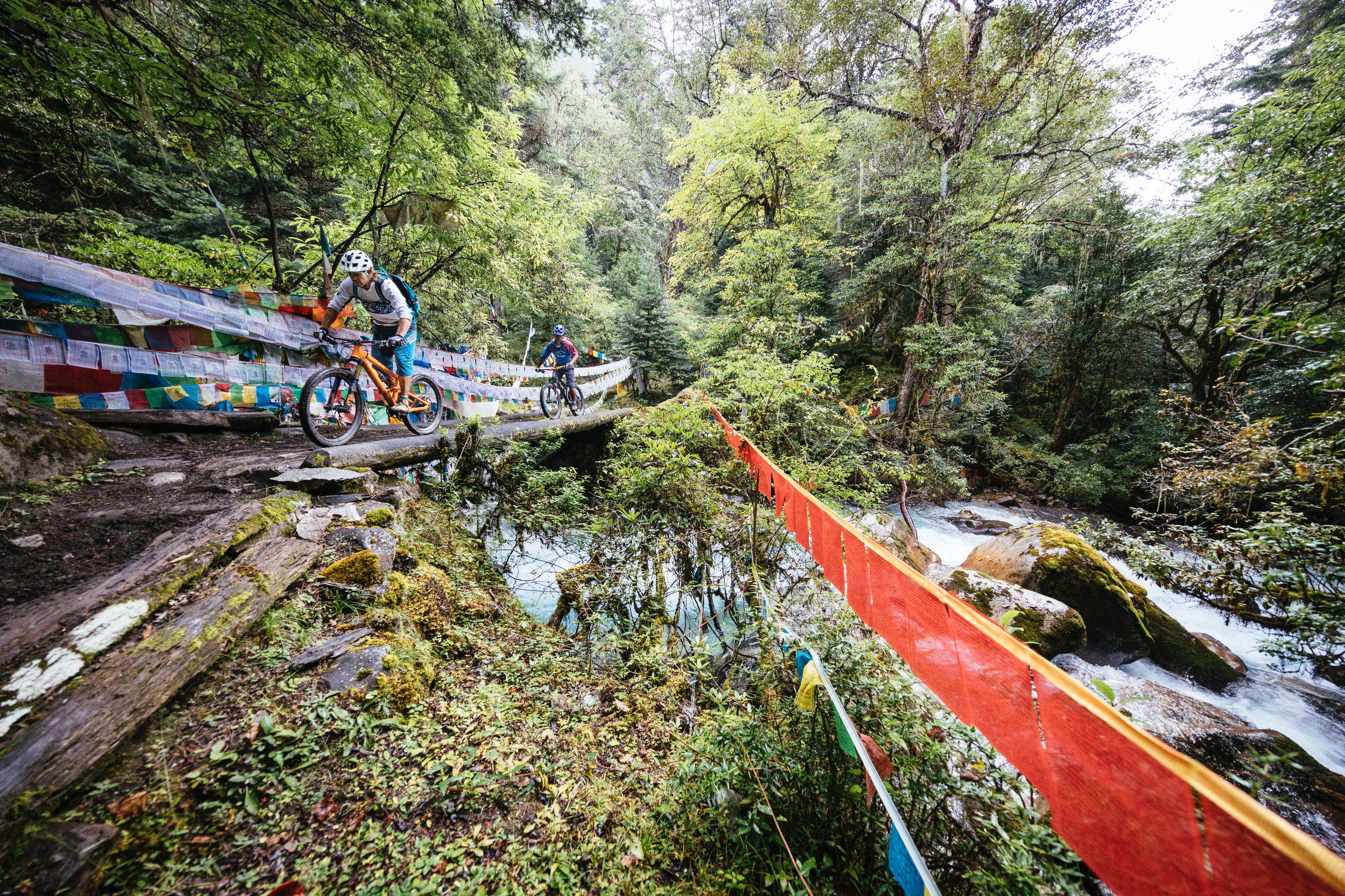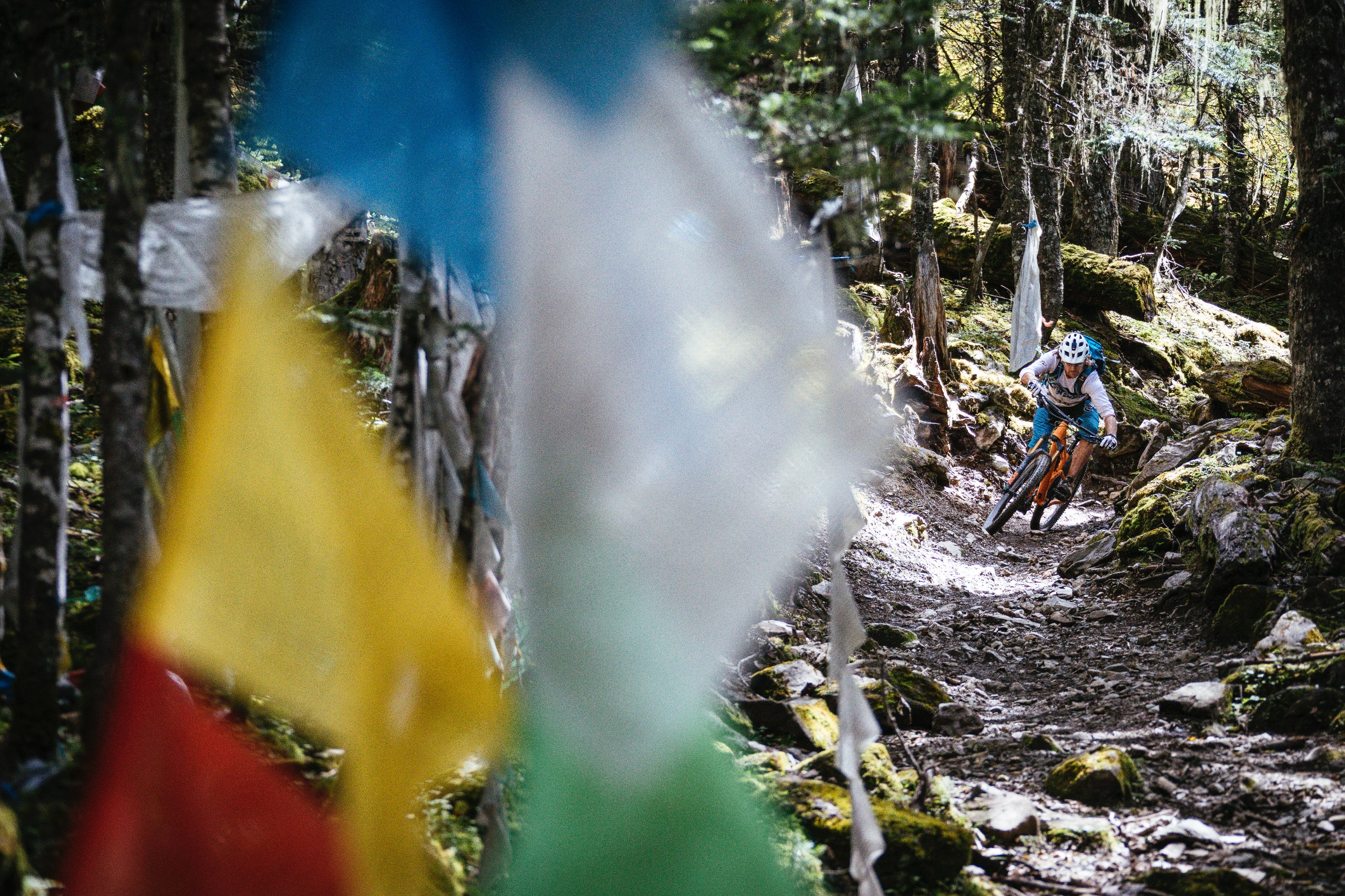 Wir klatschen ab, treten in die Pedale und sofort tauchen wir in eine völlig andere Welt. Wie in einer Achterbahn schlängelt sich der Weg hinab in den Wald in einen Tunnel aus Gebetsfahnen. Tausende von ihnen hängen, in bunten Farben wehend, rechts und links am Wegesrand des etwa 50 Zentimeter breite, glatt getrampelten Pfades. Es fühlt sich an, als würde man mit Hochgeschwindigkeit durch einen Farbkasten rauschen. Als wenn ein Reset-Knopf im Kopf gedrückt würde und auf „jetzt und hier“ geschalten wird. Die Gefühle überschlagen sich. Erst nach einer gefühlten Ewigkeit halten wir kurz an. Alle vier strahlen wir übers ganze Gesicht, fallen uns in die Arme und können unserer Freude kaum Ausdruck verleihen. Überirdisch ist das einzige Wort, auf welches wir uns einigen können, um den Weg zu beschreiben. Es ist das Eindrucksvollste, das wir je gefahren sind. Wenn es nur im Ansatz die nächsten Tage so weitergeht, dann wird es ein Riesenspaß.