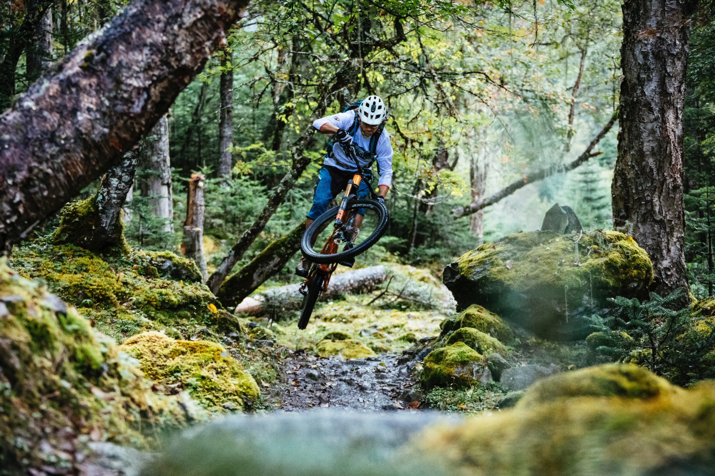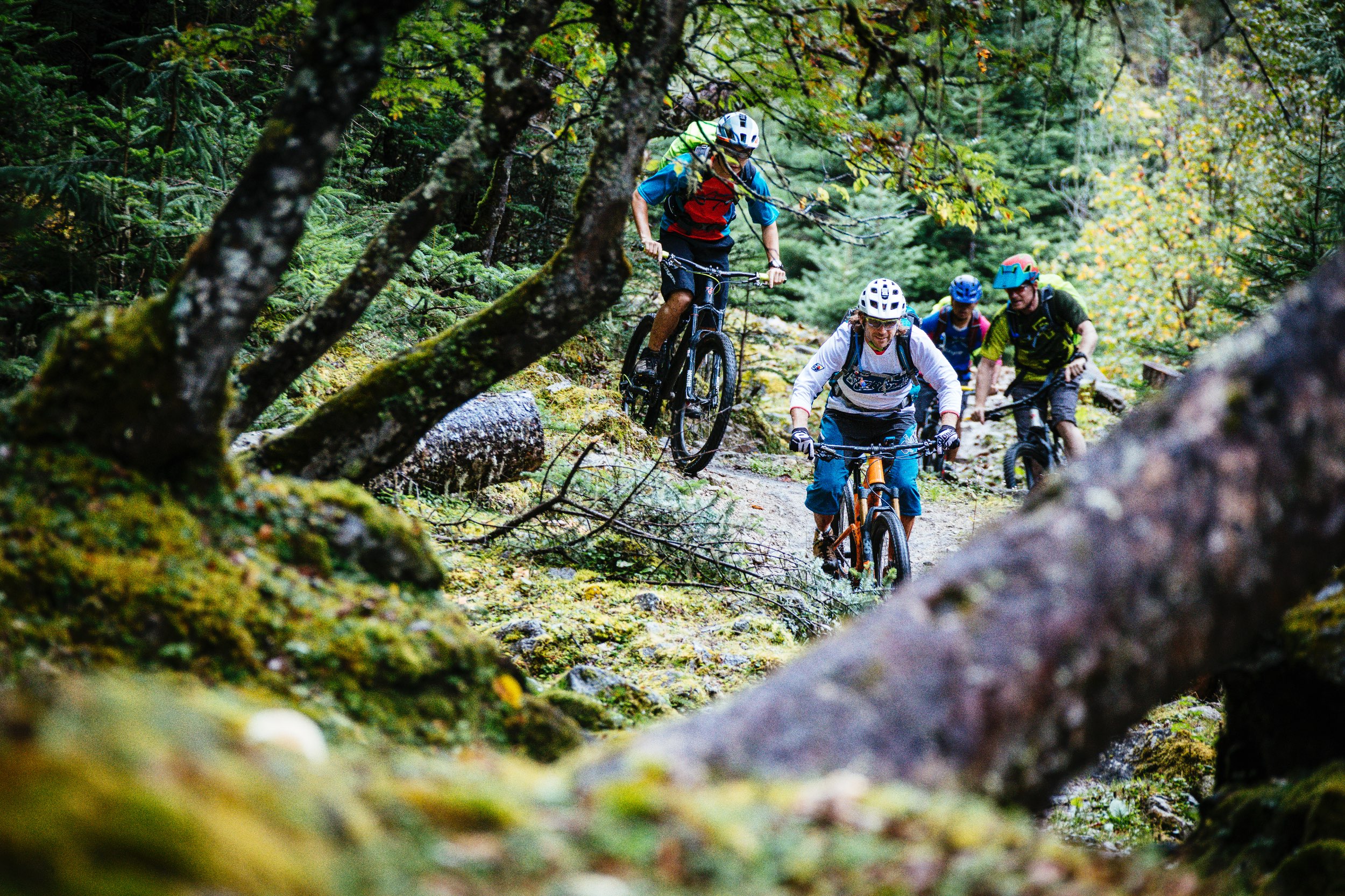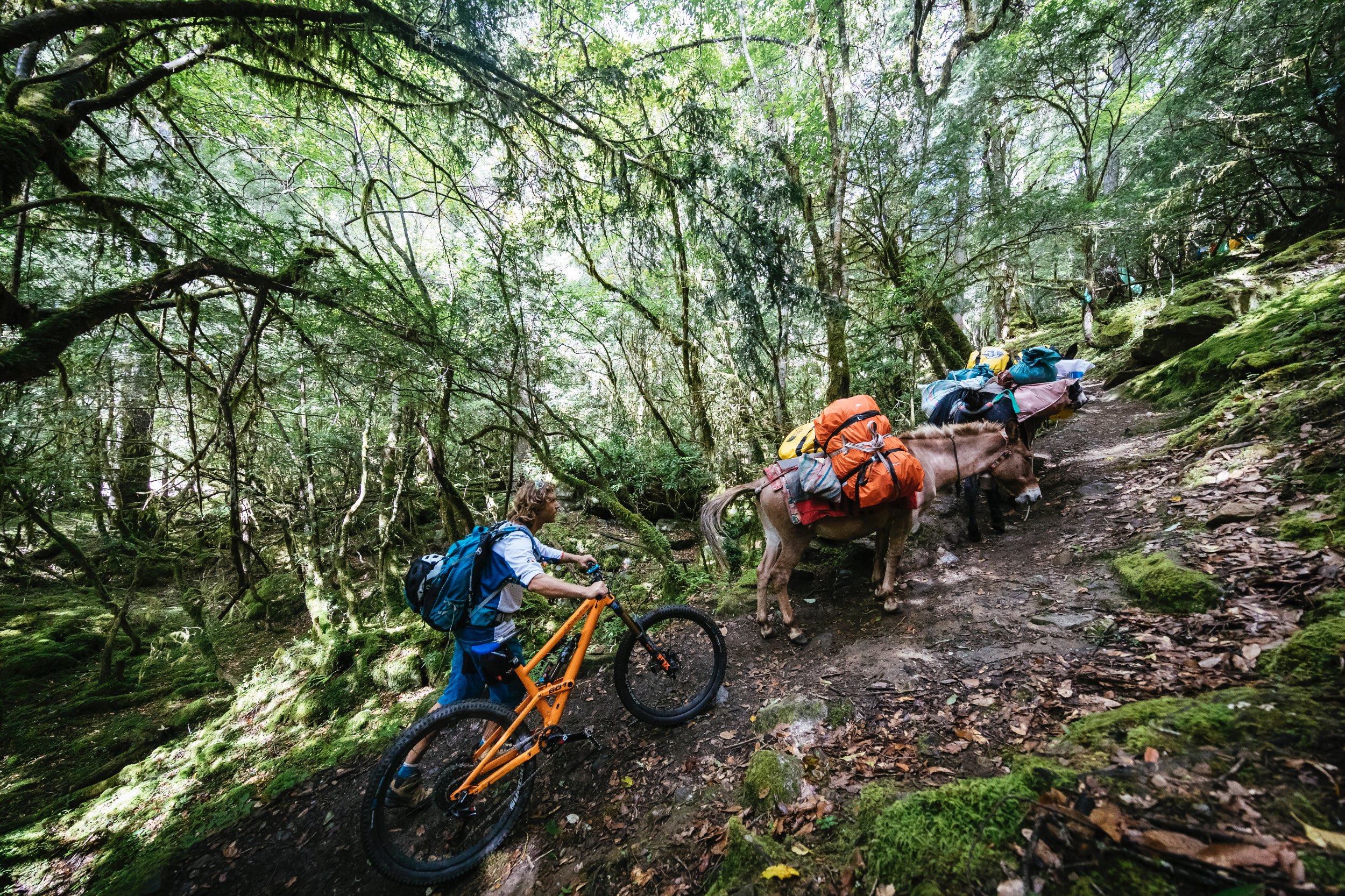 Wir klatschen ab, treten in die Pedale und sofort tauchen wir in eine völlig andere Welt. Wie in einer Achterbahn schlängelt sich der Weg hinab in den Wald in einen Tunnel aus Gebetsfahnen. Tausende von ihnen hängen, in bunten Farben wehend, rechts und links am Wegesrand des etwa 50 Zentimeter breite, glatt getrampelten Pfades. Es fühlt sich an, als würde man mit Hochgeschwindigkeit durch einen Farbkasten rauschen. Als wenn ein Reset-Knopf im Kopf gedrückt würde und auf „jetzt und hier“ geschalten wird. Die Gefühle überschlagen sich. Erst nach einer gefühlten Ewigkeit halten wir kurz an. Alle vier strahlen wir übers ganze Gesicht, fallen uns in die Arme und können unserer Freude kaum Ausdruck verleihen. Überirdisch ist das einzige Wort, auf welches wir uns einigen können, um den Weg zu beschreiben. Es ist das Eindrucksvollste, das wir je gefahren sind. Wenn es nur im Ansatz die nächsten Tage so weitergeht, dann wird es ein Riesenspaß.
