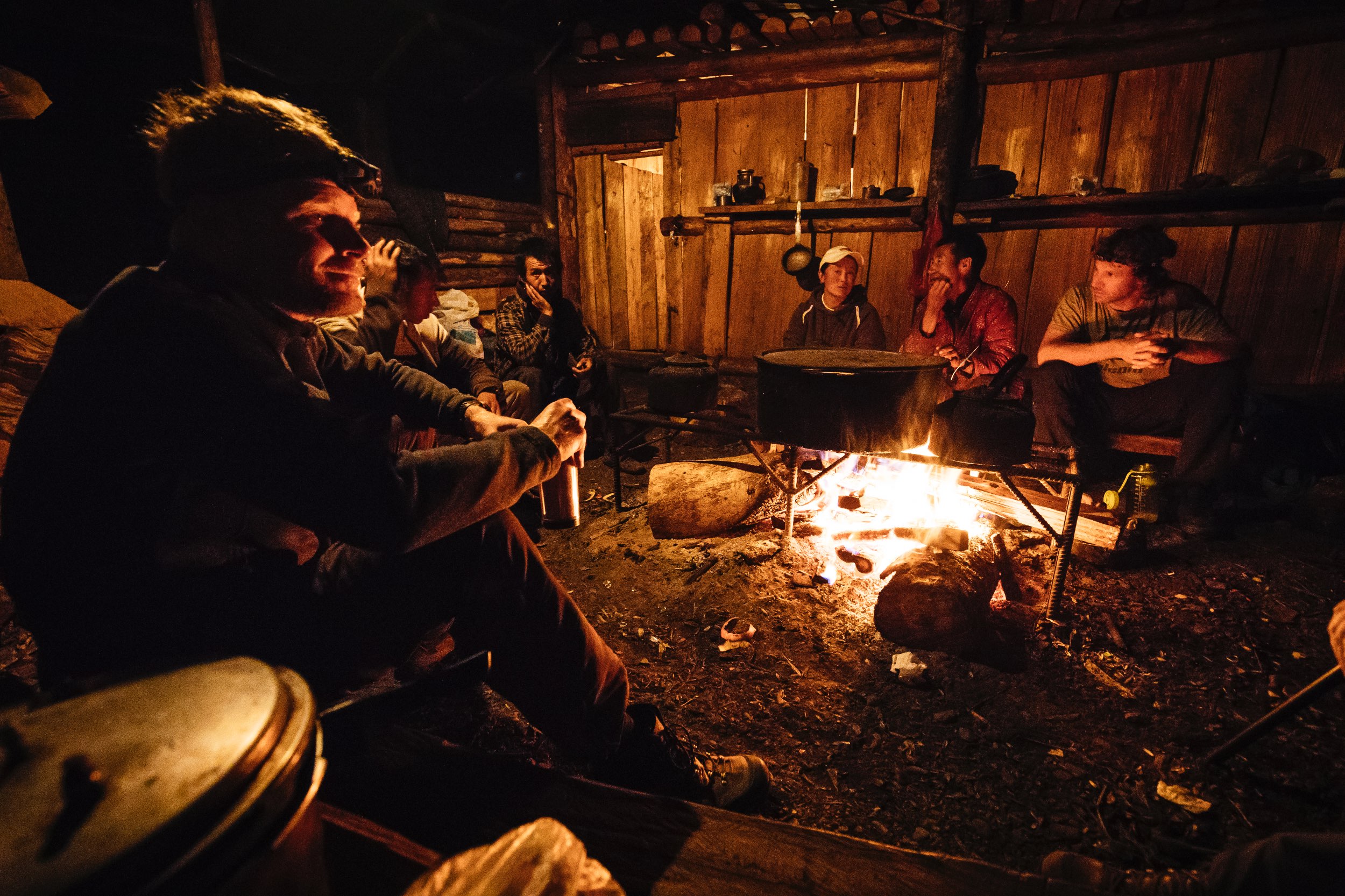 An einer halb verfallenen Holzbaracke im dichten Wald holen wir die Pferde ein. Es ist schon dunkel. Das ist unser Lagerplatz. In einem Unterschlupf brennt ein Lagerfeuer. Küche und Aufenthaltsraum sind hier vereint. Hinter der Hütte rauscht ein Bach. Ein paar aufgerichtete Holzstämme sind mit Plastikplanen überzogen und stellen unser Schlafzimmer dar. Auf Holzpritschen liegen alte Matratzen und feuchte Decken. Wir legen unsere Schlafsäcke darüber. Unsere tibetischen Begleiter kochen mit uns gemeinsam. Keiner von uns kann ihre tibetischen Namen aussprechen und so taufen wir sie kurzerhand Annemarie und Hans, was ihnen sichtlich Freude bereitet. Großes Gelächter am ersten Abend einer Reise mit neuen Gefährten ist ein gutes Zeichen für eine entspannte Atmosphäre in den kommenden Tagen.