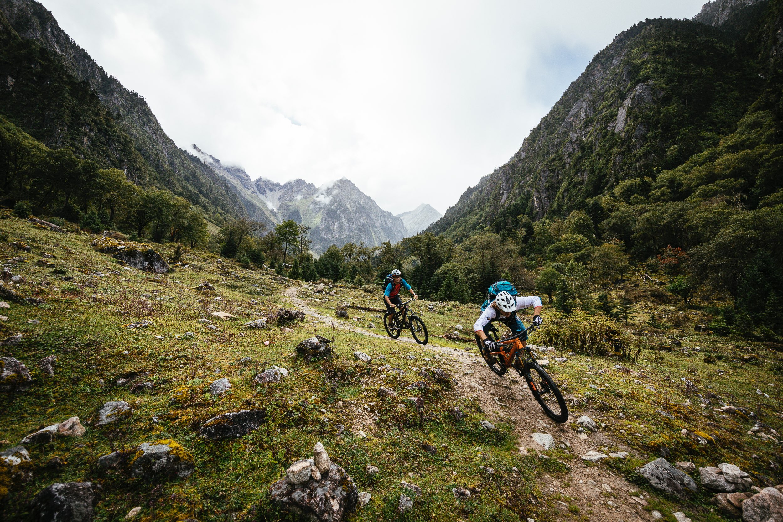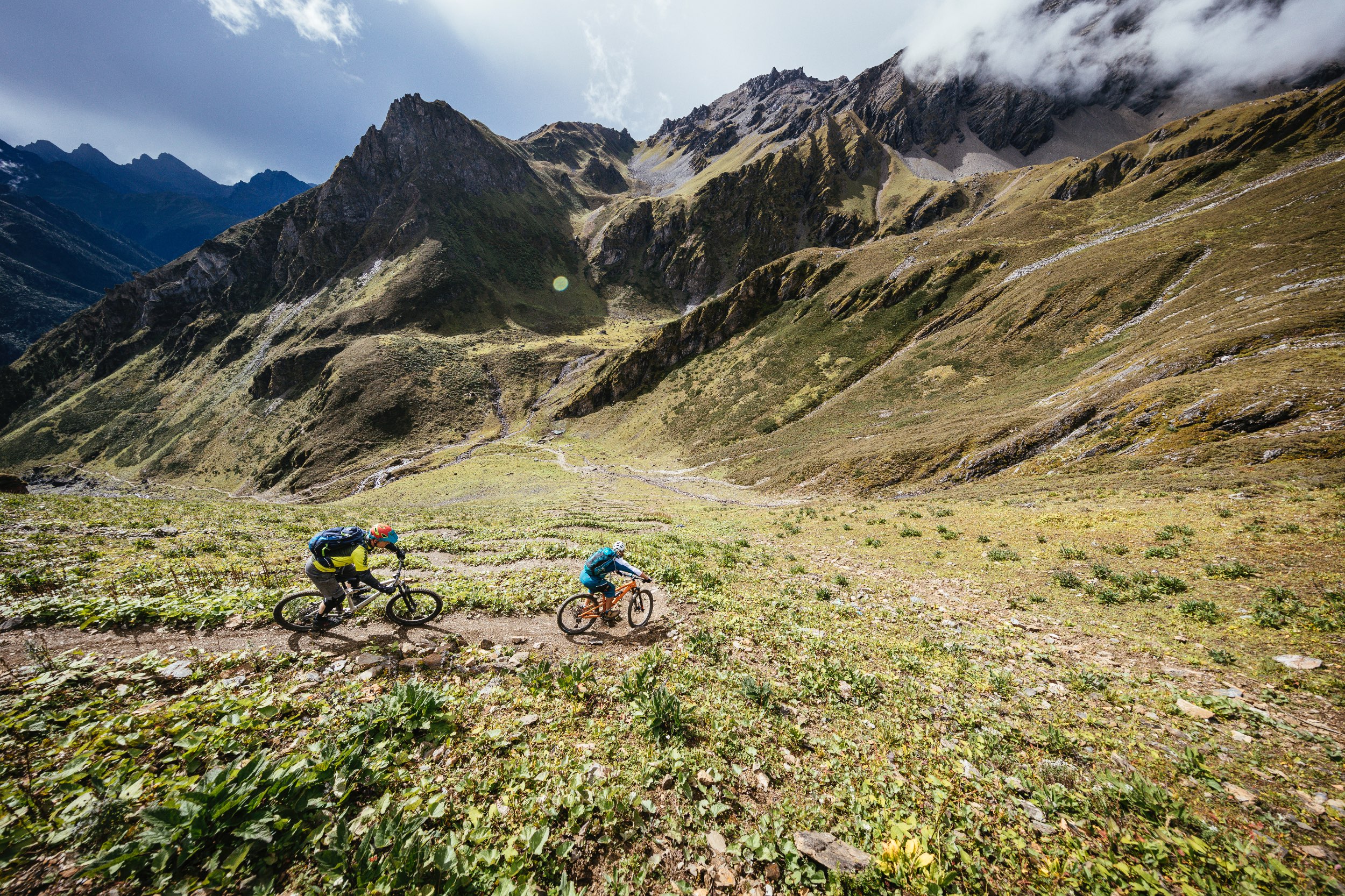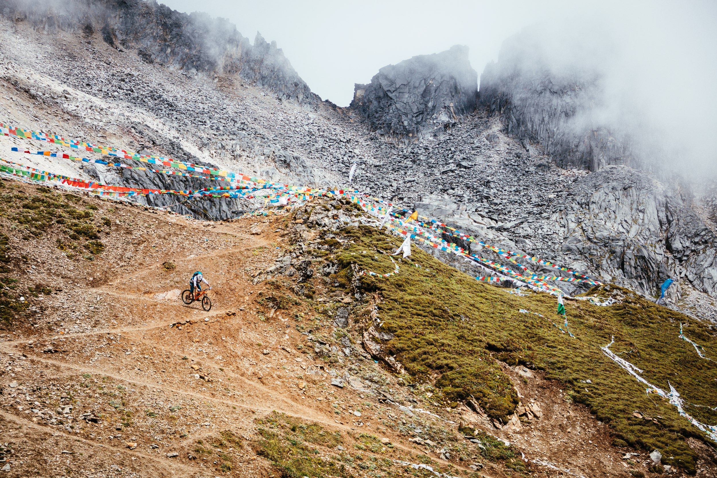 Ein dumpfes Grollen begleitet tiefschwarze Wolken und mahnt uns zum Aufbruch. Die ersten Meter schieben wir über den glitschigen Gebetsfahnenteppich hinunter, bis wir felsigen Untergrund erreichen. Wir blicken in ein tiefes Tal. Weit unten erkennen wir eine grüne Wiese mit einem Bach zwischen den steilen Felswänden. Dort hinunter führt uns ein anspruchsvoller Trail, der mit über 100 Spitzkehren volle Konzentration erfordert und an unseren Kräften zehrt. Das Gewitter hat sich verzogen und als wir unten ankommen scheint die Sonne. Wir legen die Bikes und uns selbst in die Wiese und gönnen uns ein paar Kekse. Wir blicken zurück zum Pass und sehen die imposante Abfahrt vor uns liegen. Erschöpft aber glücklich genießen wir die Aussicht, bevor wir die letzte halbe Stunde zum Lagerplatz rollen.