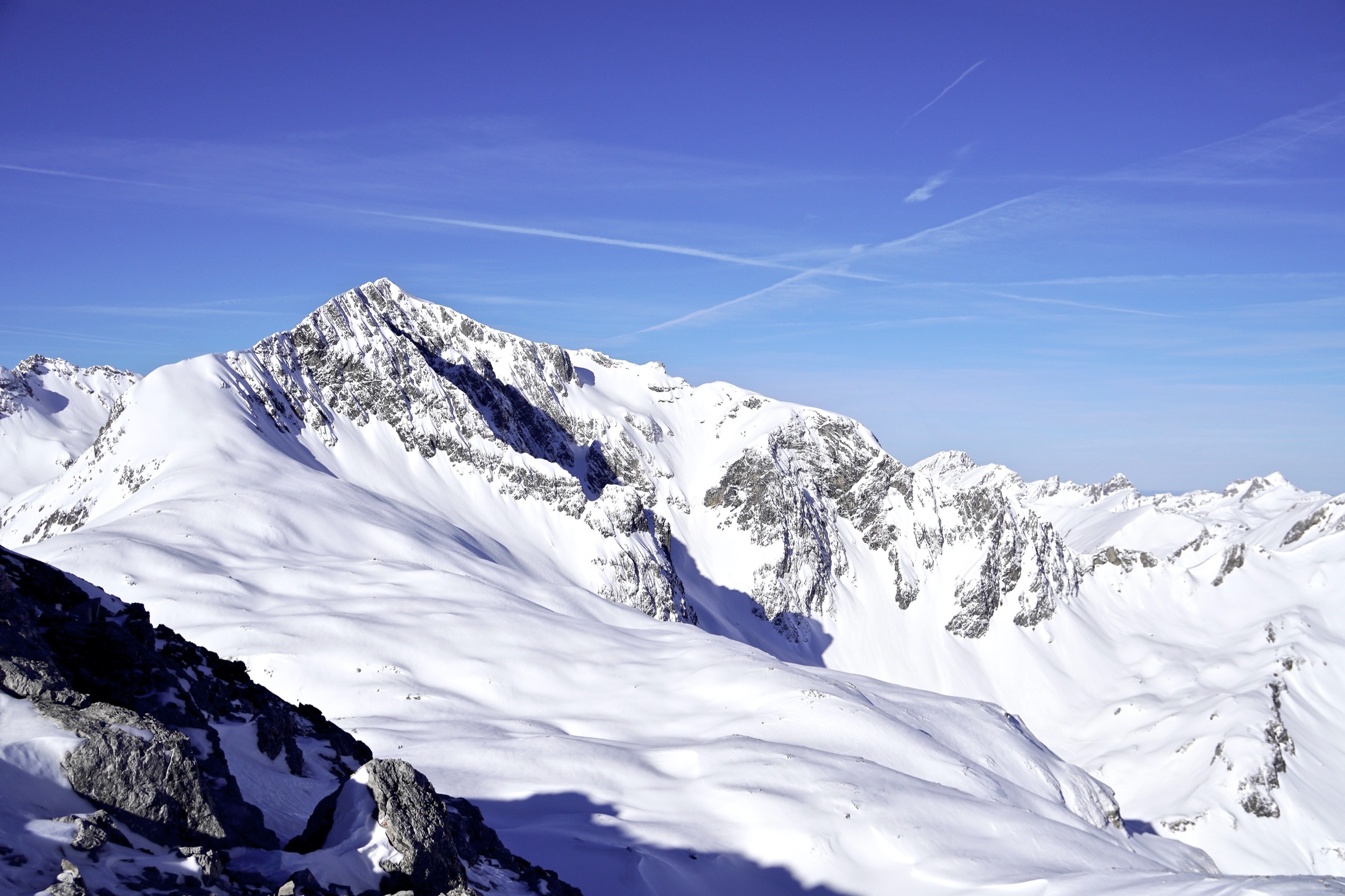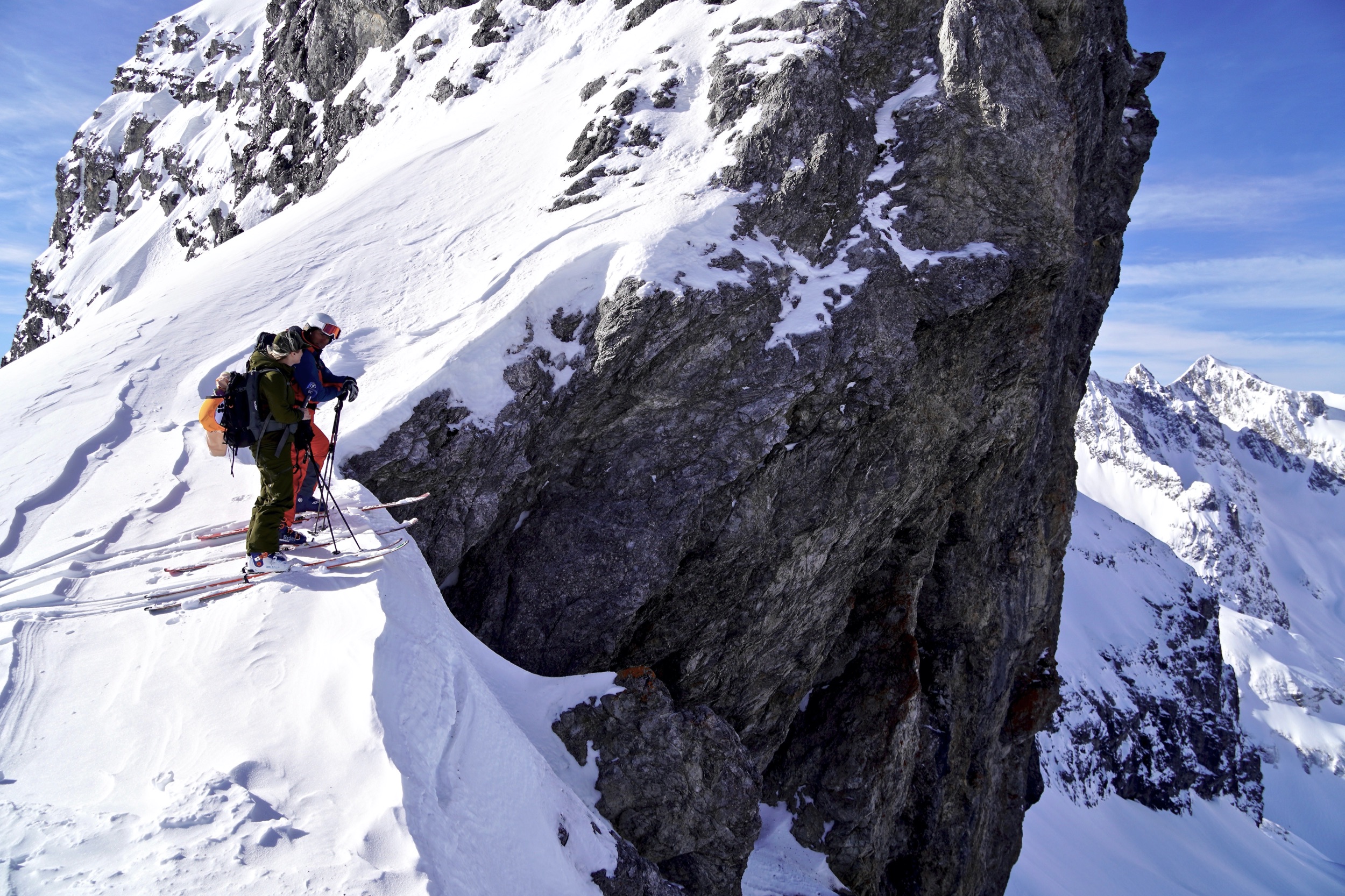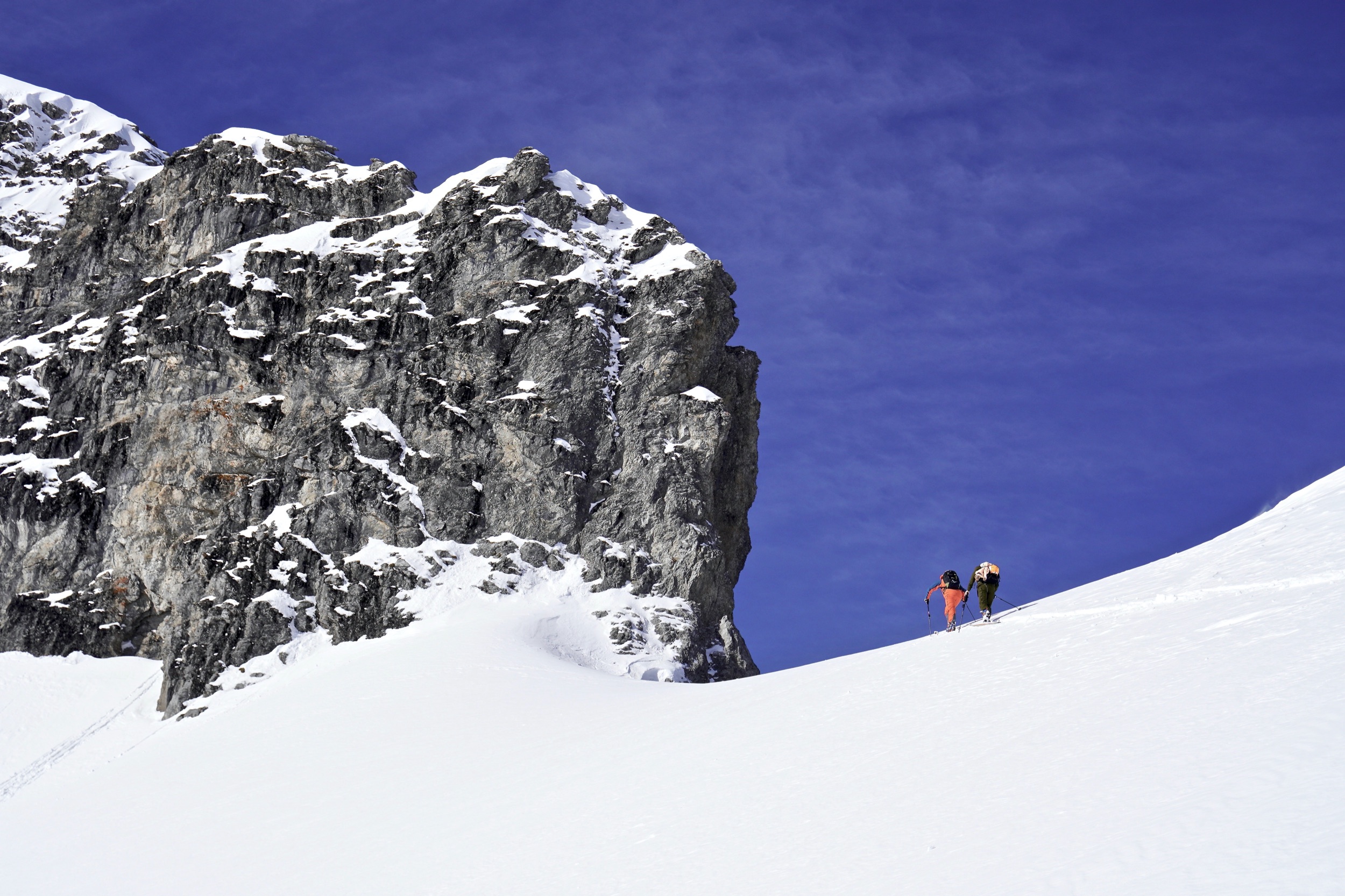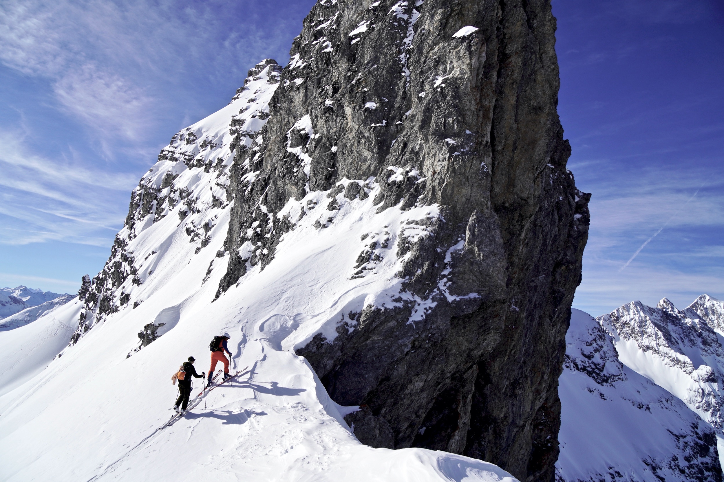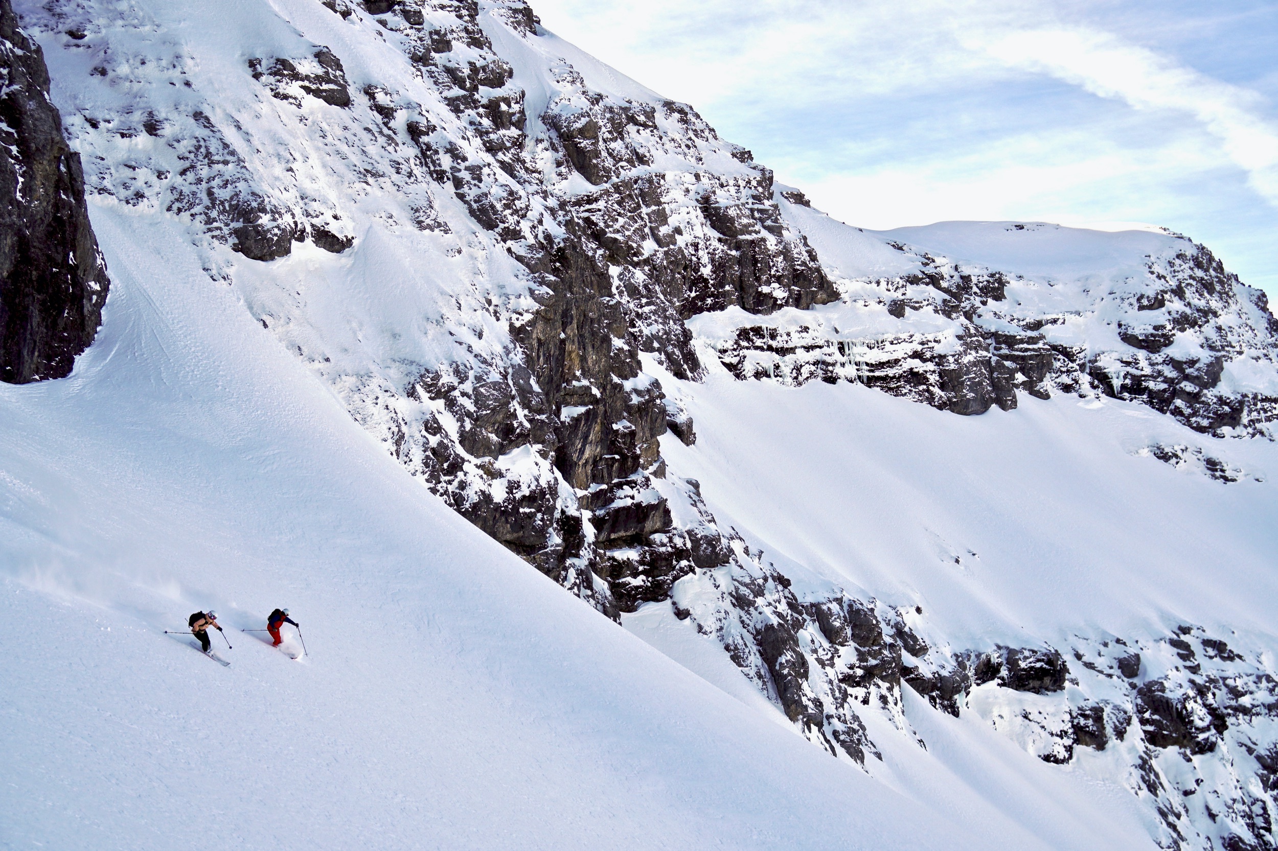 Die Abfahrt auf der Mohnenfluh-Nordseite ist felsdurchsetzt, windanfällig und lawinengefährdet. Ihr solltet euch entweder sehr gut auskennen und über entsprechende Lawinenausbildung verfügen, oder noch besser, einen Guide buchen. Zum Beispiel in Marcels Skischule.