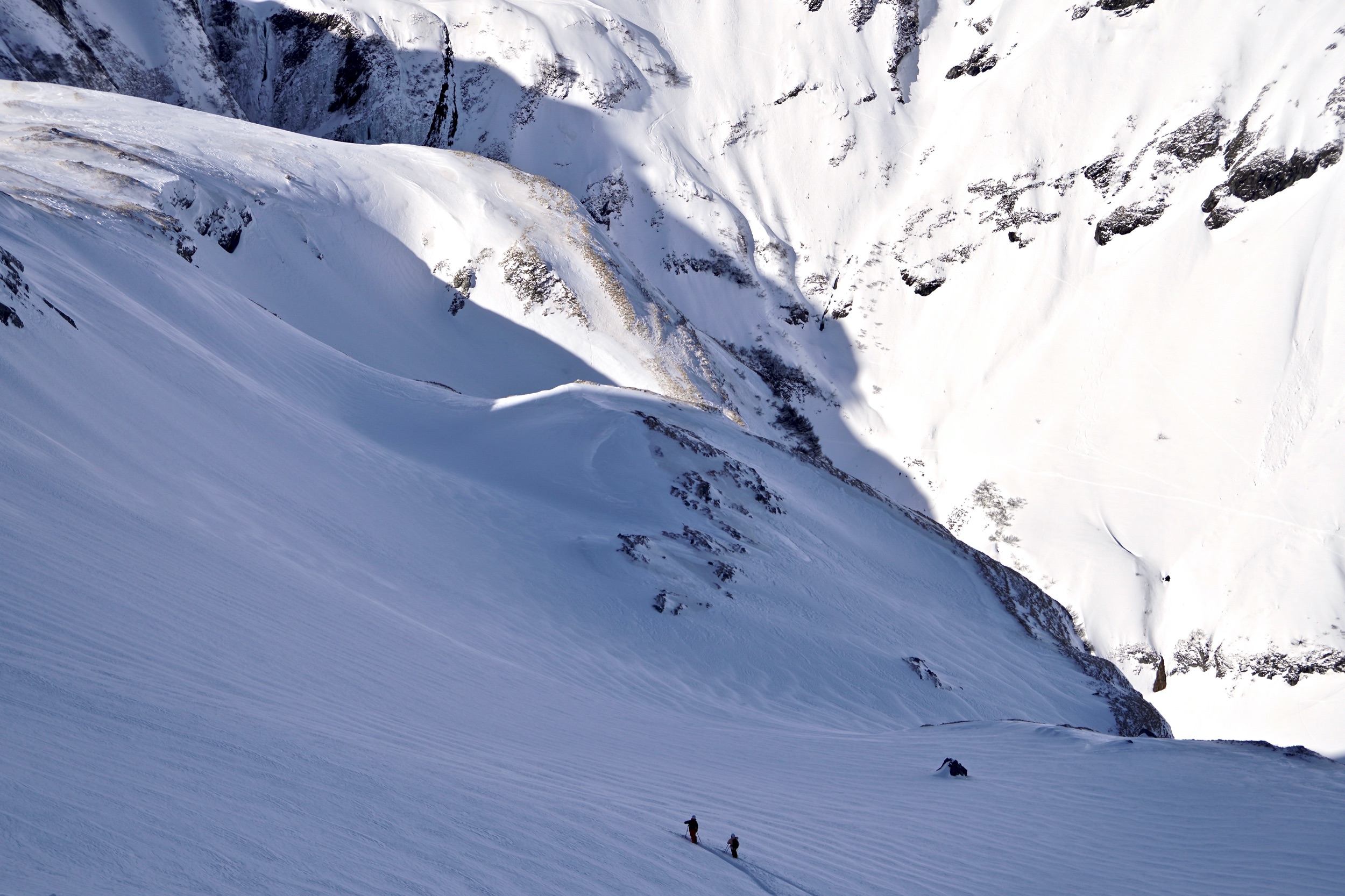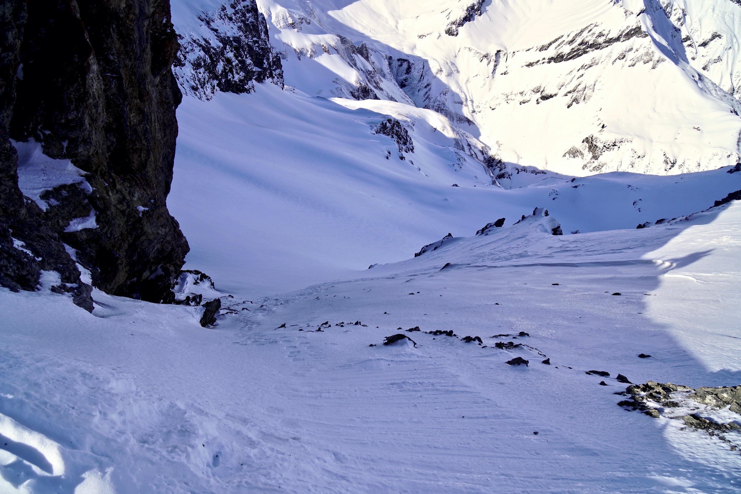 Das wars mit Aufstieg für heute. Ab jetzt geht es nur noch bergab. Unter uns lockt ein langes, breites und komplett unverspurtes Tiefschneefeld. Doch da müssen wir erstmal hinkommen. Der Einstieg schaut nicht sonderlich einladend aus. Marcel rutscht als Erster über die steile, vereiste Flanke hinunter – schlängelt sich an den vielen Steinen, die aus dem Eis spitzen vorbei. Er fragt mich, ob ich mich unwohl fühle und ich verneine. Ganz ehrlich bin ich nicht, schließlich habe ich immer noch Wilfried im Hinterkopf. Doch bei den ersten Schwüngen im Tiefschnee sind meine Bedenken schnell vergessen. Da ist es wieder, dieses Gefühl zu fliegen – für das man all die Strapazen und sogar die Gefahr in Kauf nimmt. Obwohl es heute recht warm war, ist der Schnee weich, fluffig und mühelos zu fahren, wie am ersten Tag nach dem Schneefall. Der schattige Nordhang mit den Felswänden im Hintergrund konserviert den Pulverschnee wie ein Kühlschrank.
