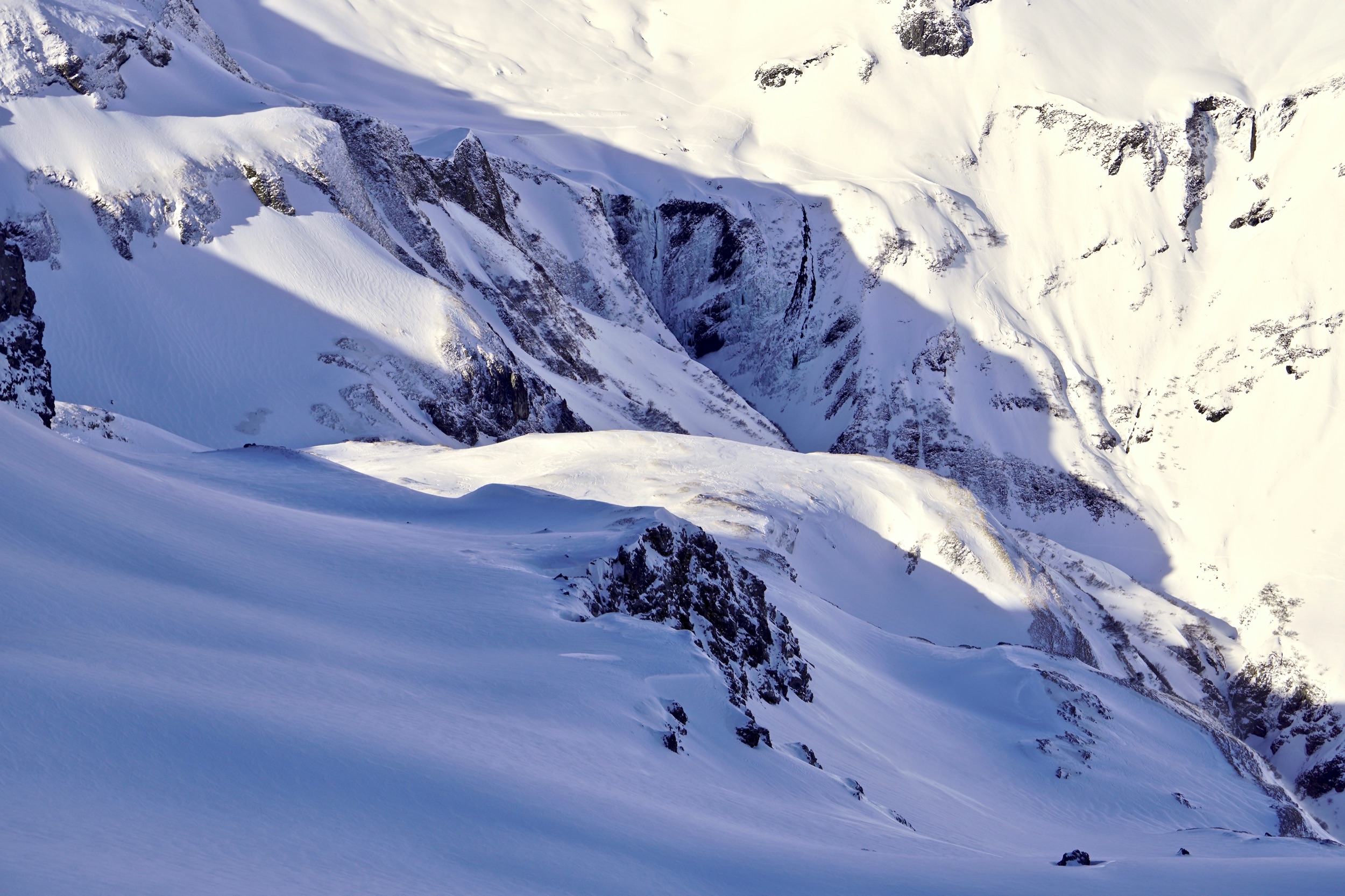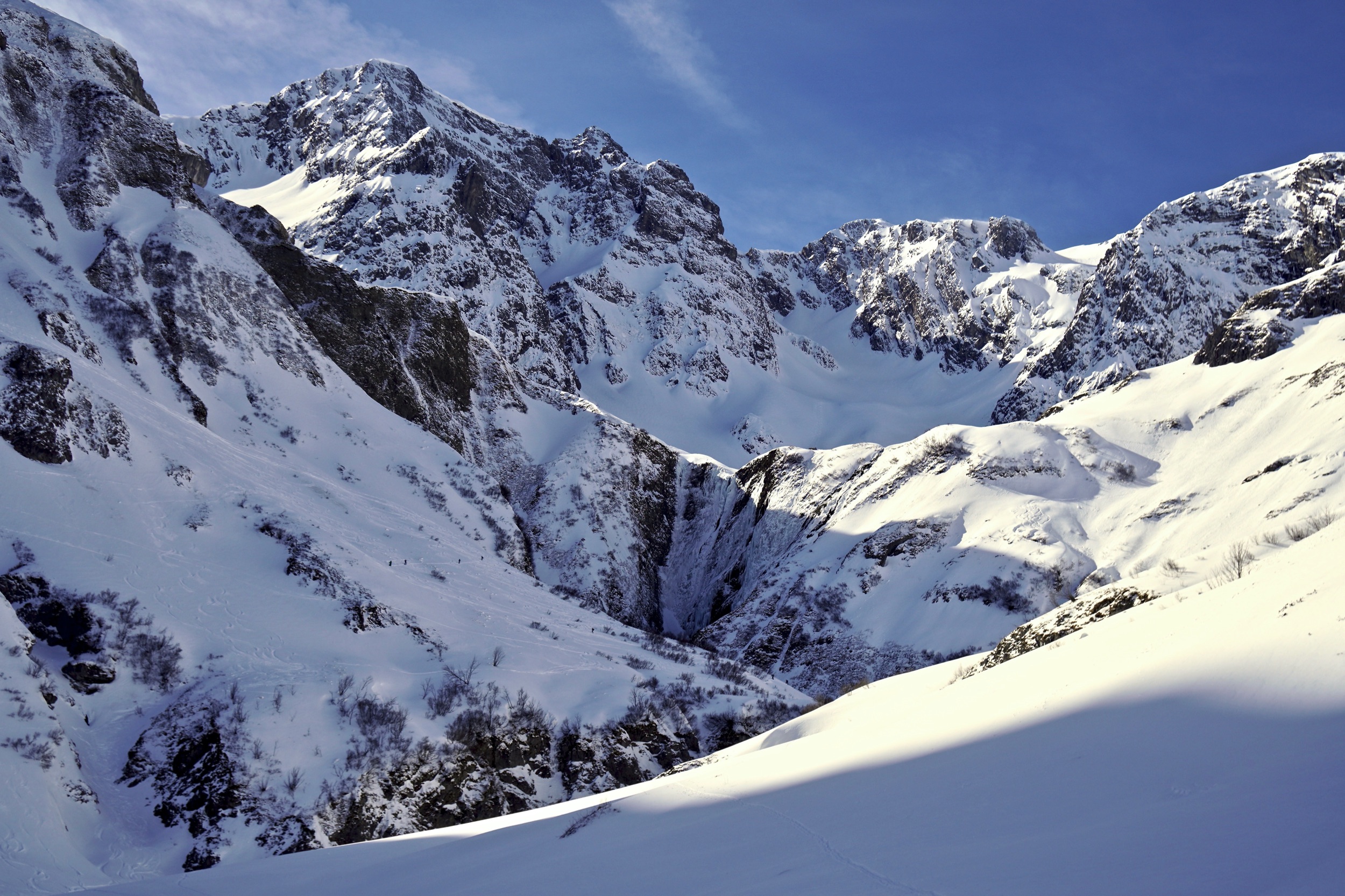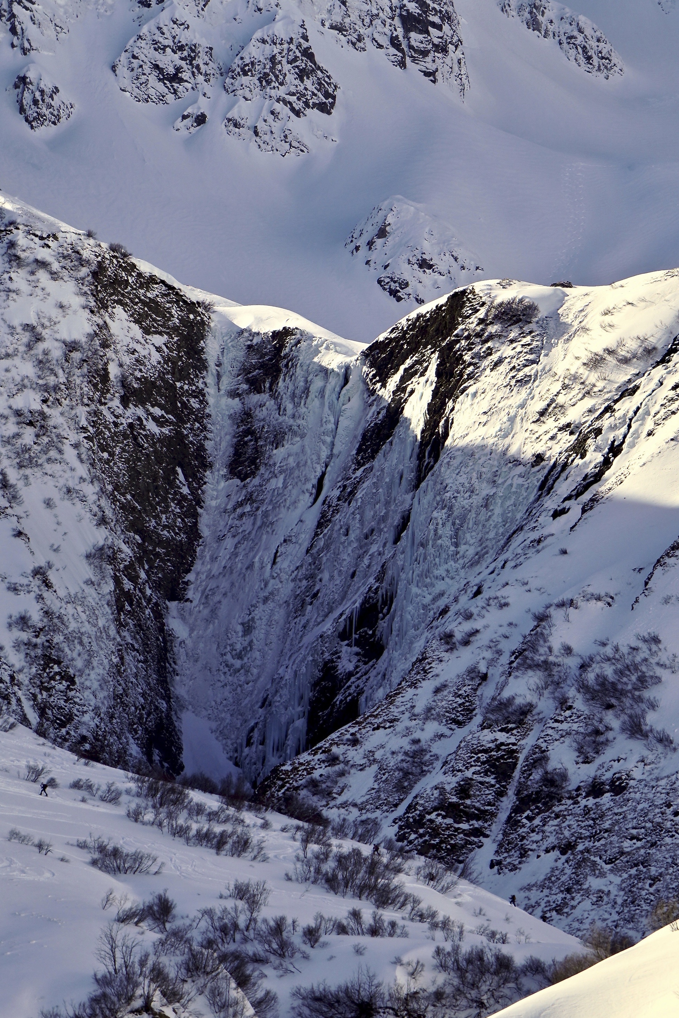 Als wir im Talboden angekommen über einen Bach steigen, kann ich nicht aufhören zurückzuschauen auf die steilen Hänge, die schattigen Wände, die schwarzen Felsen und eingefrorenen Wasserfälle. Hier ist weit und breit nichts zu sehen vom größten Skigebiet Österreichs. Von beheizten Sesselliften, Pistenbegrenzungen und Après Ski Gaudi. Nur wilde Natur, die einen ganz gern mal daran erinnert, dass sie hier die Chefin ist. Egal wie gut du dich auskennst, egal wie erfahren du bist. Momente, die mich an das große Ganze glauben lassen. Manche nennen es Gott. Ob es Pfarrer Müller 1894 wohl ähnlich ging?
