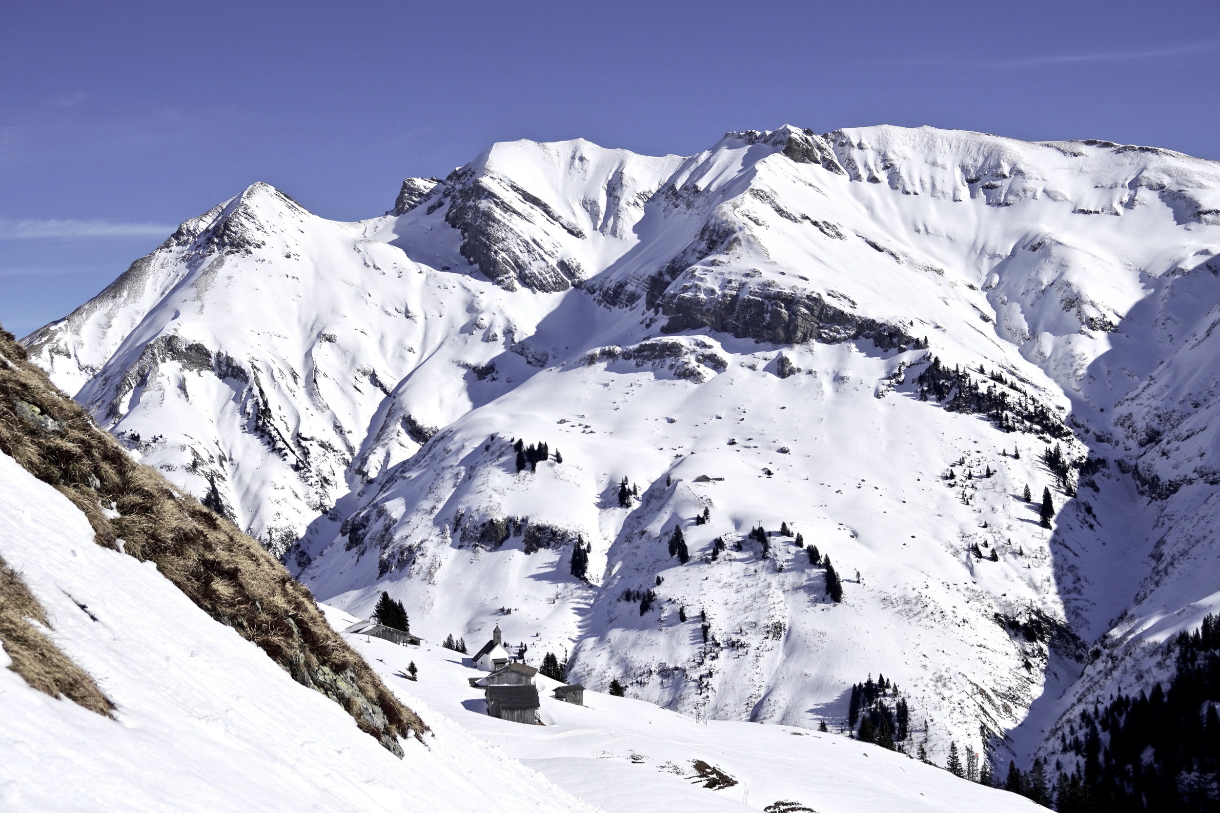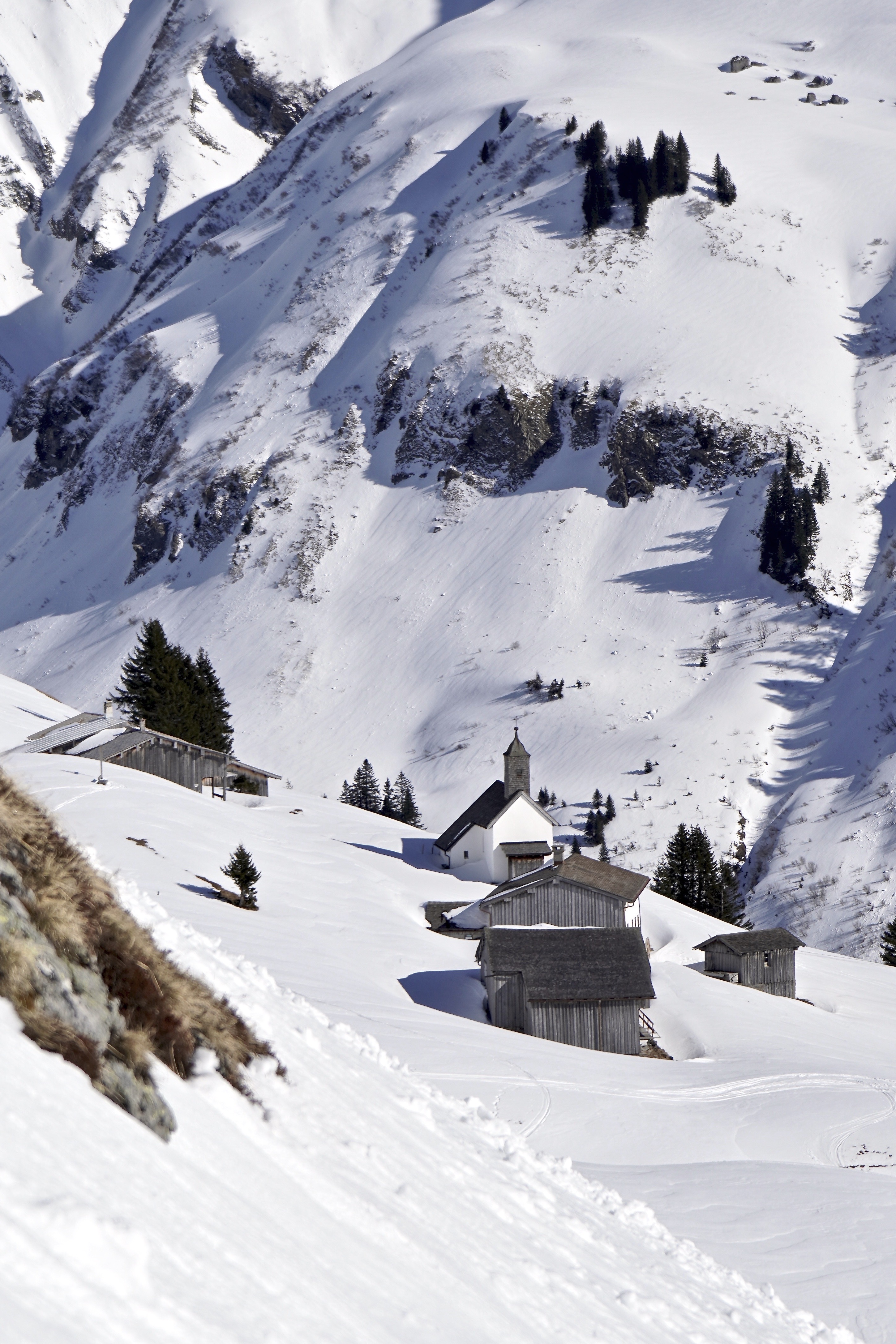 Vor 700 Jahren besiedelten Walser die Region am Tannbergpass. Sie führten ein karges und entbehrungsreiches Leben als Bergbauern und lebten von Viehzucht und Milchwirtschaft. Ihre Spuren sehen wir bei unserer ersten Gelände Abfahrt vom Wartherhorn Sattel Richtung Lech. Auf 1.719 Metern passieren wir die verlassene Siedlung Bürstegg. Der Name leitet sich ab vom alpinen Borstgras, das in den umliegenden Sumpfgebieten wuchs. Im Volksmund „Burst“ oder „Bürstl“ genannt. Da hier, ein gutes Stück über der Waldgrenze, kein Brennholz verfügbar war, wurde früher rings um Bürstegg Torf gestochen. Im 19. Jahrhundert lebten in der höchstgelegenen Walsersiedlung Vorarlbergs 13 Familien, heute kann ich im Vorbeifahren noch sechs Häuser zählen, von denen die meisten eher Ställen oder Scheunen gleichen – aber auch eine kleine Kirche. Pfarrer Müller ist auf seinen Touren hier auch vorbei gekommen. Nur hatte er keinen leichten, breiten Hightech-Ski mit Stahlkante und perfekt auf seine Füße angepasste Skischuhe.