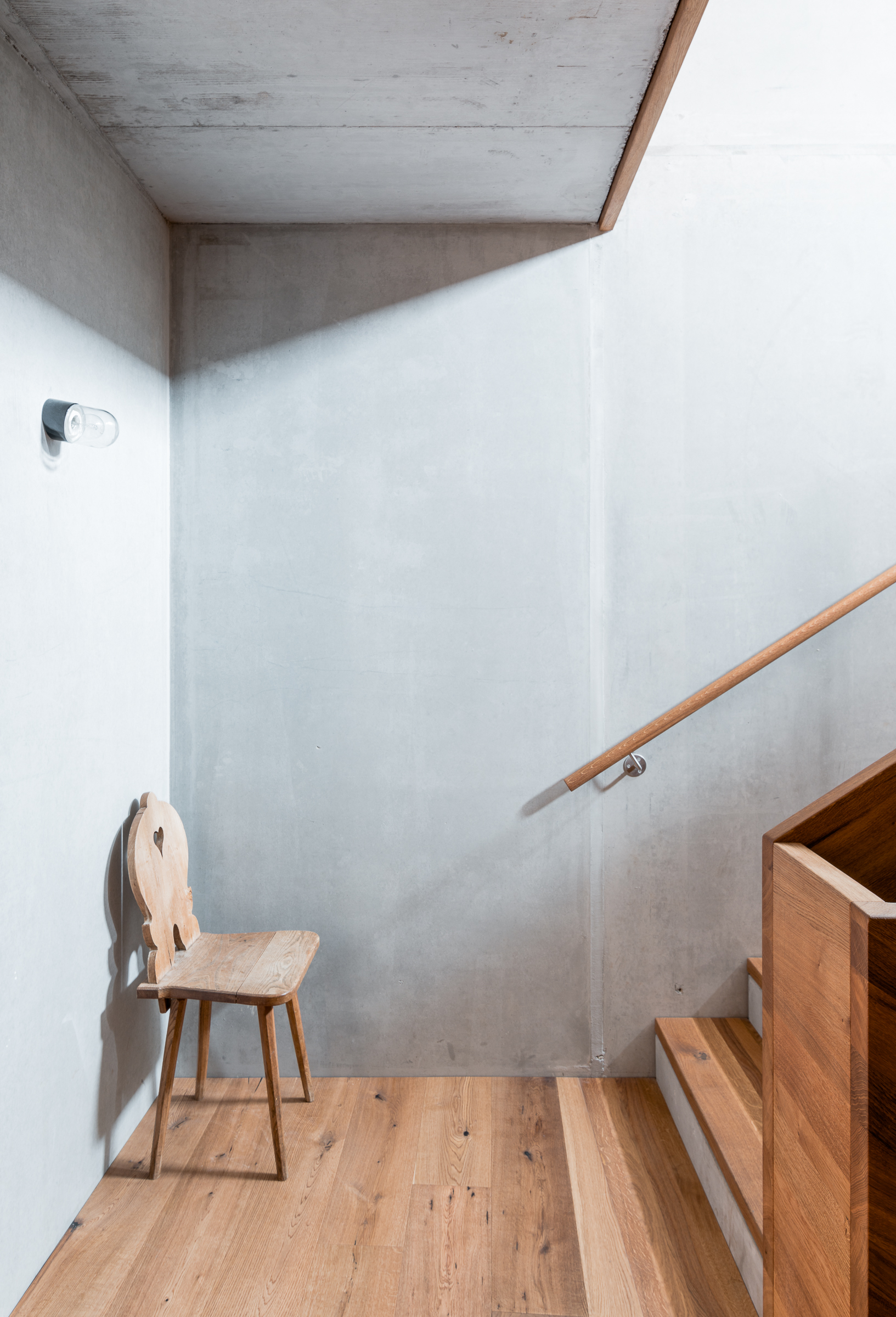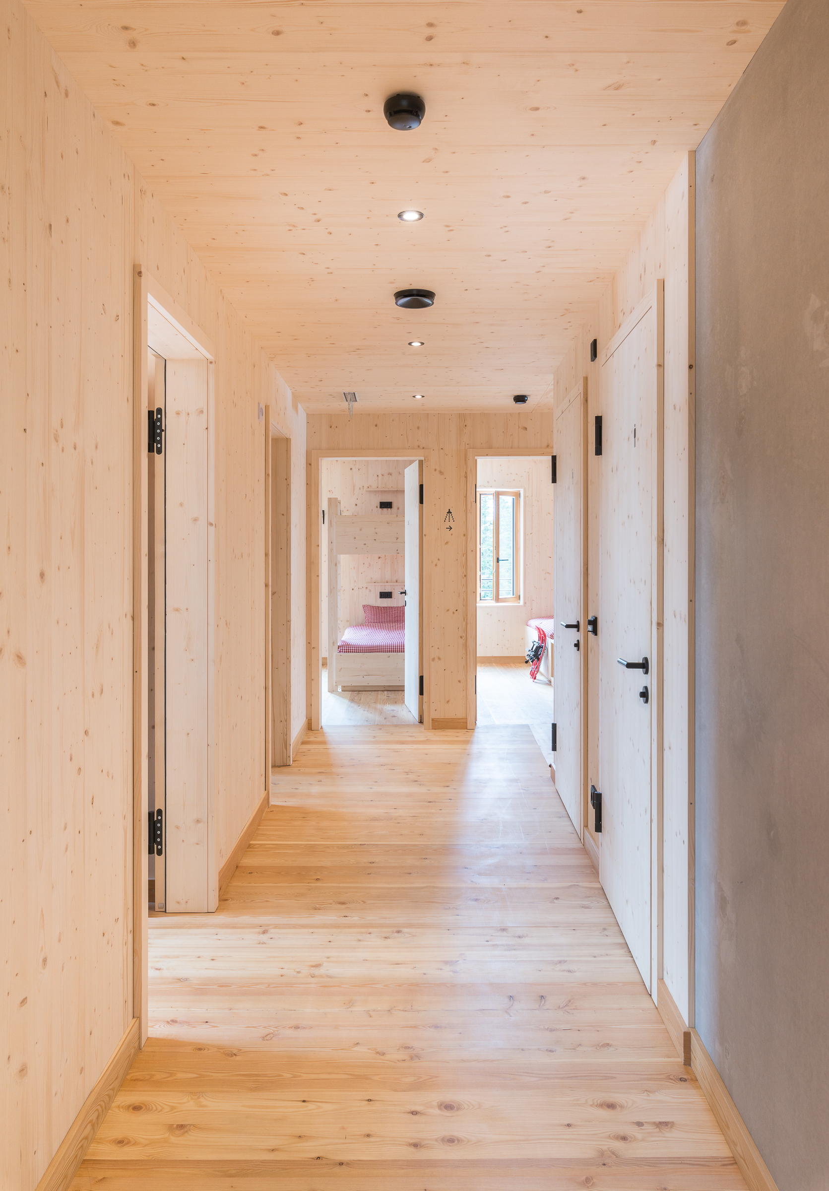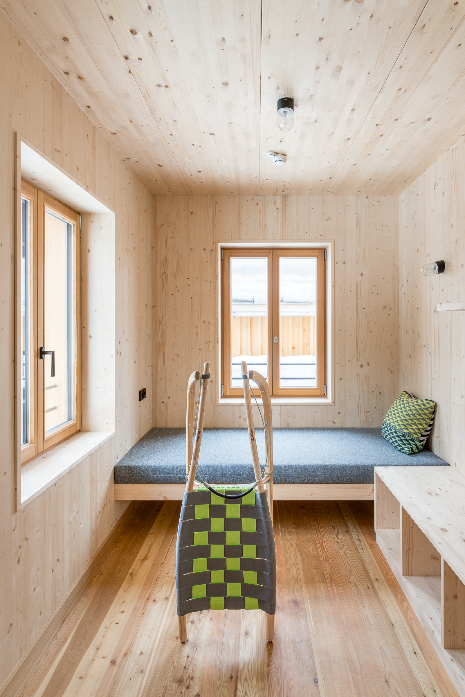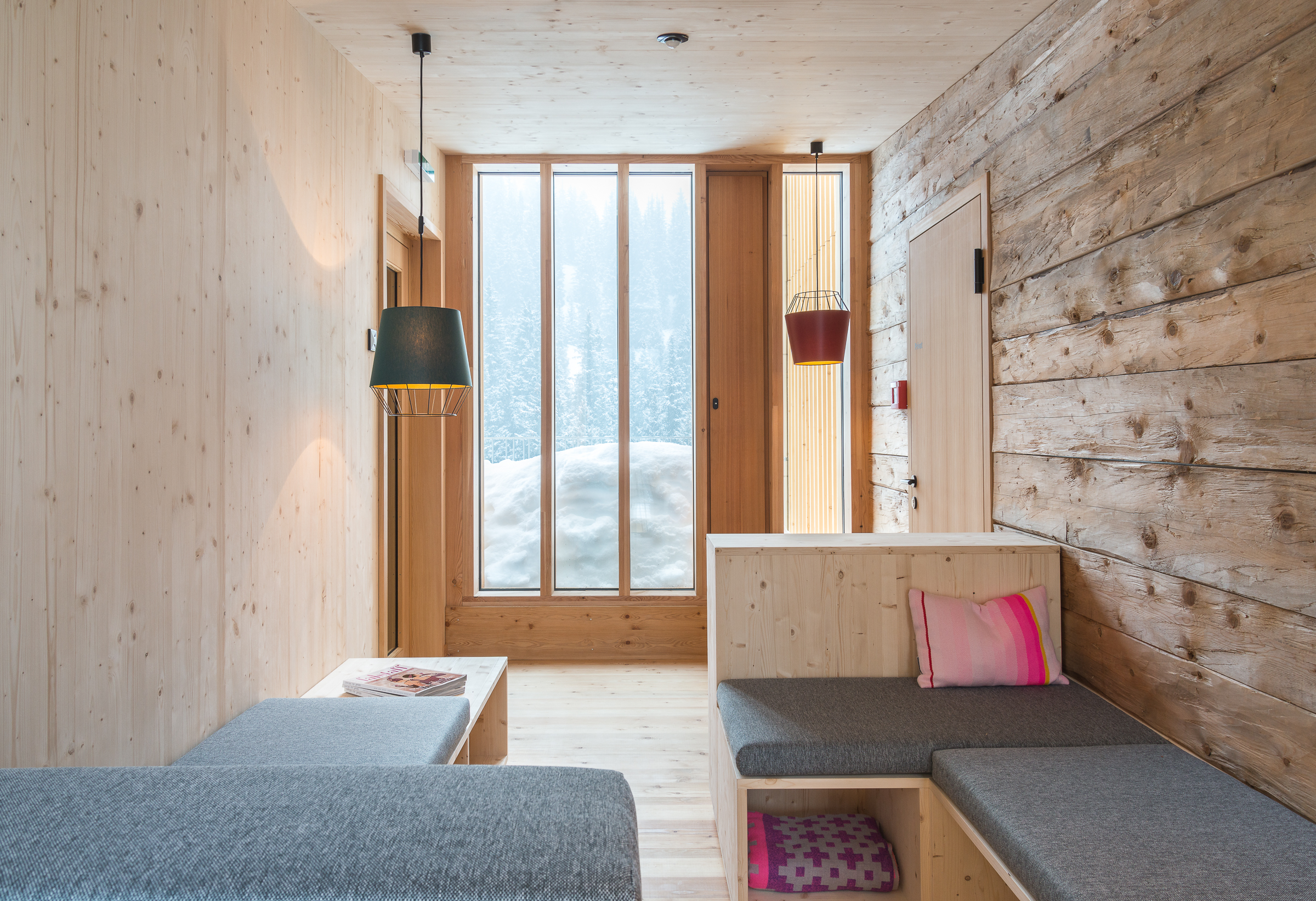 Die zentrale Idee des Entwurfs der beiden Architekten war, die Hütte zu ihrer ursprünglichen Anordnung in einzelne Baukörper zurückzuführen und diesen klare Funktionen zuzuordnen. Als Vorbild dienten für die Region typische Almdörfer mit mehreren Einzelbauten, wie sie auf der nahegelegenen Alpe Spora vorzufinden sind. Durch den Rückbau des alten, zusammengewachsenen Gebäudekomplexes und die Aufteilung in kleinere, klar gegliederte Einheiten, bildet die Hütte zusammen mit den anderen kleinen Nebengebäuden ein Hütten-Ensemble. So wurde zum Beispiel das neue Schlafhaus gedreht und vom Personalhaus abgekoppelt. Im Inneren empfängt einen eine helle, moderne Architektur aus Sichtbeton und Holz, die aufgeräumt schlicht, aber dennoch wohnlich wirkt und durch große Fenster immer wieder den Bezug nach Draußen herstellt. Die neu gestalteten Schlafräume sind zwar klein und kompakt, bieten aber dank Einbaumöbeln und guter Raumaufteilung genügend Platz. Optisch eine Bereicherung sind auch die hellen Waschräume, die man so nicht unbedingt auf einer Alpenvereinshütte erwarten würde. Ganzjährig zugänglich ist der Winterraum für maximal zwölf Personen, einschließlich voll ausgestatteter Küche, Toilette und einer separaten Duschgelegenheit im Sommer.