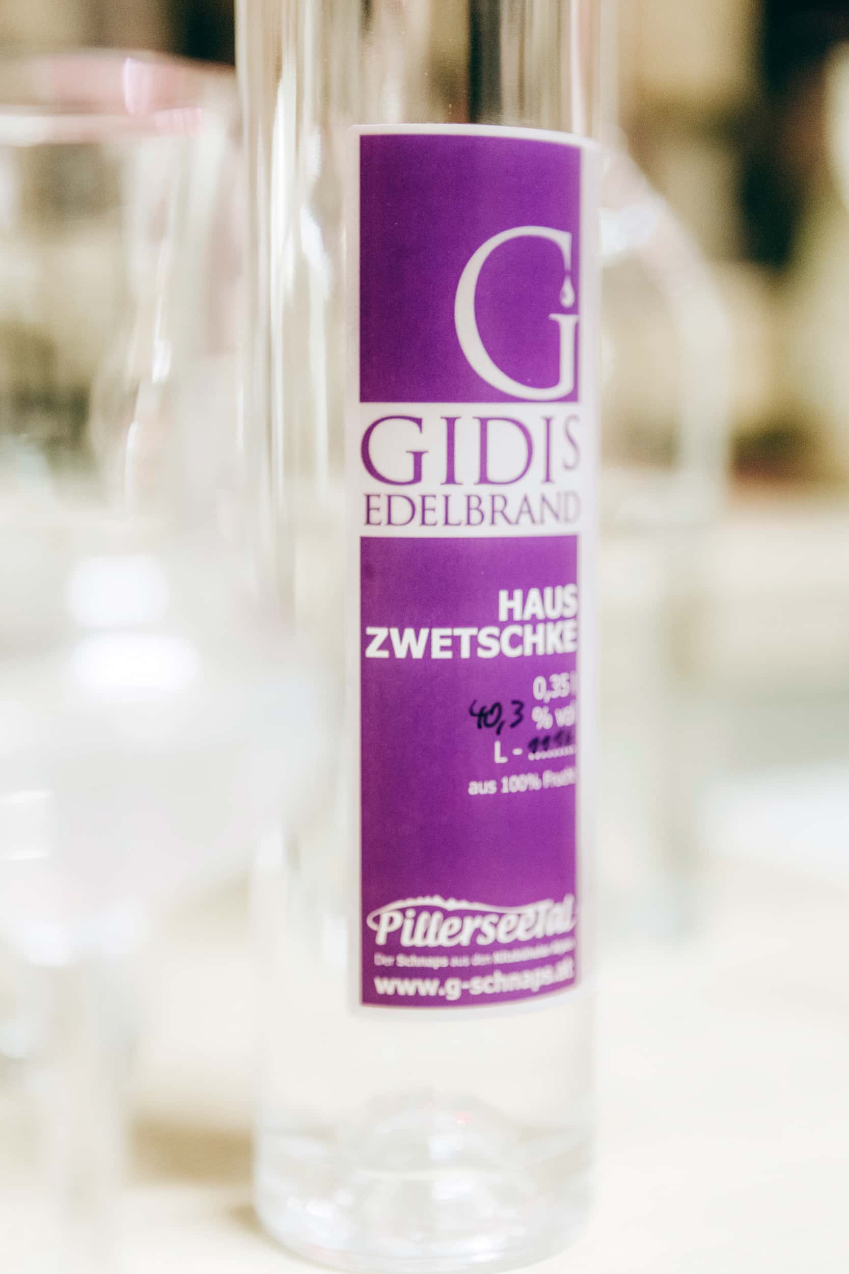 Wer ein breites Geschmackserlebnis bevorzugt, muss zum Brand, Edelbrand oder Wasser greifen. Diese bezeichnen immer hundertprozentige Fruchtdestillate und damit hohe Qualität. Beim Edelbrand oder auch Wasser wird die Frucht mit Hefe eingemaischt, zum Gären gebracht und anschließend destilliert. Der Alkohol und das Aroma entstehen also allein aus dem vergärbaren Fruchtzucker und der Frucht. Bis auf Wasser – bei Gidi Treffer reines Bergquellwasser – wird einem Edelbrand keine weitere Zutat mehr hinzugefügt, freilich auch keine Farbstoffe und kein Zucker. Die Trinkstärke beträgt mindestens 37,5 Prozent, die meisten Obstbrände haben um die 40 Porzent. Ein Edelbrand oder echtes Fruchtdestillat steht laut Gidi im Gasthaus nicht für unter drei Euro auf der Karte, außer der Wirt ist selbst Brenner. Das Aroma eines Brands lässt sich auch mehrere Stunden nach dem schnapseln noch am Gaumen spüren und wenn man das das Glas stehen lässt, erkennt man noch nach Tagen, welcher Schnaps daraus getrunken wurde.