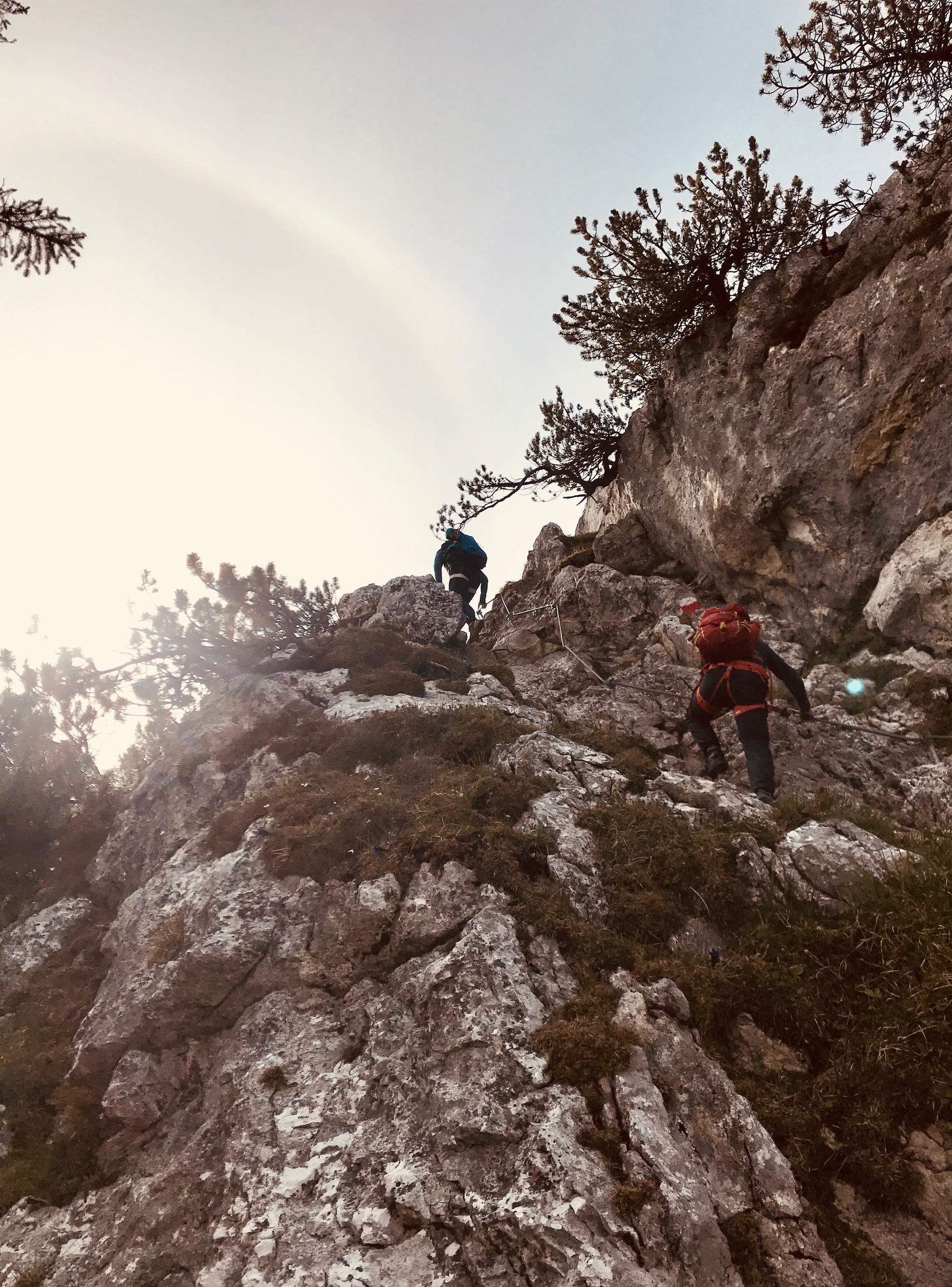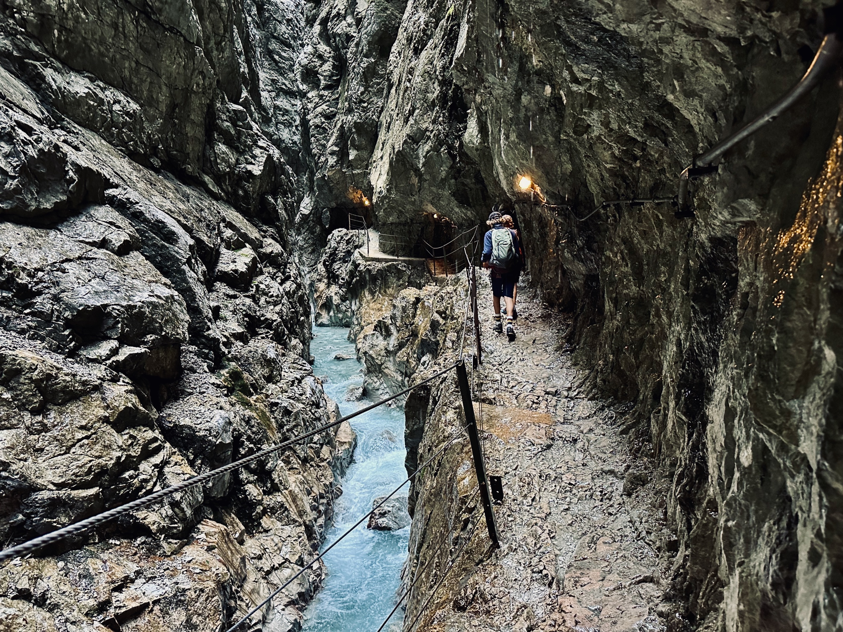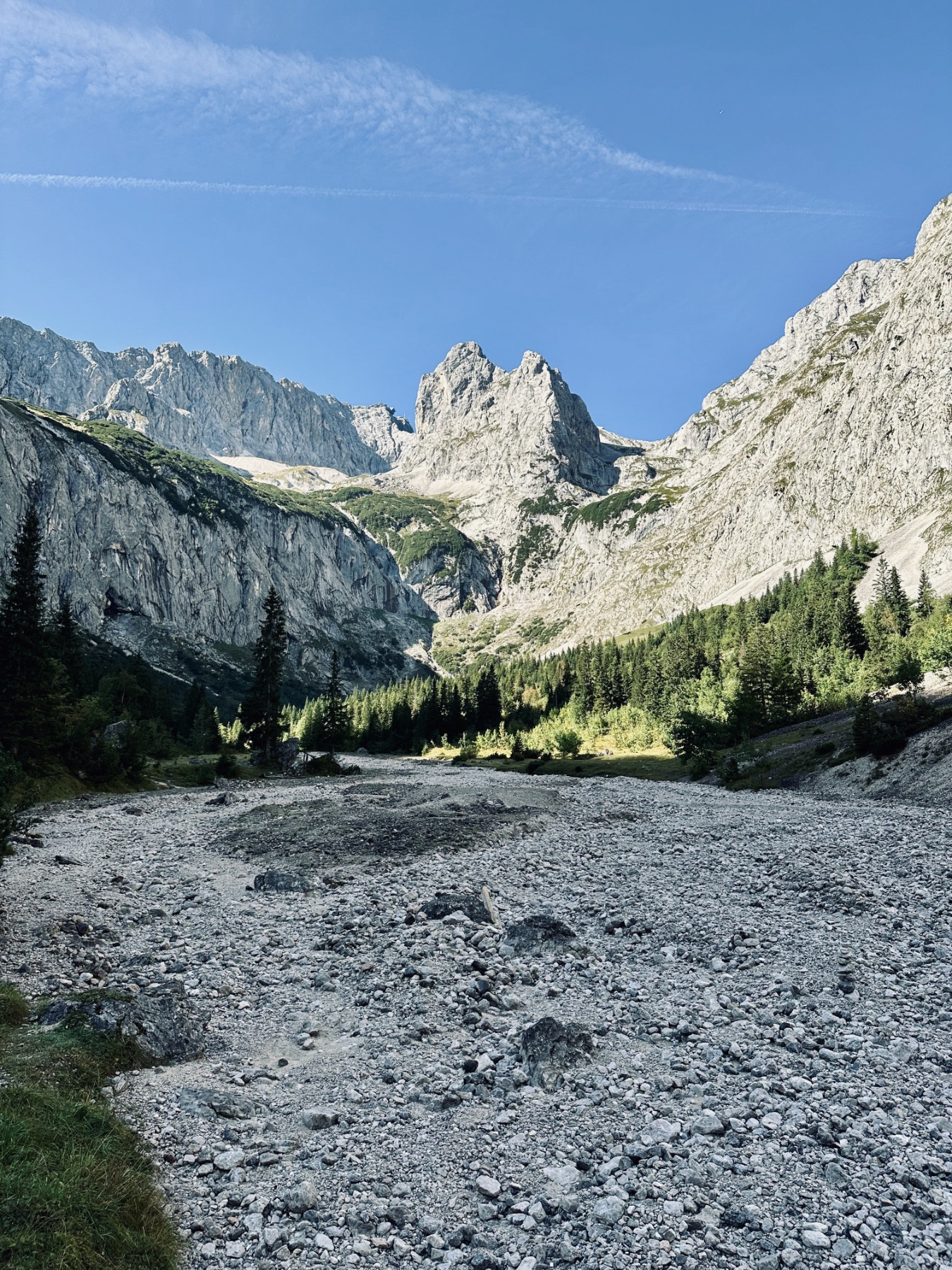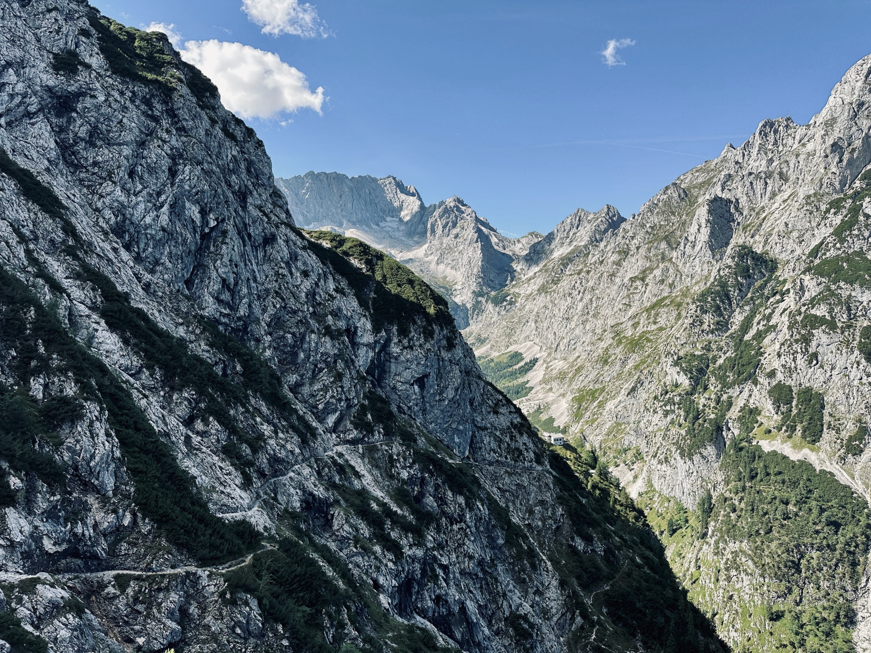 Diese Rundwanderung hinein ins Herz des Wettersteingebirges zählt landschaftlich zu den absoluten Highlights rund um Garmisch. So führt über das Höllental eine der meist begangenen Aufstiegsrouten auf die Zugspitze und die spektakuläre Strecke durch die enge Höllental Klamm bis zur Höllentalanger Hütte ist bei Wanderfreund:innen ziemlich beliebt und entsprechend stark frequentiert. Deshalb lohnt es sich früh dran zu sein. Am Klamm-Ausgang öffnet sich langsam das enge Tal und Deutschlands höchster Berg rückt in der Ferne ins Blickfeld. Nach rund 600 Höhenmetern und sechs Kilometern erreicht man die moderne Höllentalanger Hütte, an der man sich links Richtung Knappenhäuser und Hupfleitenjoch orientiert. Über einen schmalen Steig, der teilweise Stahlseil versichert ist, wandert man jetzt wieder talauswärts. Im Rücken einen fantastischen Blick ins Höllental und das Zugspitzmassiv. Nach weiteren 400 Höhenmetern erreicht man den höchsten Punkt der Tour, das 1.750 Meter hoch gelegene Hupfleitenjoch. Von hier sind es nochmals knapp zwei Kilometer leicht bergab bis zum Kreuzeck Haus (1.652 m), wo es nicht nur leckere Essen gibt, sondern auch die Möglichkeit auf Abkürzung der Tour. Für 21,50 Euro kann man mit der Kreuzeckbahn gen Tal schweben und sich die noch bevorstehenden 900 Tiefenmeter über den Jägersteig zurück nach Hammersbach ersparen.