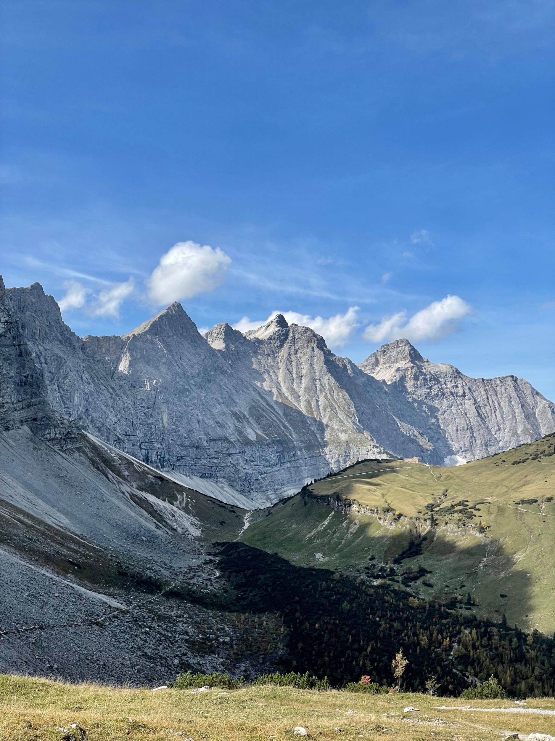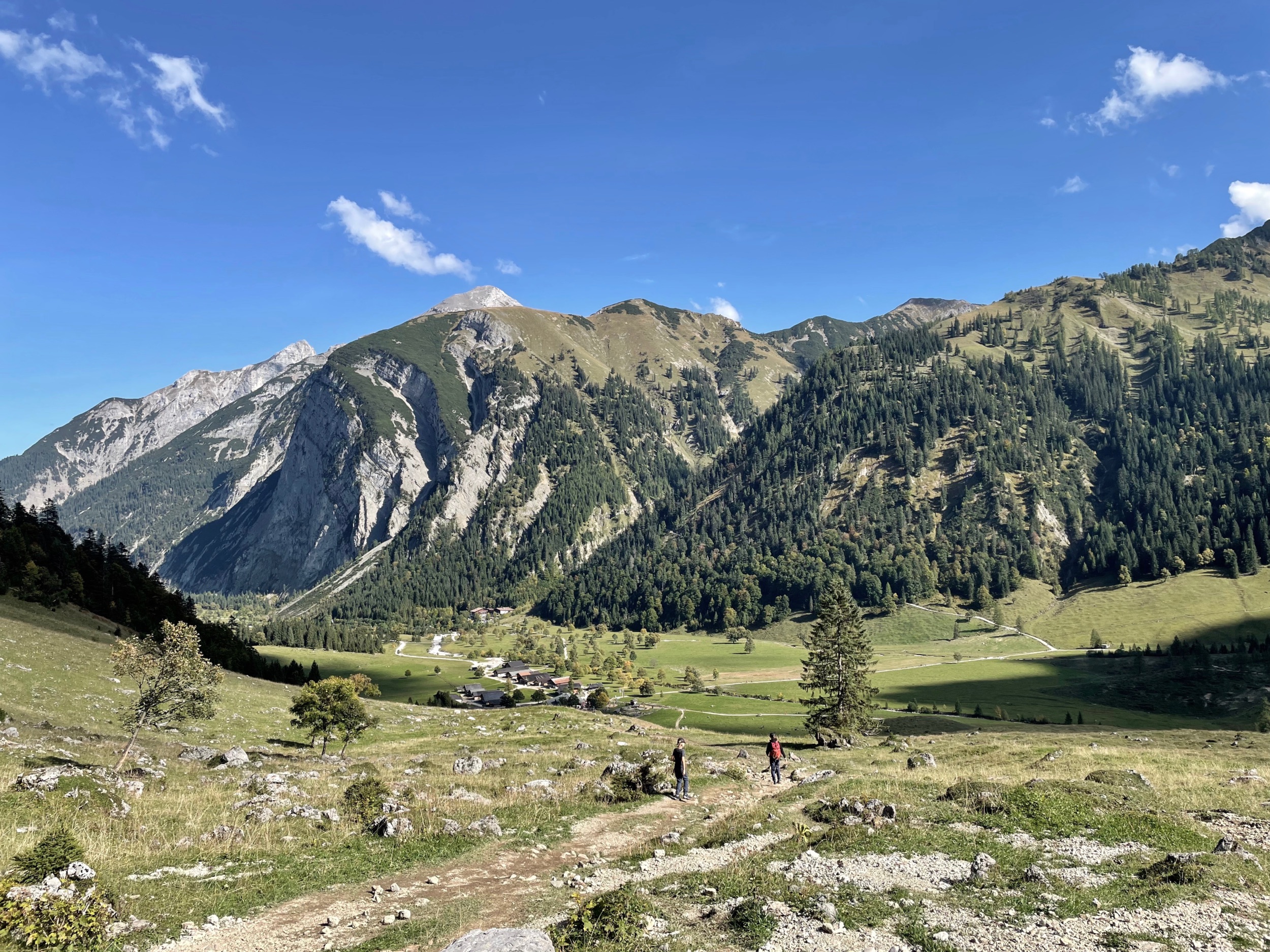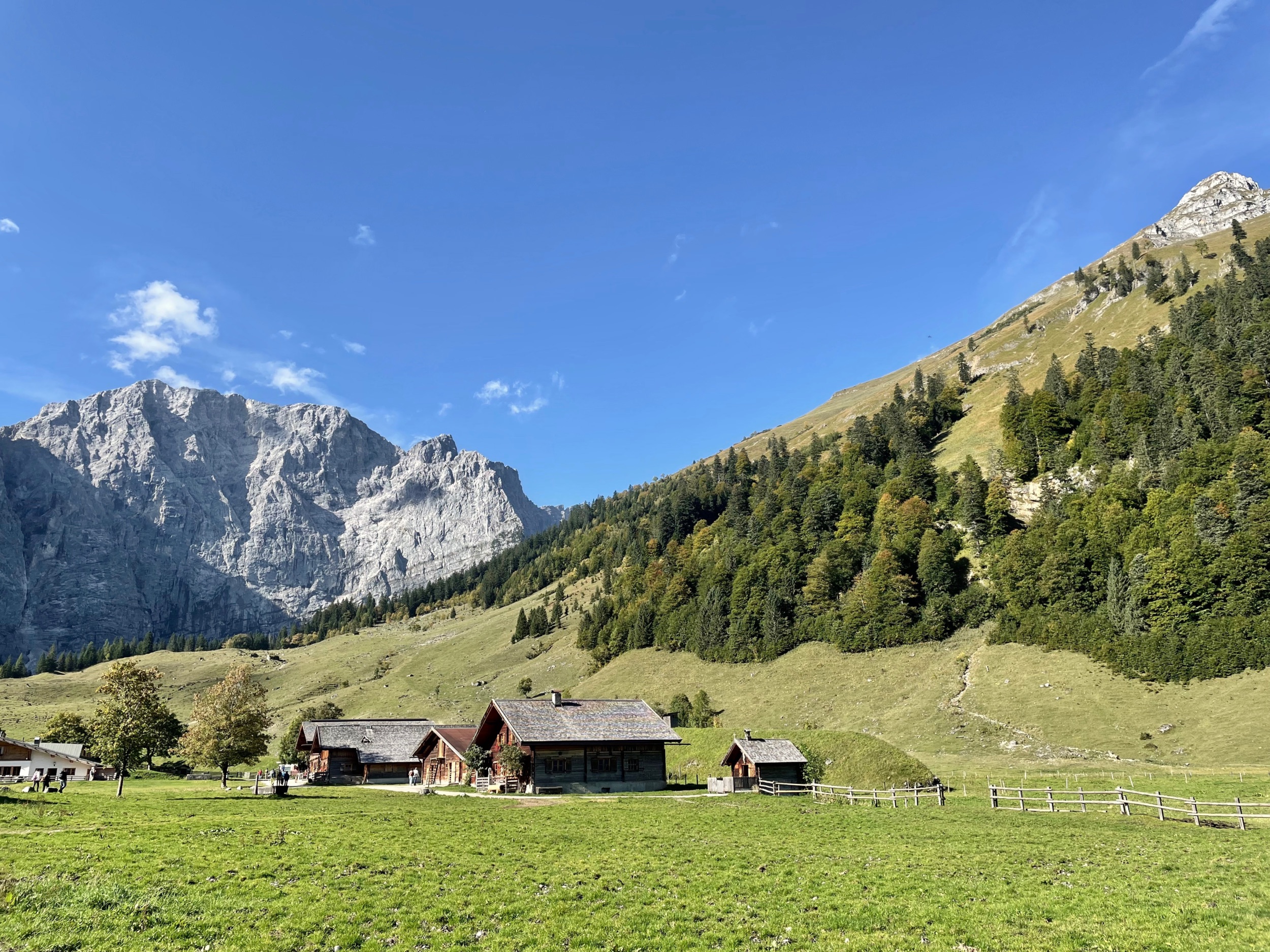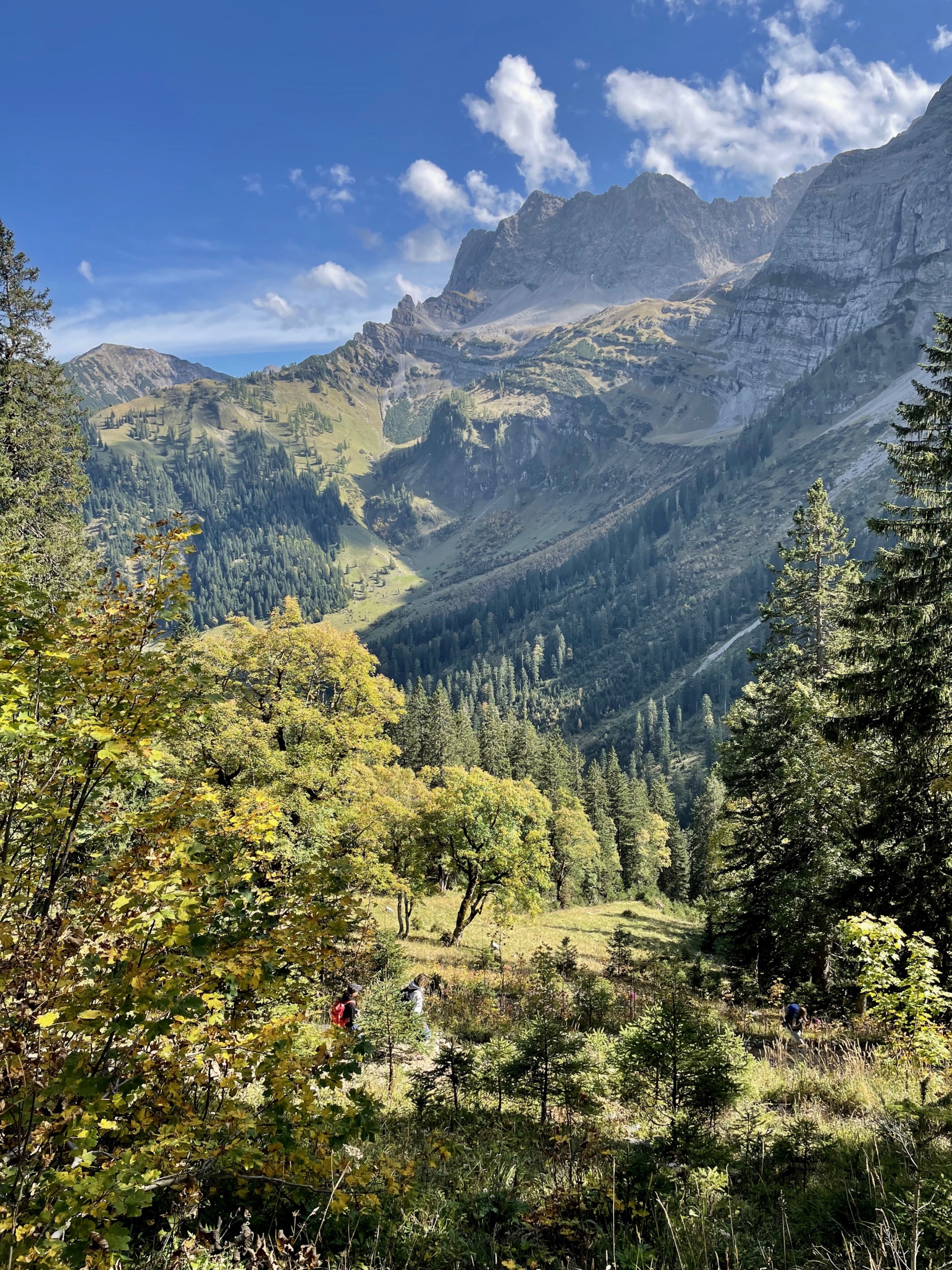 Der große Ahornboden im Karwendel ist DER Place to be im Herbst. Dementsprechend touristisch geht es dort leider an schönen Tagen zu. Die rund 2.000 goldgelb bis rot gefärbten, zum Teil 600 Jahre alten Ahornbäume vor beeindruckender Karwendelkulisse sollte man sich dennoch auf keinen Fall entgehen lassen. Nicht umsonst steht der Große Ahornboden seit 1972 als Naturdenkmal unter besonderem Schutz und wurde von den Tirolern sogar zum schönsten Platz in ganz Tirol gewählt. Die volle Dröhnung Herbstkitsch verspricht die kurze Wanderung zur Binsalm über den Panoramaweg, von dem man auf den Ahornboden hinab blicken kann. Am Ende des Almdorfes Eng starten die Wanderwege zu den Hütten oberhalb des Ahornbodens. Links beginnt der Wanderweg in Richtung Binsalm und Lamsenjochhütte. Auf ihm verlasst ihr die Engalm. Zuerst wandert ihr in der Ebene, dann zweigt rechts der Panoramaweg ab, der euch in einer kleinen Runde in rund 40 Minuten zur Binsalm (1.500 m) bringt. Wer noch weitere zwei Stunden Zeit mitbringt, kann hinauf wandern auf den 2.080 Meter hohen Hahnkampl oder gar die Überschreitung über das Lamsenjoch zur Lamsenjochhütte und über einen leichten Klettersteig auf die Lamsenspitze (2.508 m) wagen. Dann solltet ihr allerdings gute sechs Stunden kalkulieren, bis ihr zurück am Parkplatz seid. Landschaftlich nicht weniger reizvoll ist die Tour hinüber zur Falkenhütte über das Hohljoch. Hin und zurück sind es rund fünf Stunden Marsch über einfache Wege und Steige.