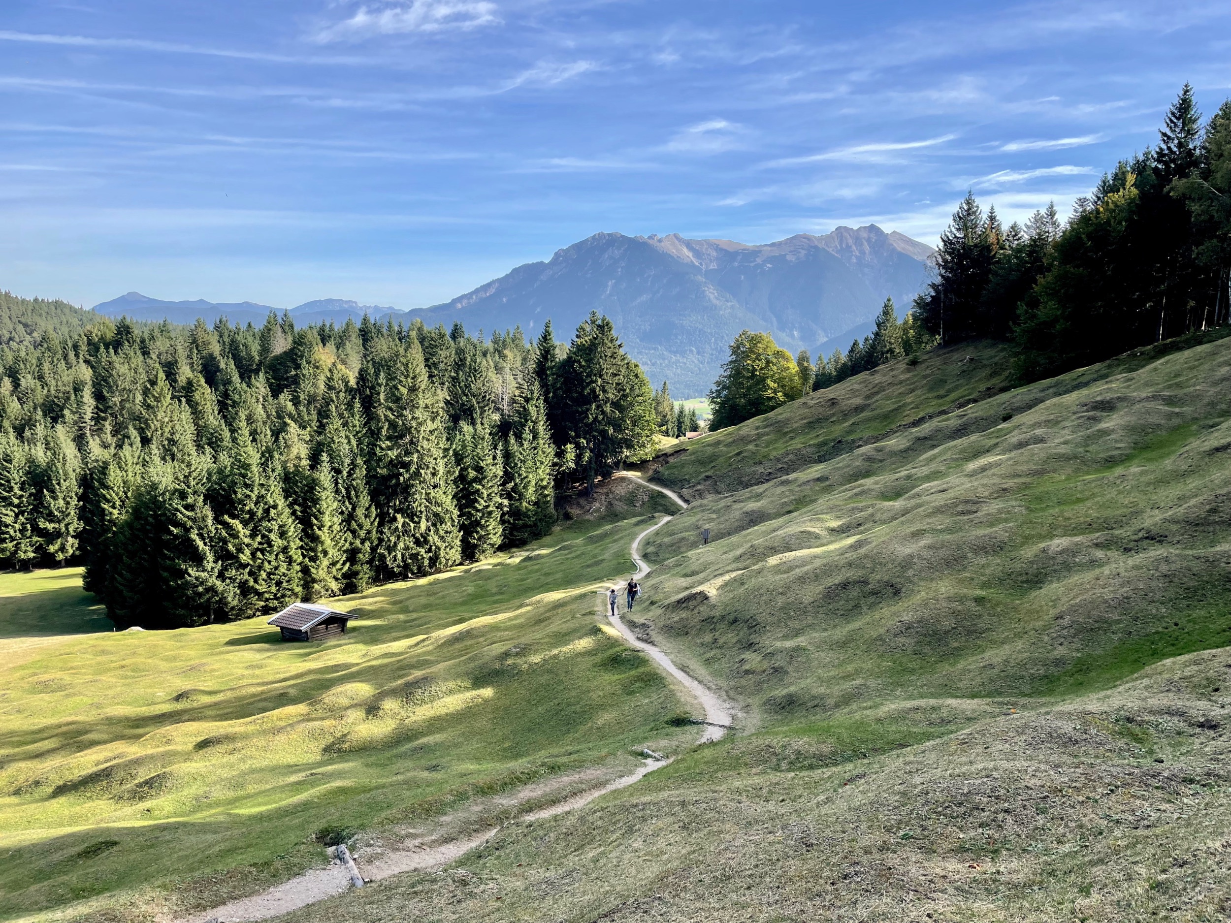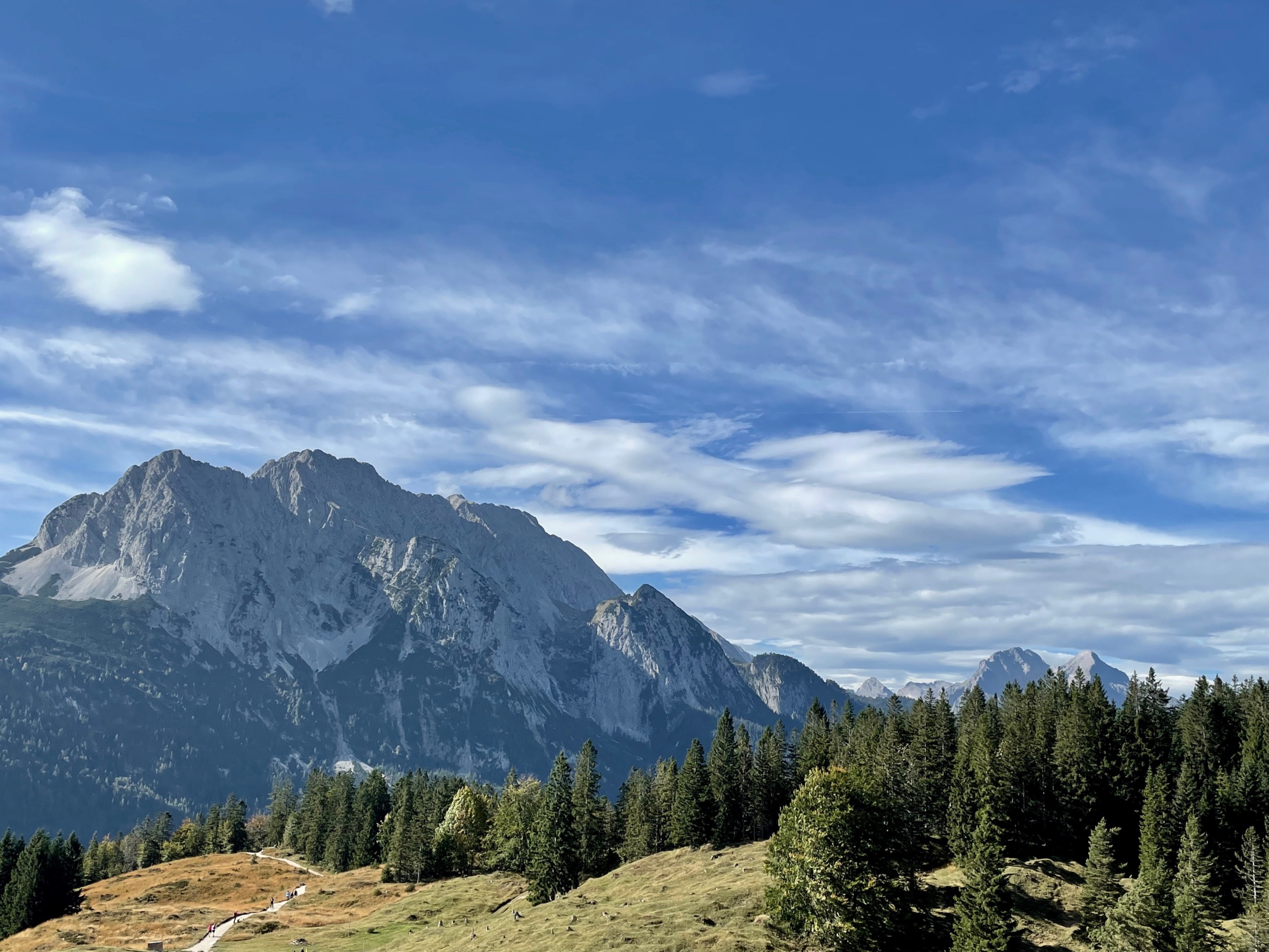 Los geht’s am Parkplatz des kleinen Skigebiets am Luttensee, zu Füßen des Hohen Kranzbergs (1.391 Meter). Alternativ kann man auch direkt vom Bahnhof in Mittenwald starten. Man folgt ein kurzes Stück der Teerstraße in Richtung Luttensee Kaserne und zweigt nach rund 300 Metern links auf einen kleinen Pfad in den Wald ab, der uns direkt zum idyllisch gelegenen Luttensee führt. Von dort zieht der Weg stetig bergauf durch den Wald und über offenes Wiesengelände bis man auf eine kleine Teerstraße zum Wildensee trifft. Dieser folgt man kurz bis man die kleine Gipfelhütte direkt vor sich sieht. Von jetzt geht es mehr oder weniger in der Direttissima durchs Skigebiet hinauf zum Kranzberg, wo man mit einem sagenhaften 360 Grad Panorama belohnt wird: Von der Benewand über den Jochberg, Herzogstand und Heimgarten im Norden, über den Simetsberg und das Estergebirge im Westen, das Wettersteinmassiv mit der markanten Alpspitze im Süden bis hin zum Karwendel im Osten.